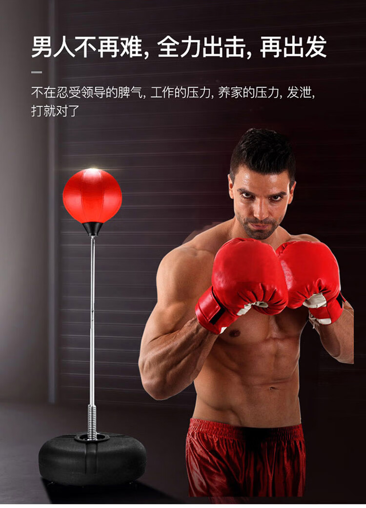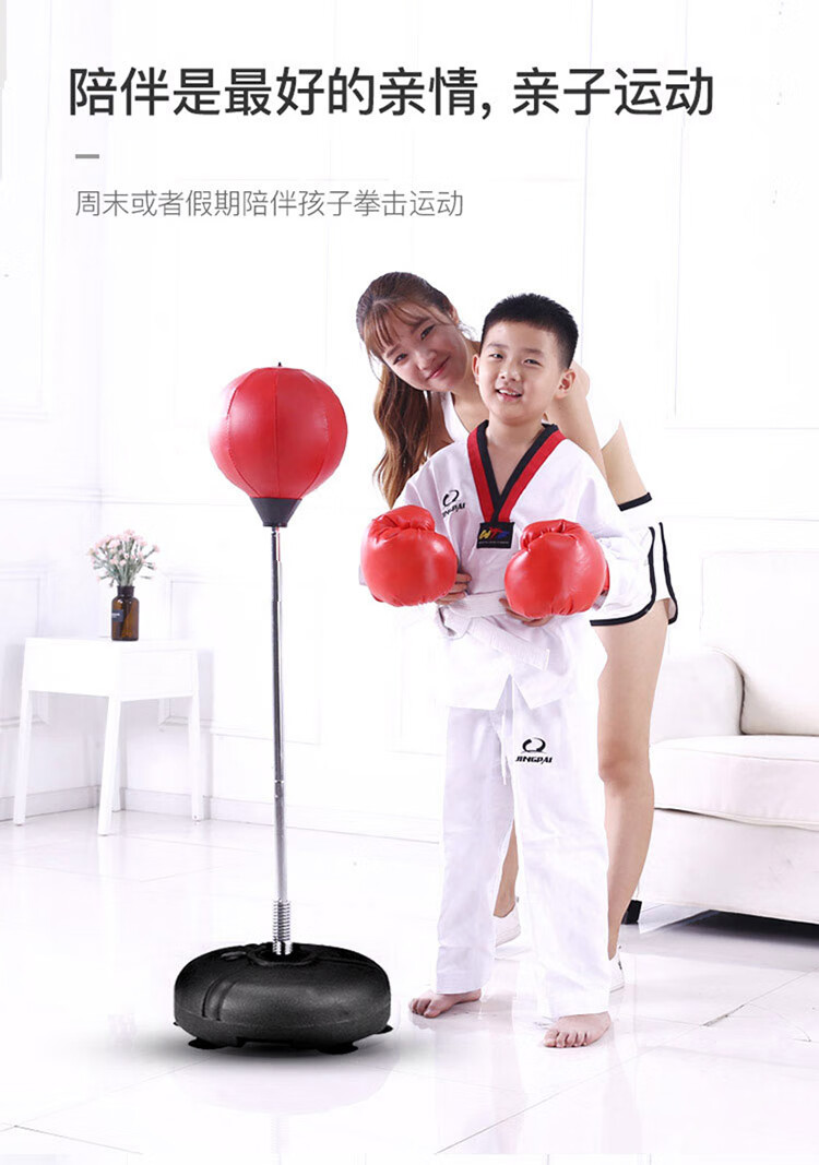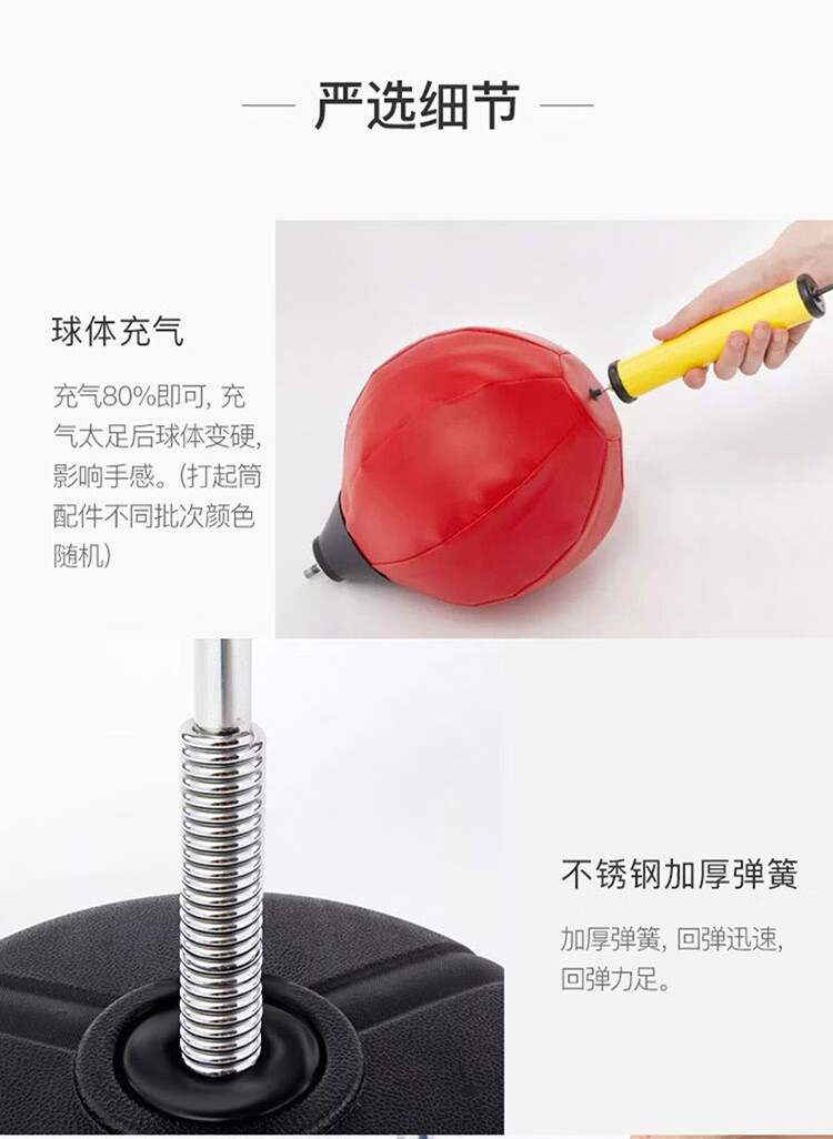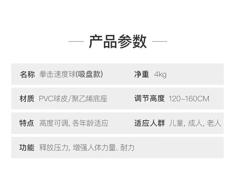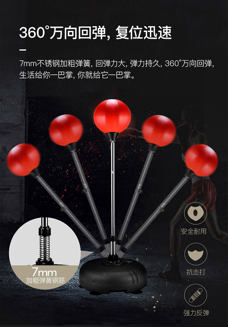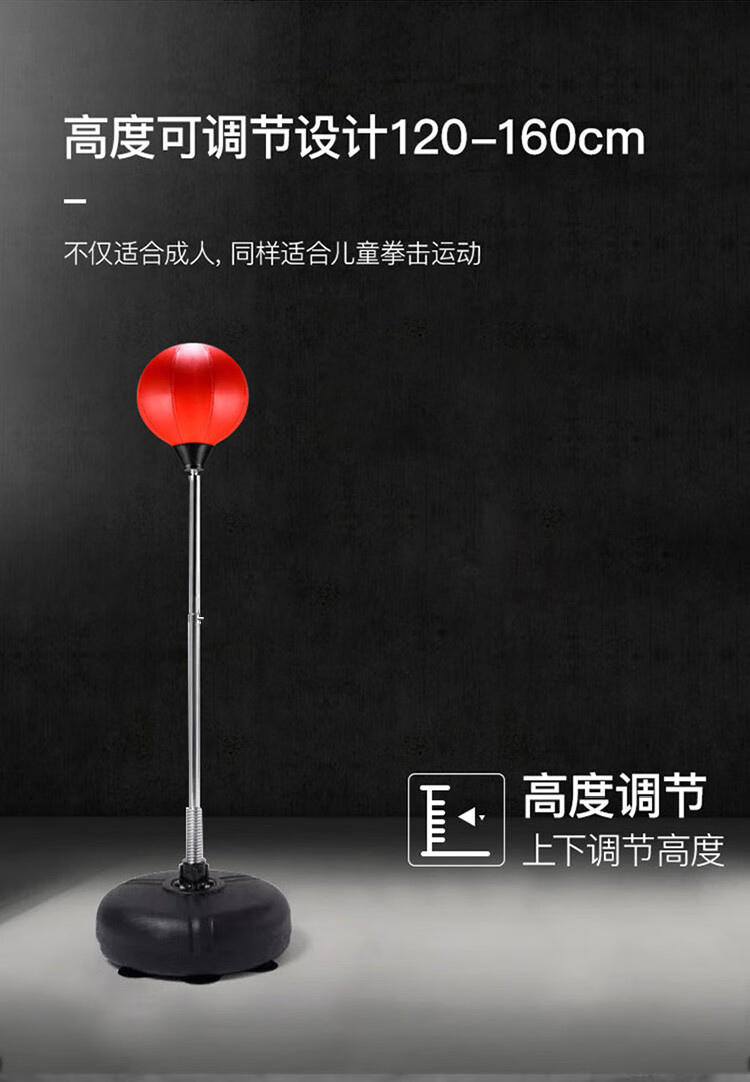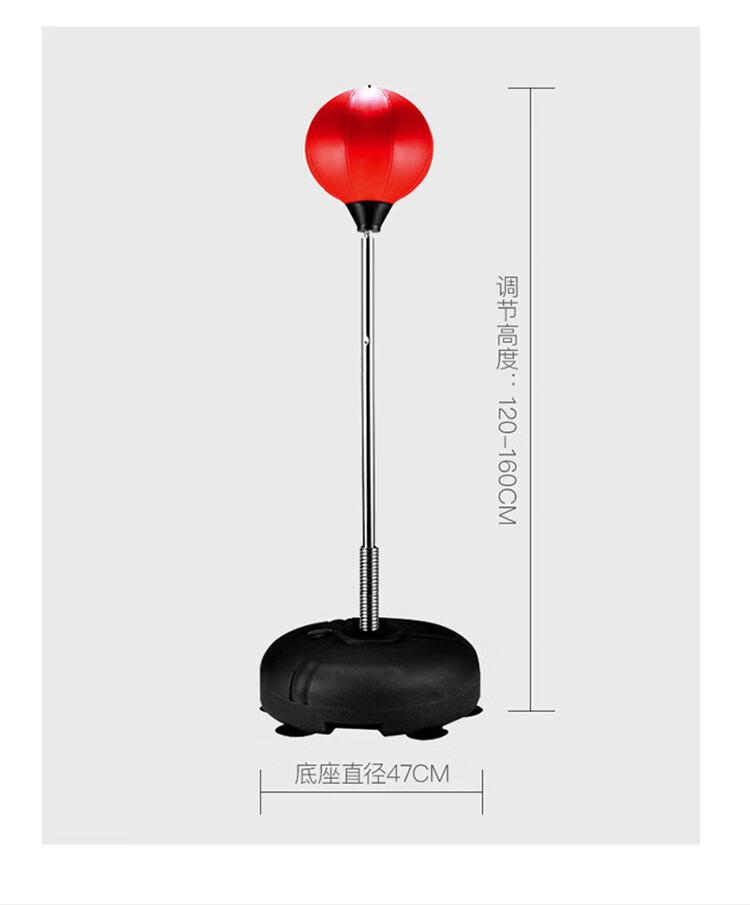 材质: PVC球皮/聚乙烯底座 调节:高度120-160CM 特点:高度可调,各年龄适应 适应人群:儿童、成人、老人 功能释放压力:增强人体力量、耐力 商品毛重:4.4kg 解压运动亲子健身 , 每天运动30分钟 ,充气高弹球胆, 手感“软实弹” 360度万向回弹,复位迅速,高度可自由调节。不锈钢加厚弹簧,底盘注水底部加固吸盘,锻炼孩子的专注力,主动出击,减压发泄 亲子娱乐,燃烧卡路里。