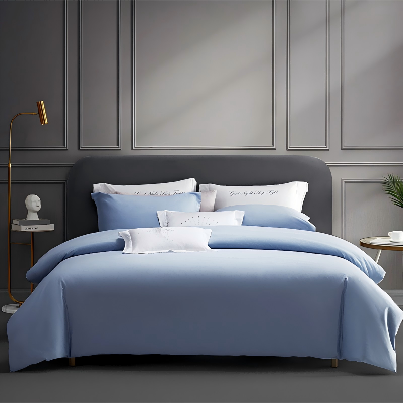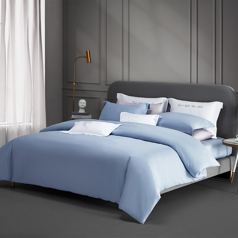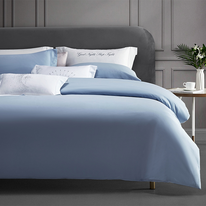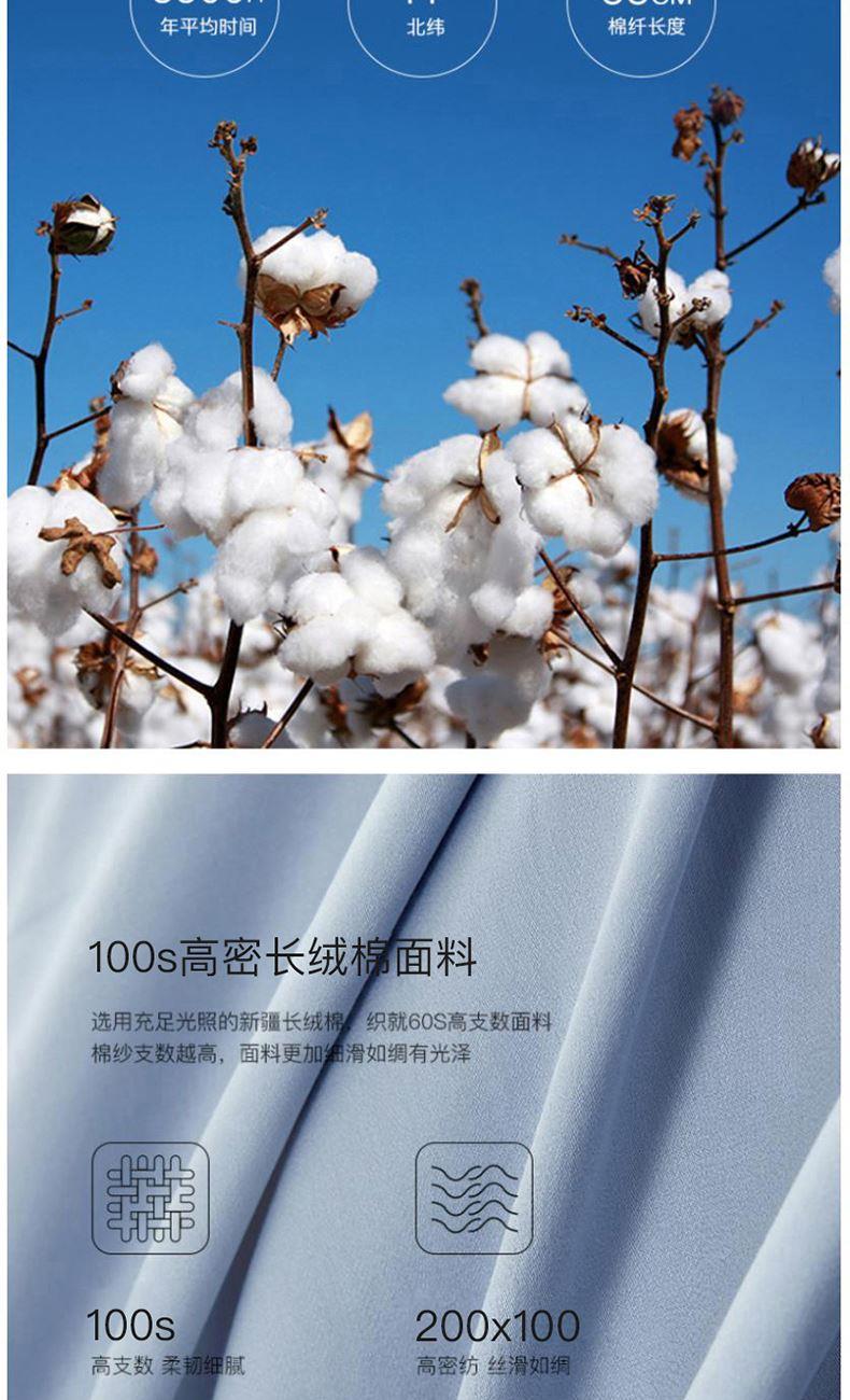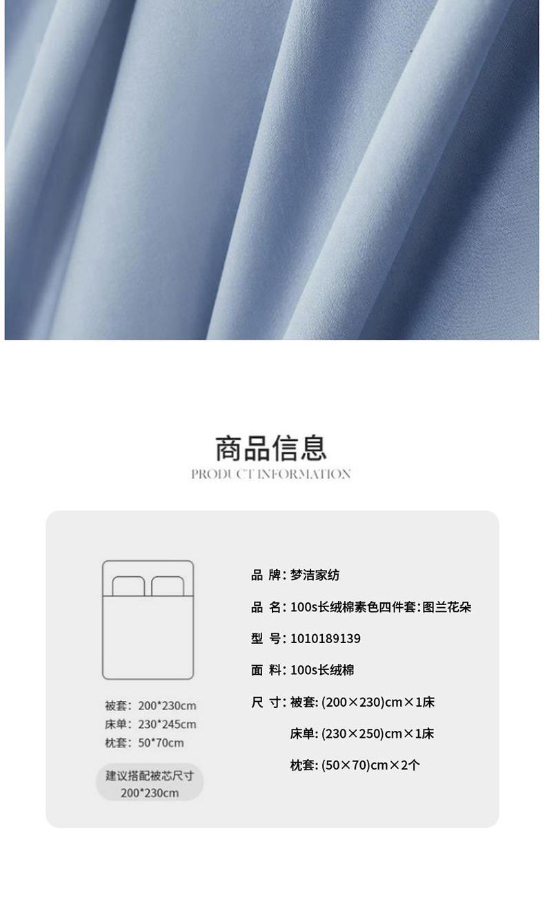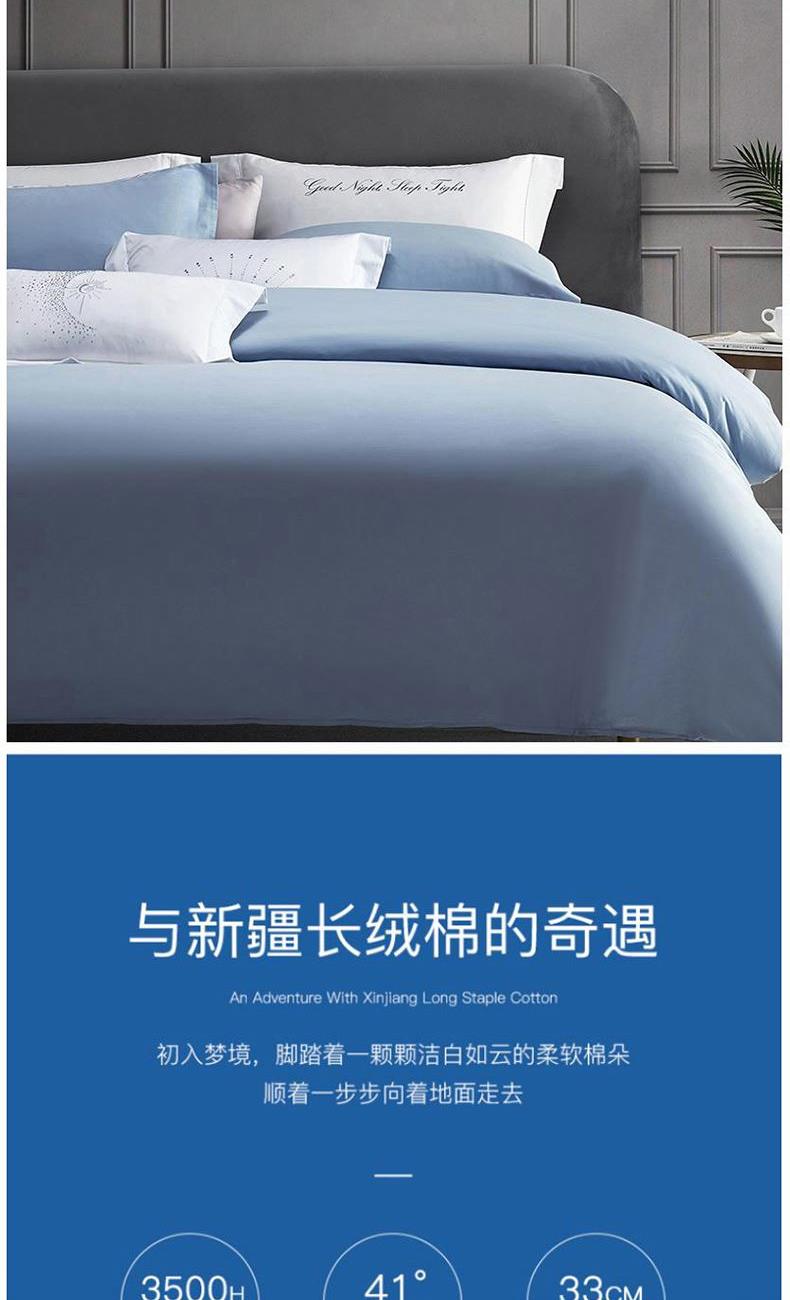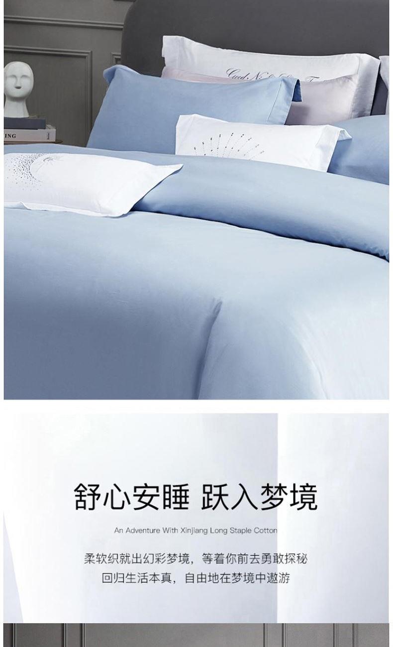 面 料:长绒棉 尺 寸:被套:200×230cm 床单:230×245cm 短枕:50×70cm×2 整体色彩:雾霾蓝一种舒适而富有活力的色彩,轻松打造轻奢格调。安静的陪伴在侧,让您畅享宁静好时光。 面料:选用新疆棉,经严格工序,梳去较短的纤维,面料柔软平整, 触感光滑,吸湿性更好。 工艺:短枕套飞边工艺,安心包裹,圆角床单,优雅不拖地,精美细节提升品质感。