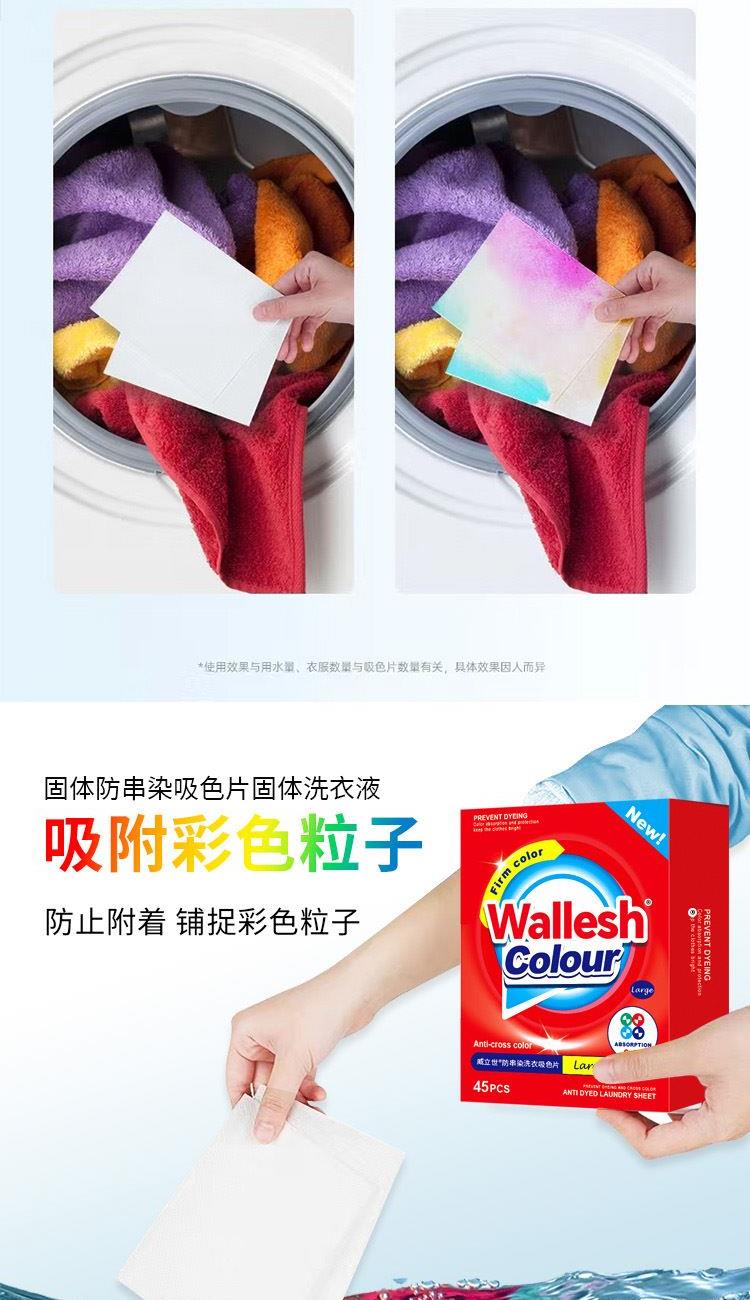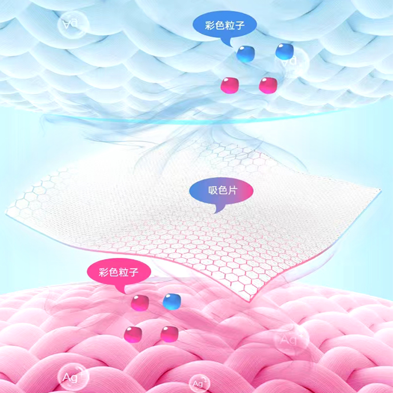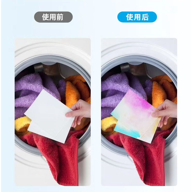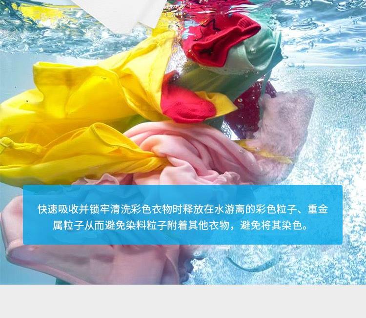 产品特点:彩衣混洗不串色,维护本色。吸附效果显著,吸附彩色粒子,防止附着,捕捉彩色粒子,使用方便