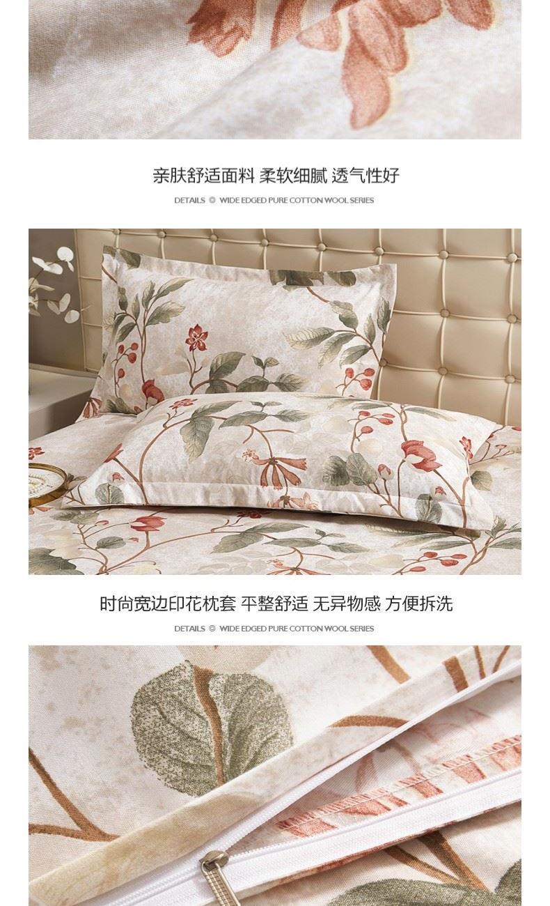 货 号:BGM-T2612 规 格:被套:200*230cm 床单:230*250cm 枕套:48*74cm*2 面料成份:加厚生态棉 加厚生态棉材质:精选加厚生态棉面料,触感柔软亲肤,兼具良好的透气性与保暖性,同时磨毛工艺让表面形成细腻绒感,提升睡眠舒适度。 生态印染工艺:植物花卉图案采用生态印染技术,色彩柔和自然,色牢度高,久洗不易褪色,对肌肤温和无刺激,符合健康睡眠理念。