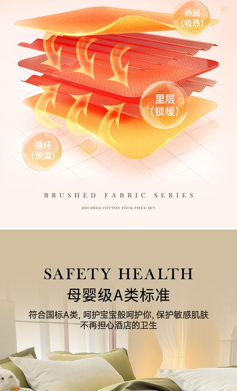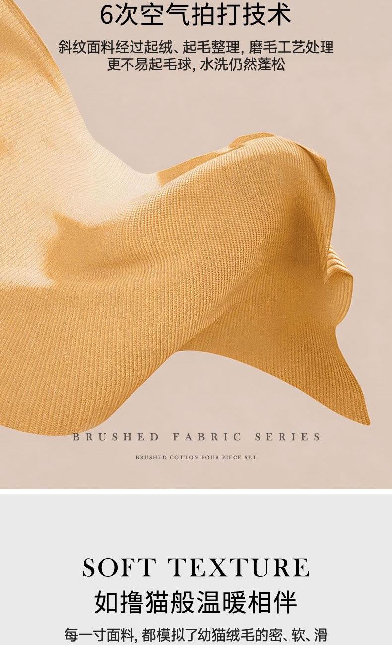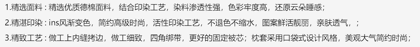 1.精选面料 : 精选优质德棉面料,结合印染工艺,染料渗透性强,色彩牢度高,还原云朵睡感;