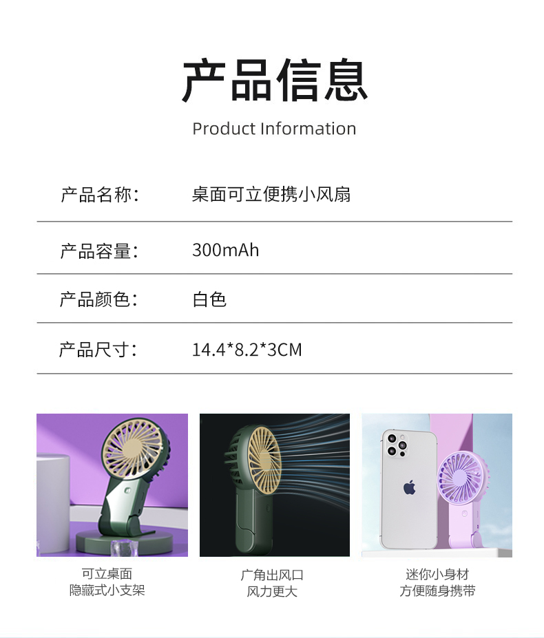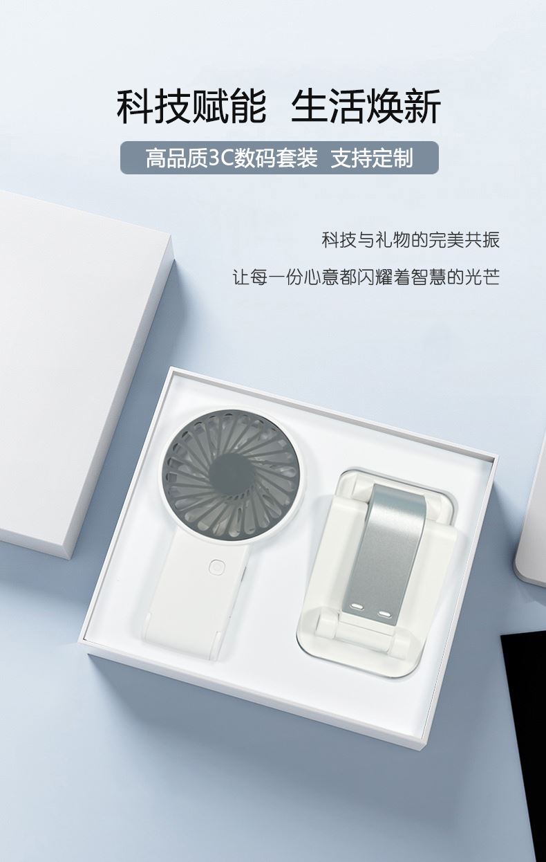1、桌面可立便携小风扇 可手持 可立桌面 三档风速可调 底座90°翻转 2、升级款手机平板桌面支架 可折叠伸缩 5-90°角度调节 预留充电为,边看边充 颜 色:白色 礼盒尺寸:204*174*40mm 手提袋尺寸:229*185*45mm