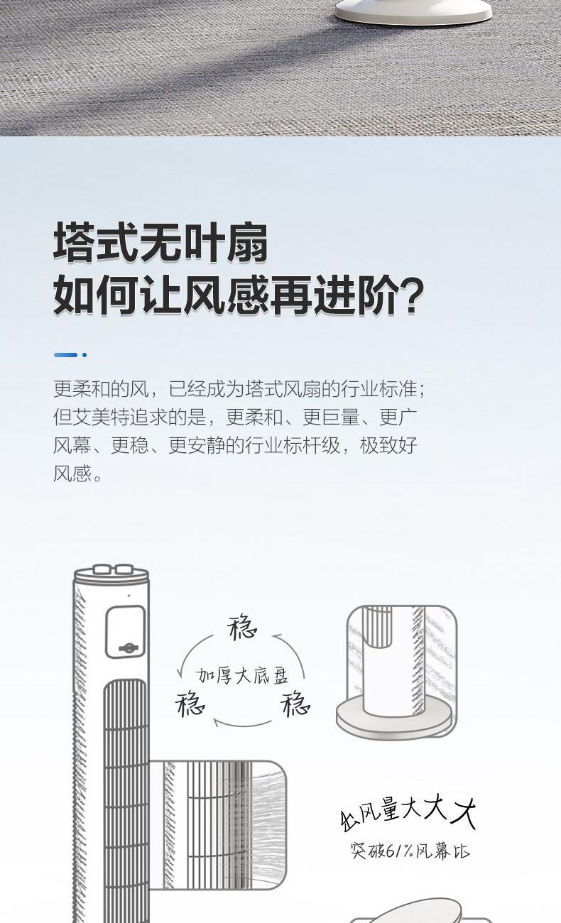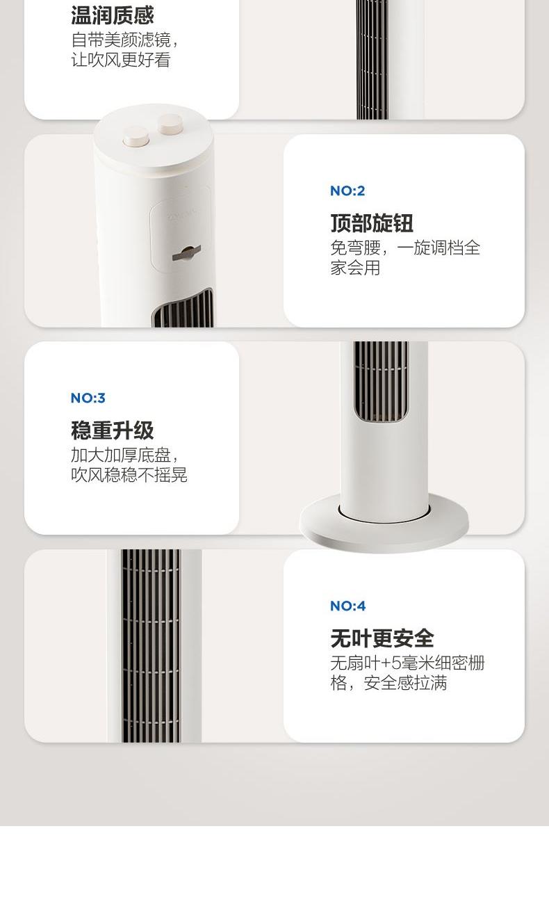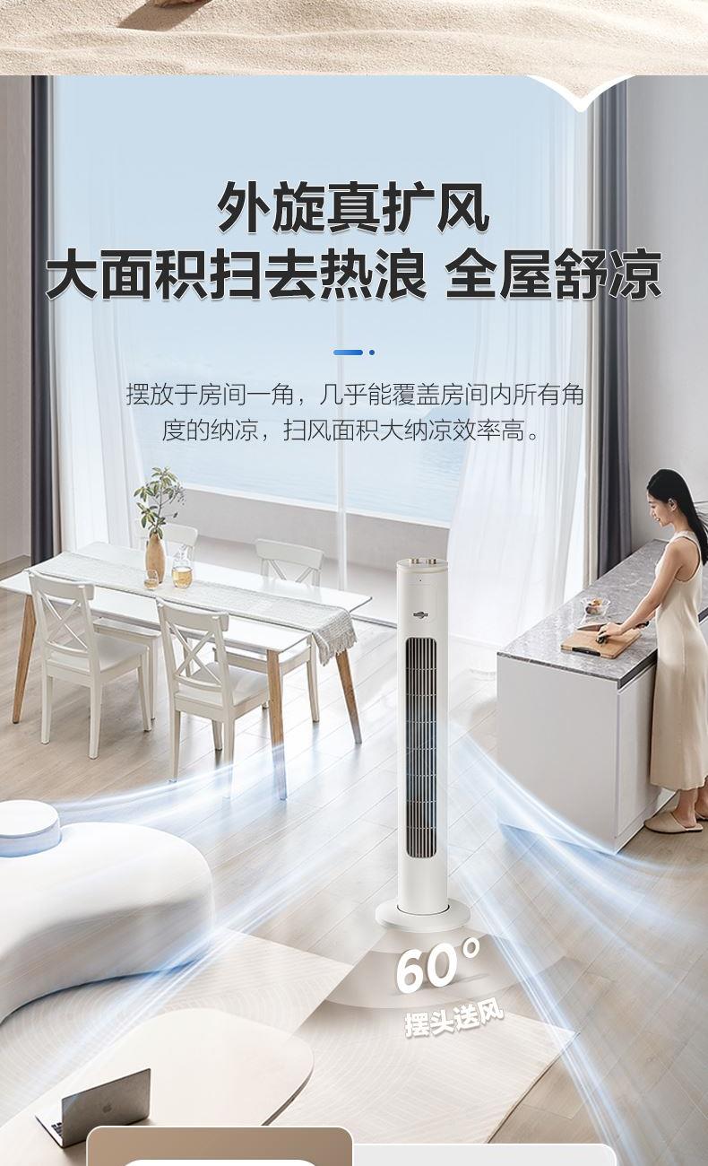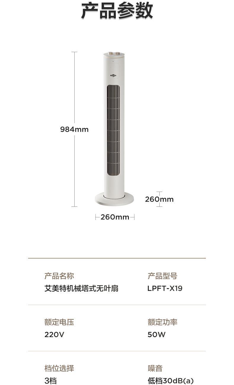 额定电压:220V 额定功率:50W 净重:3.25kg 毛重:4.20kg 档位:3档 控制方式:机械 摆头角度:左右60度摆头 包装尺寸:1020x200x210mm 1.巨幕风沉浸式全身舒凉 加长加宽风道突破62%超长2.风幕占比60°摆风 大风感把舒爽加满 5.8m/s大风感 3.3档轻松调 4.新体验 2H定时 附带香薰盒 30dB(A)超静感 5.280片鼓叶细细柔切出风细腻柔和