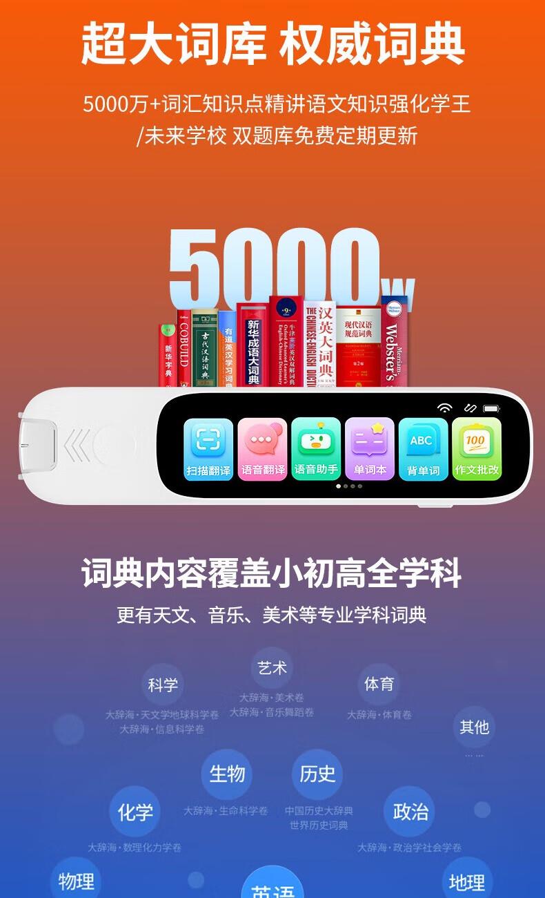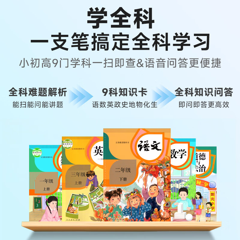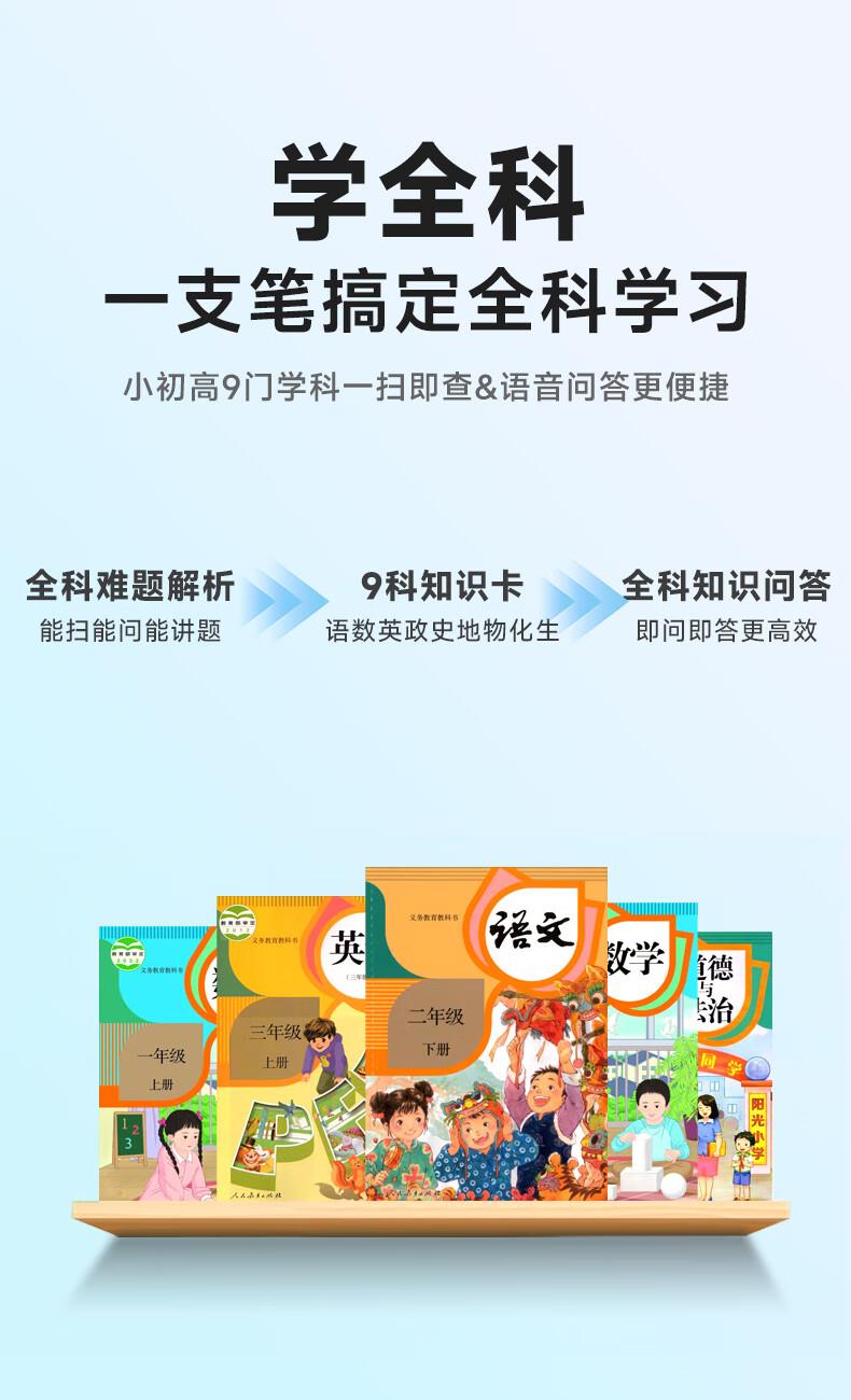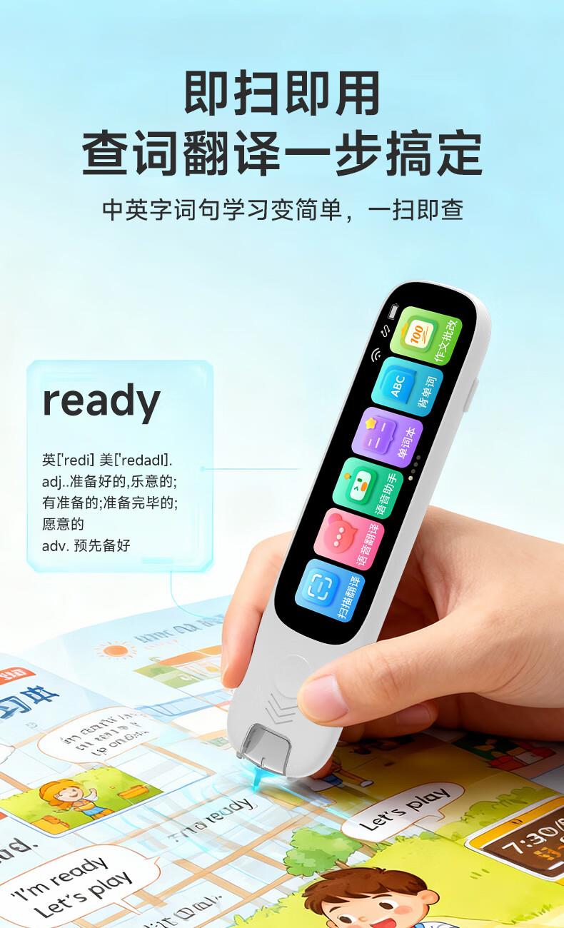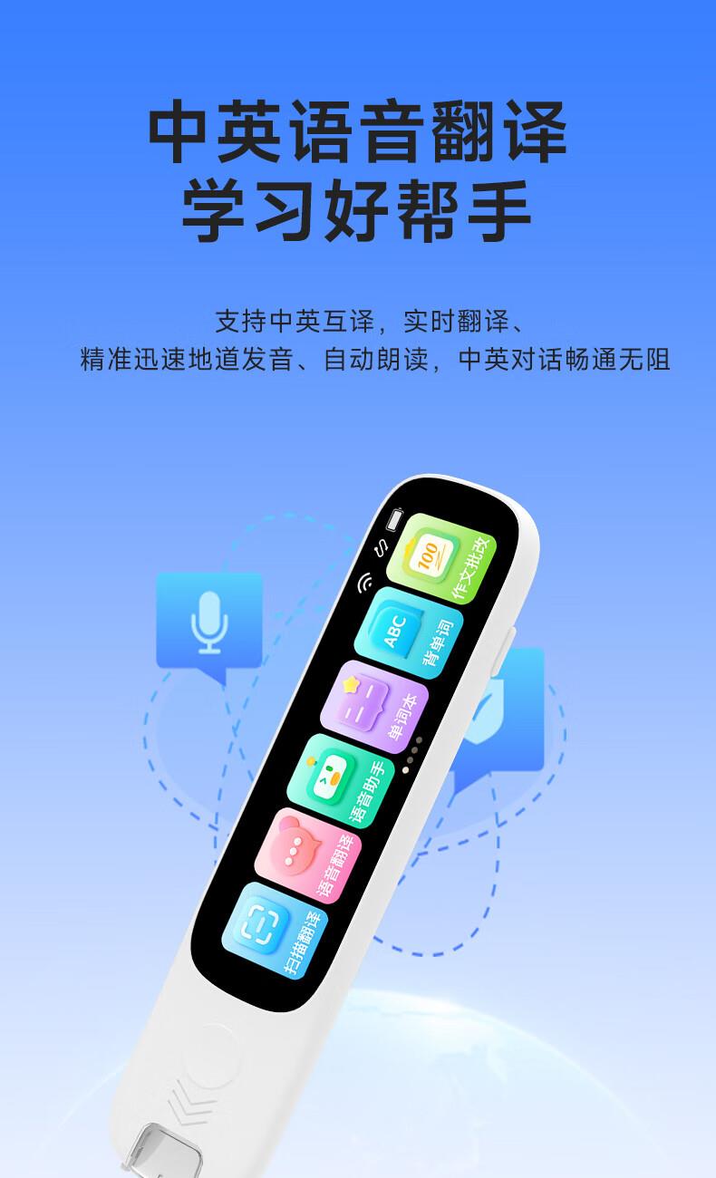 1.无需开机,提笔即扫 2.支持离线翻译;语音翻译,英文单词查词 3.AI问答;K12乐园;喜马拉雅少儿; 4.口语练习;英语作文批改;扫描答疑 5.学习园地(拼音、中学听力训练、小学中学英语阅读、小学中学古诗词、小学中学英语语法、算数口诀) 6.背单词(小学、初中、高中、大学、托福、GRE) 7.古诗词(扫描古诗词进行学习) 8.全科学习(涵盖小学、初中、高中9门学科) 9.微聊