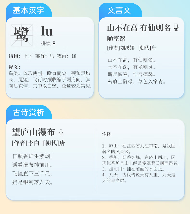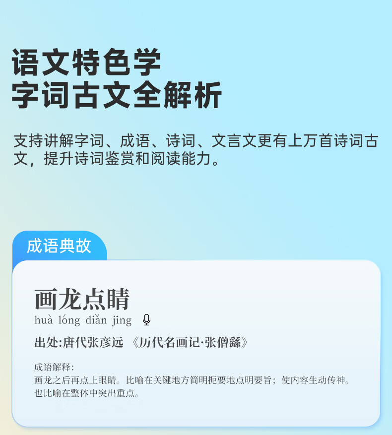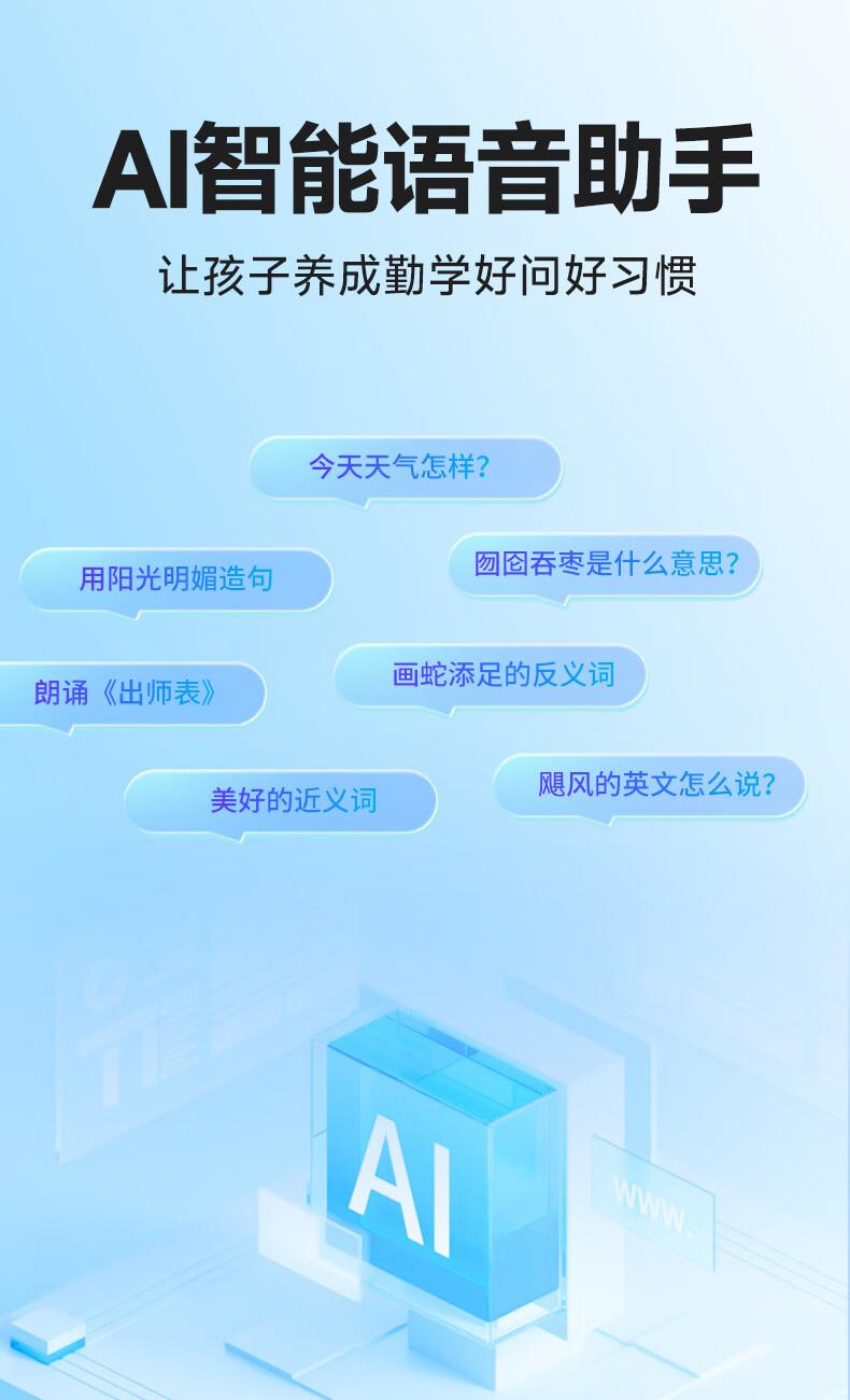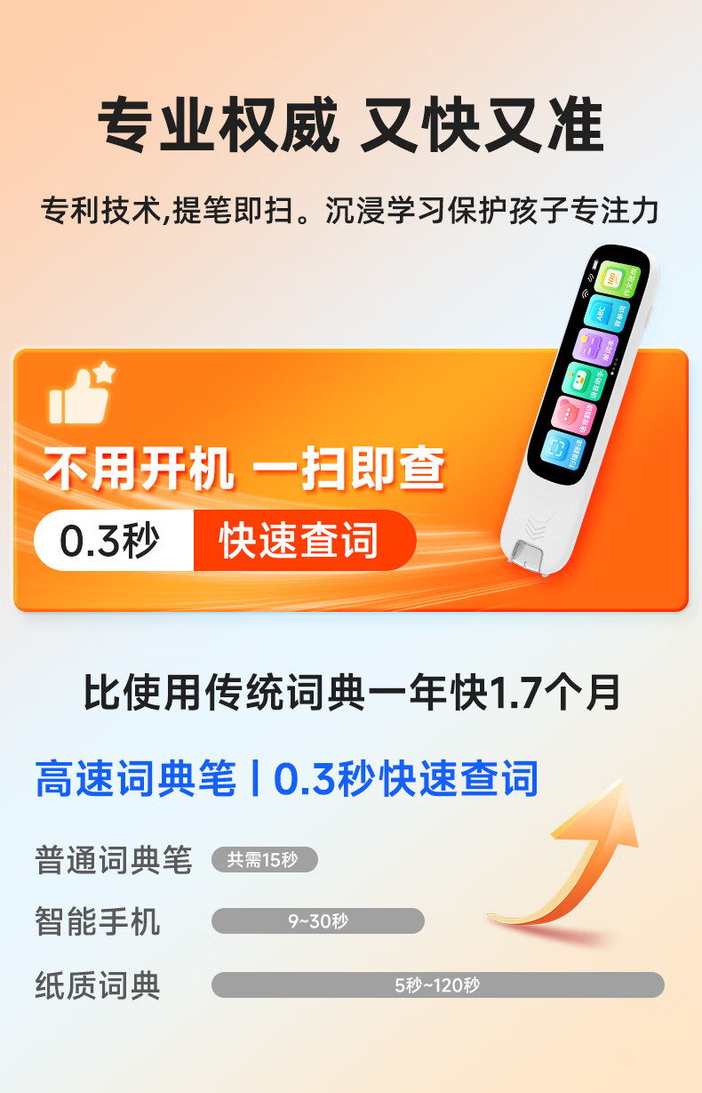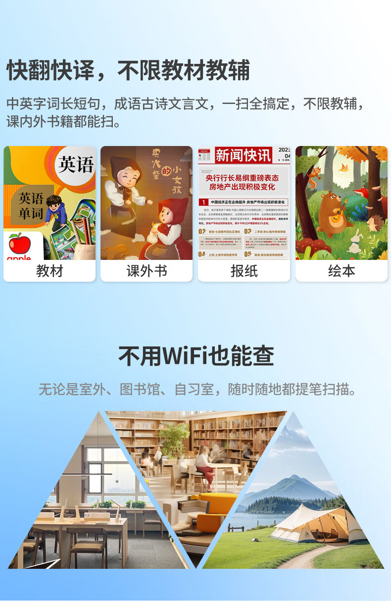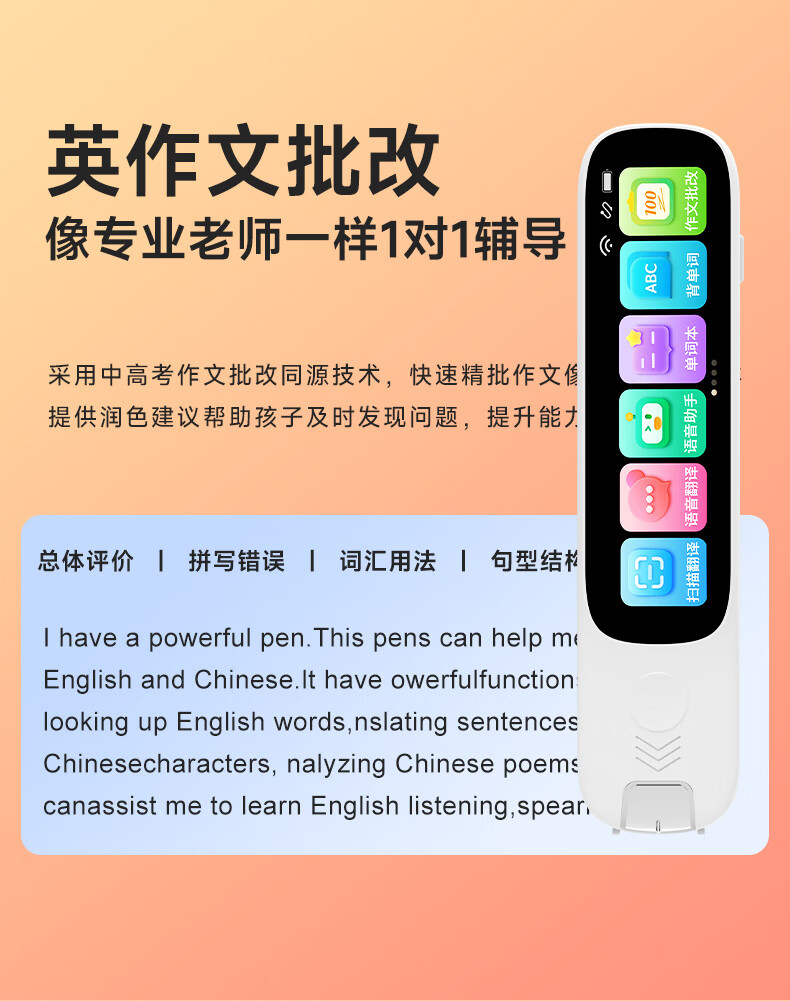 1.无需开机,提笔即扫 2.支持离线翻译;语音翻译,英文单词查词 3.AI问答;K12乐园;喜马拉雅少儿; 4.口语练习;英语作文批改;扫描答疑 5.学习园地(拼音、中学听力训练、小学中学英语阅读、小学中学古诗词、小学中学英语语法、算数口诀) 6.背单词(小学、初中、高中、大学、托福、GRE) 7.古诗词(扫描古诗词进行学习) 8.全科学习(涵盖小学、初中、高中9门学科) 9.微聊