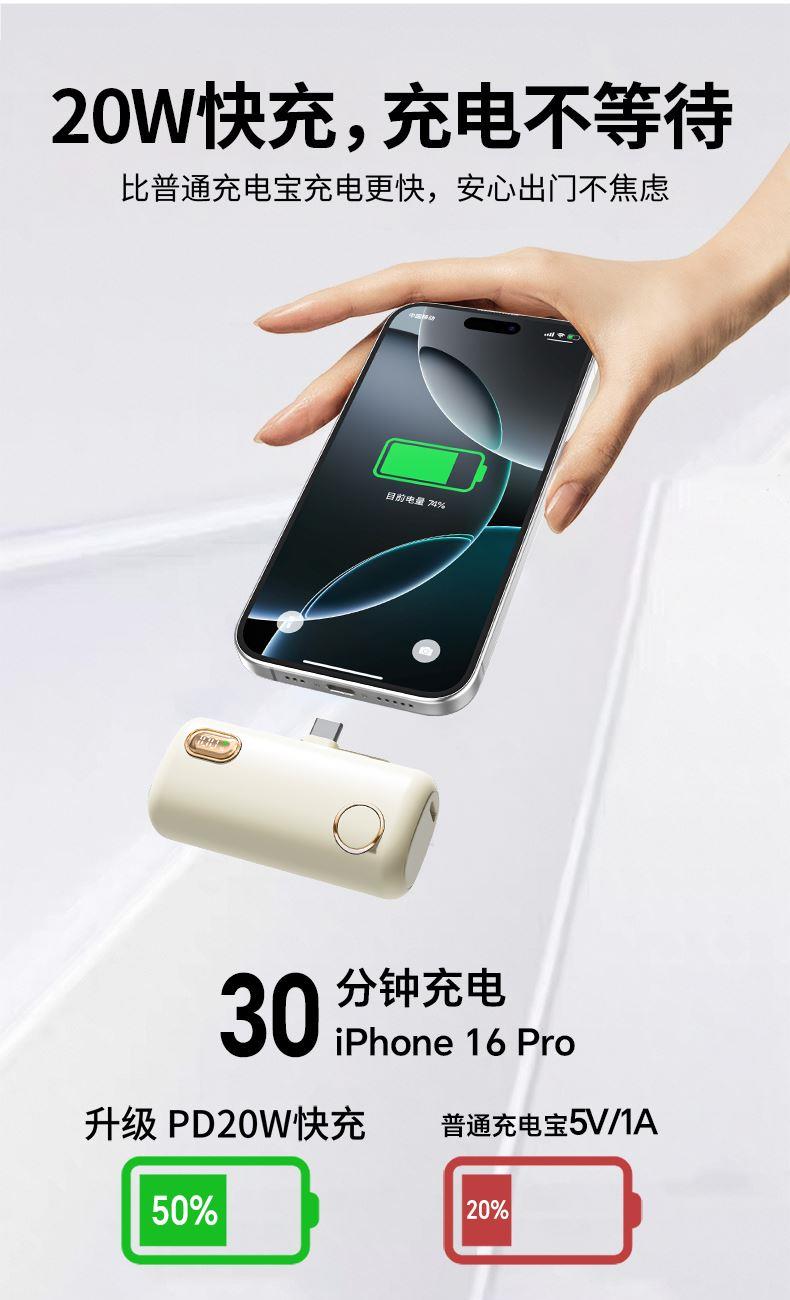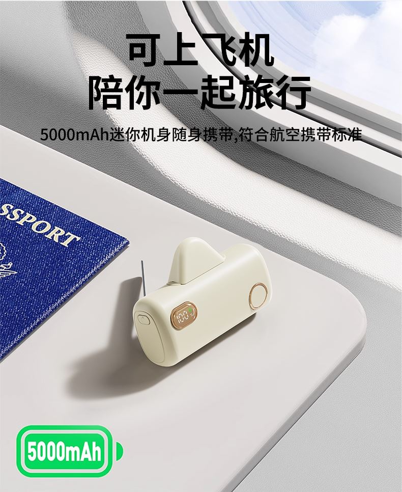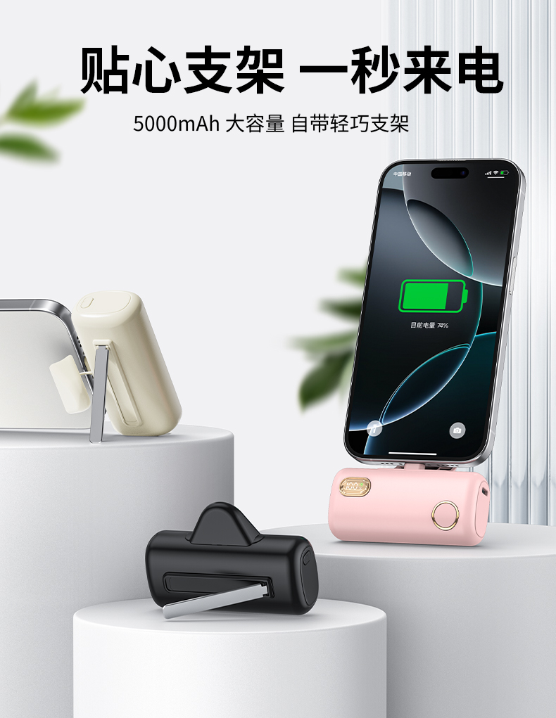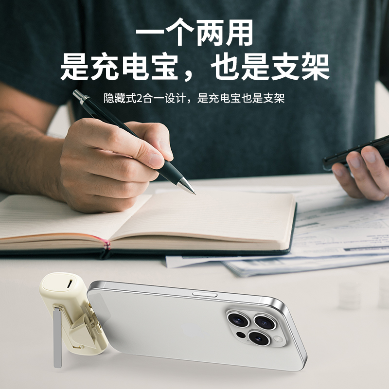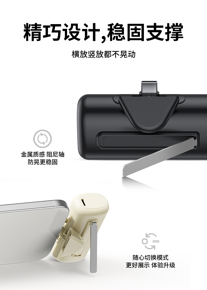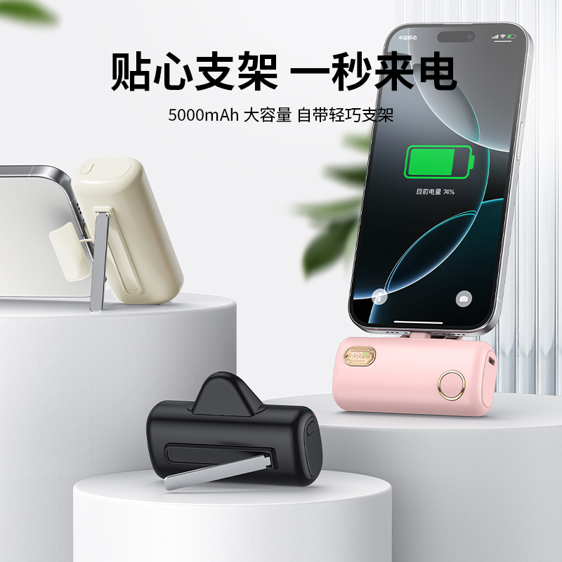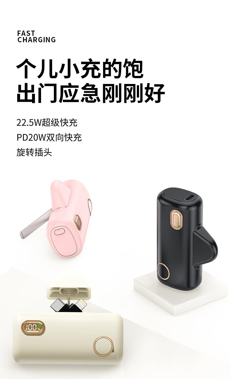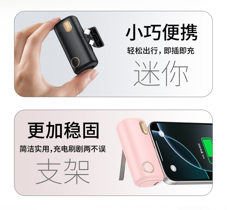 【推荐理由】: 5000毫安容量,自带手机支架 可旋转双接口,兼容全部手机充电 22.5W超级快充,兼容PD20W 智能数显电量显示 符合民航局标准,可随身携带 颜色:米色(主推) 黑色 粉色 材质:ABS+电镀 容量:5000毫安 尺寸:35*79*28mm 包装:彩盒包装