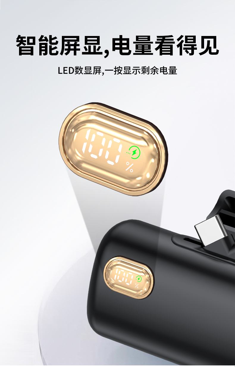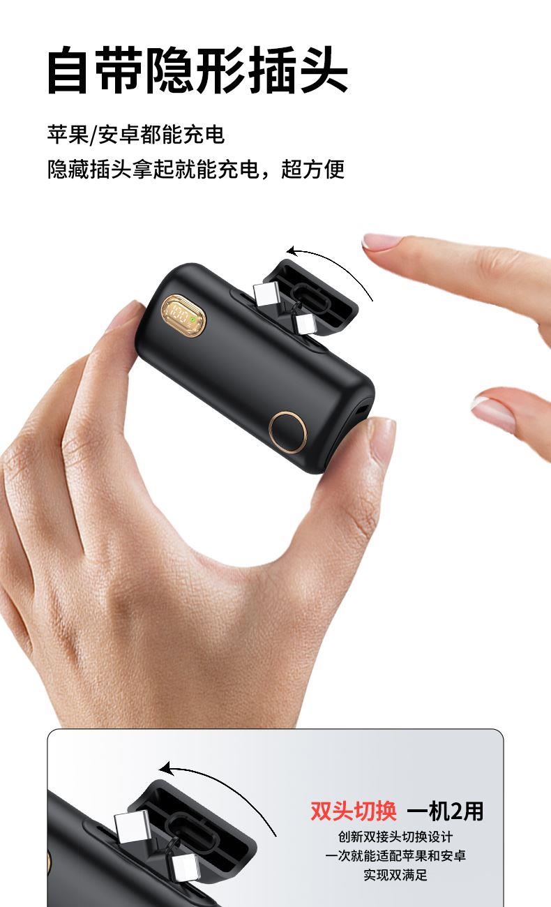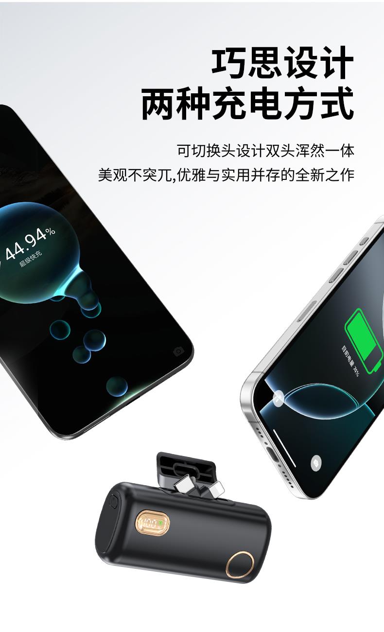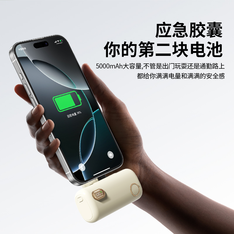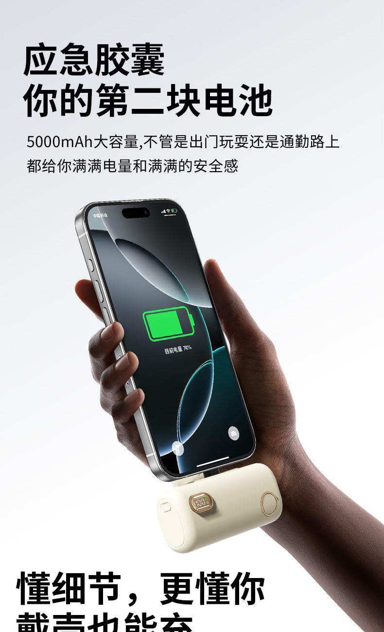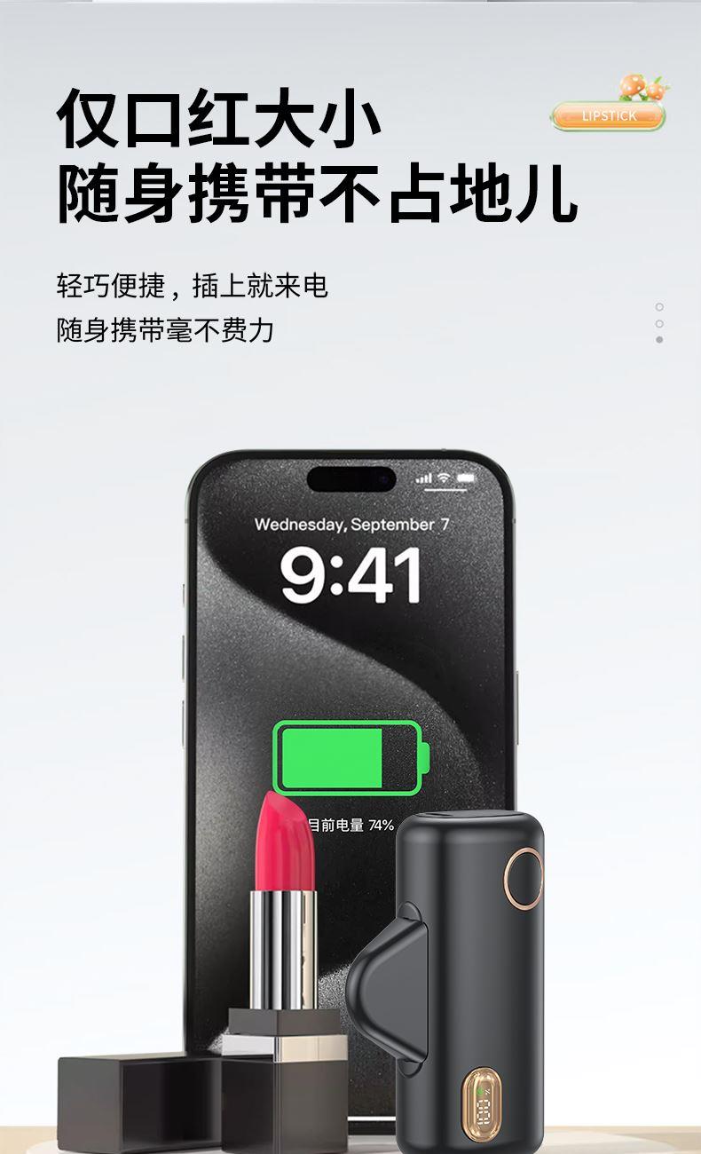 【推荐理由】: 5000毫安容量,自带手机支架 可旋转双接口,兼容全部手机充电 22.5W超级快充,兼容PD20W 智能数显电量显示 符合民航局标准,可随身携带 颜色:米色(主推) 黑色 粉色 材质:ABS+电镀 容量:5000毫安 尺寸:35*79*28mm 包装:彩盒包装