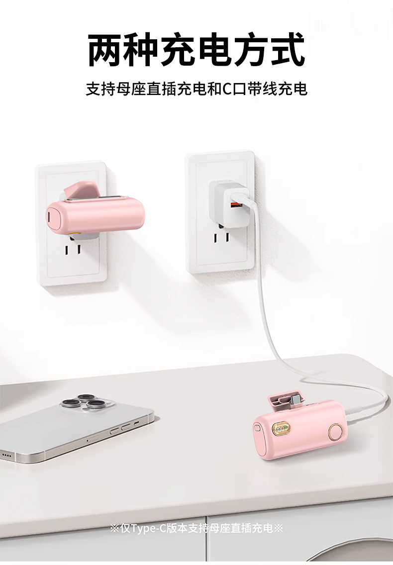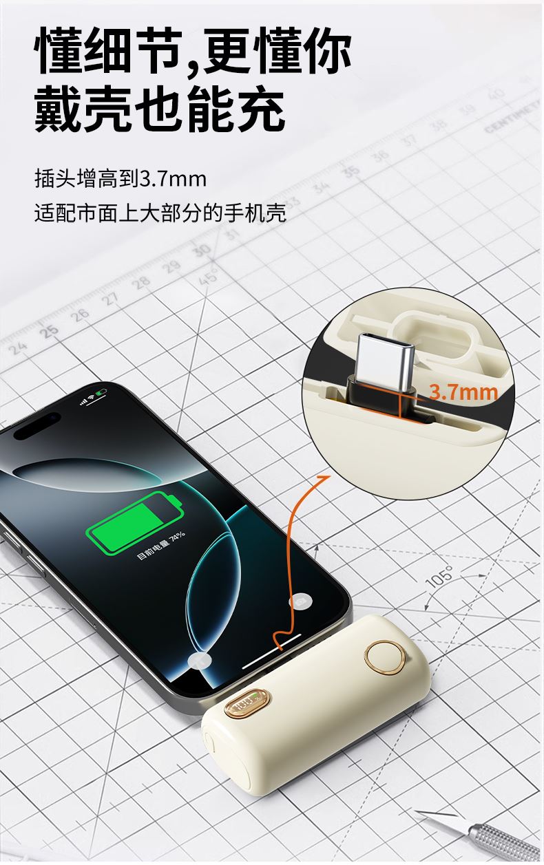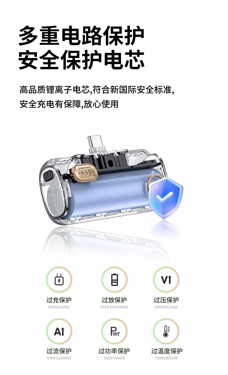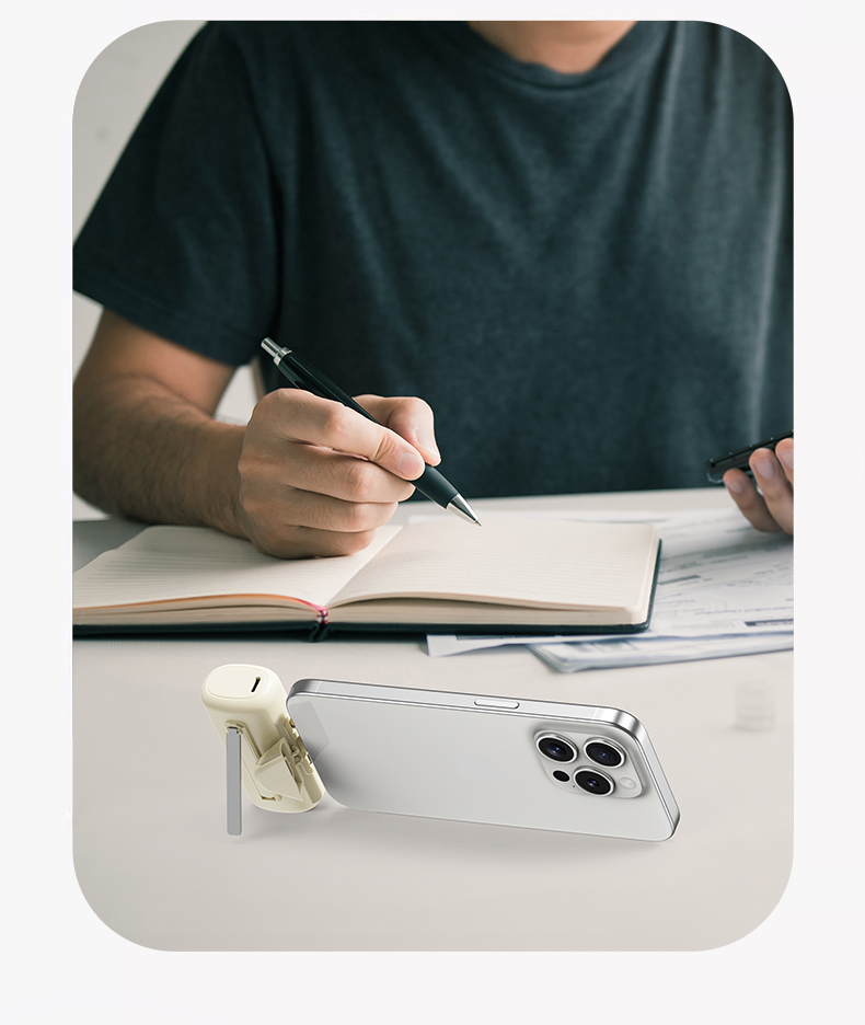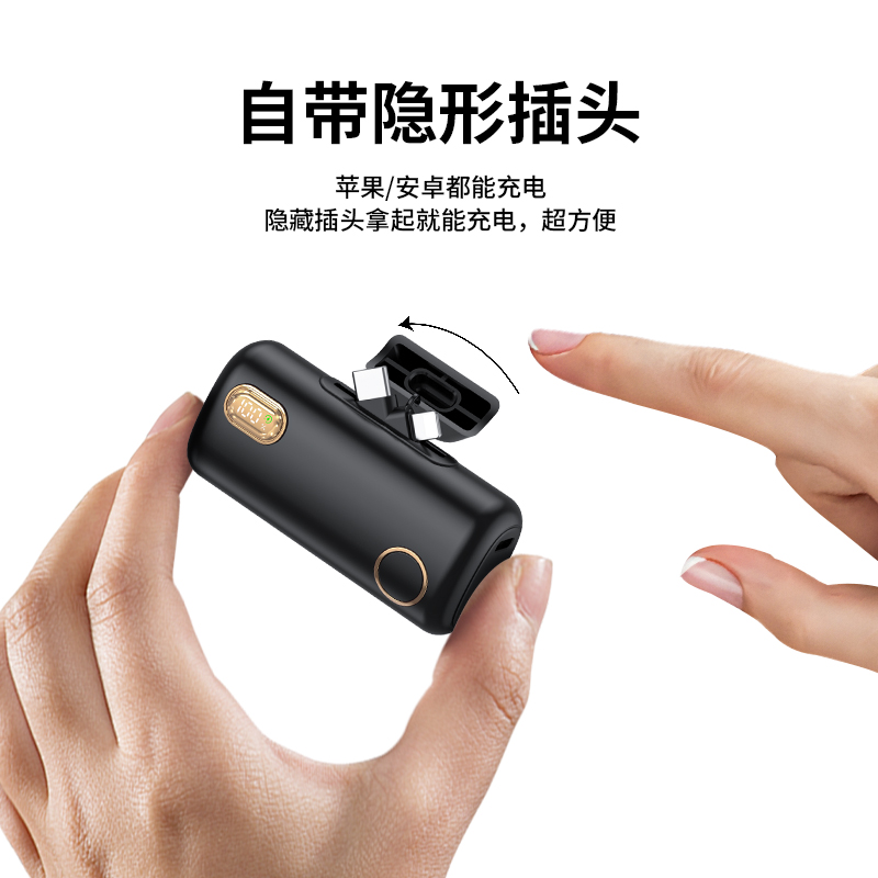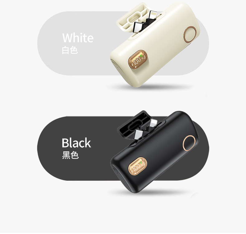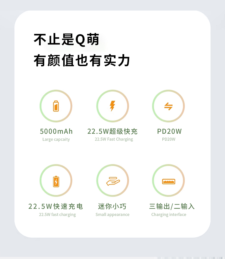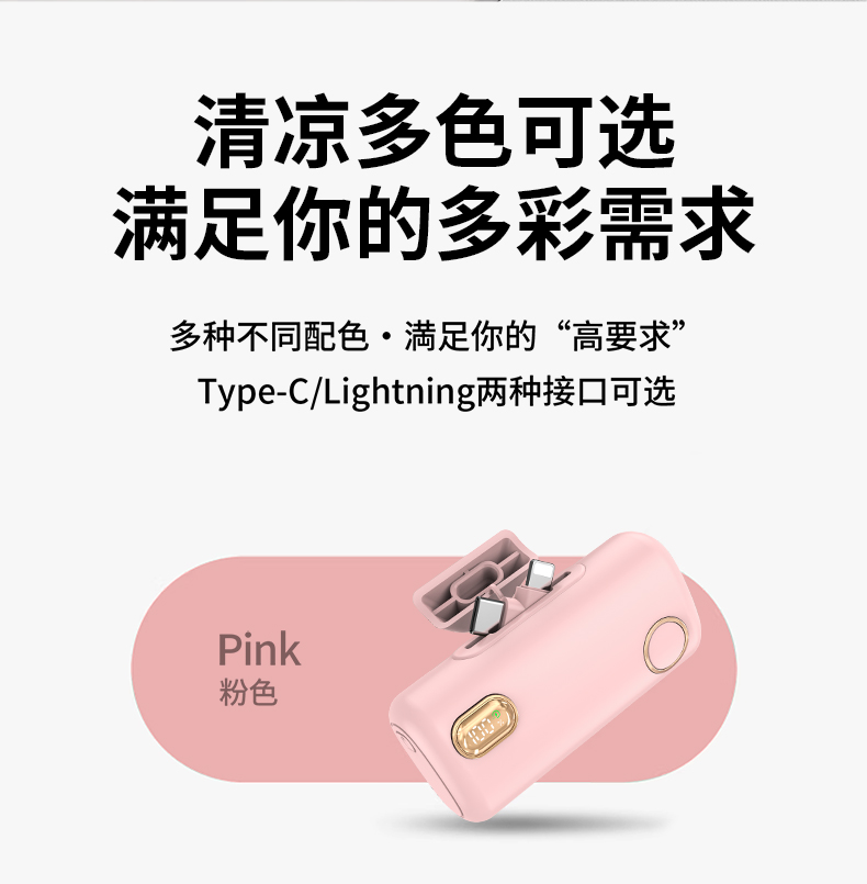 【推荐理由】: 5000毫安容量,自带手机支架 可旋转双接口,兼容全部手机充电 22.5W超级快充,兼容PD20W 智能数显电量显示 符合民航局标准,可随身携带 颜色:米色(主推) 黑色 粉色 材质:ABS+电镀 容量:5000毫安 尺寸:35*79*28mm 包装:彩盒包装