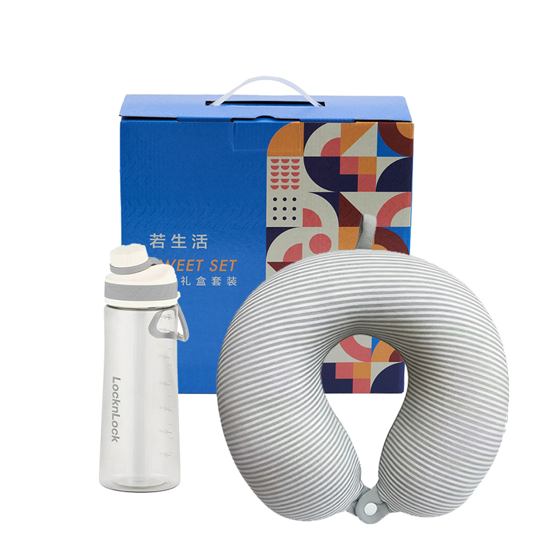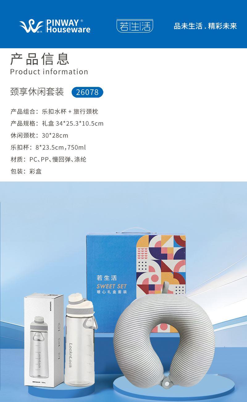 产品型号:26078 产品组合:乐扣水杯+旅行颈枕 产品规格:礼盒34*25.3*10.5cm 休闲颈枕:30*28cm 乐扣杯:8*23.5cm,750ml 材质:PC、PP、慢回弹、涤纶 包装:彩盒
