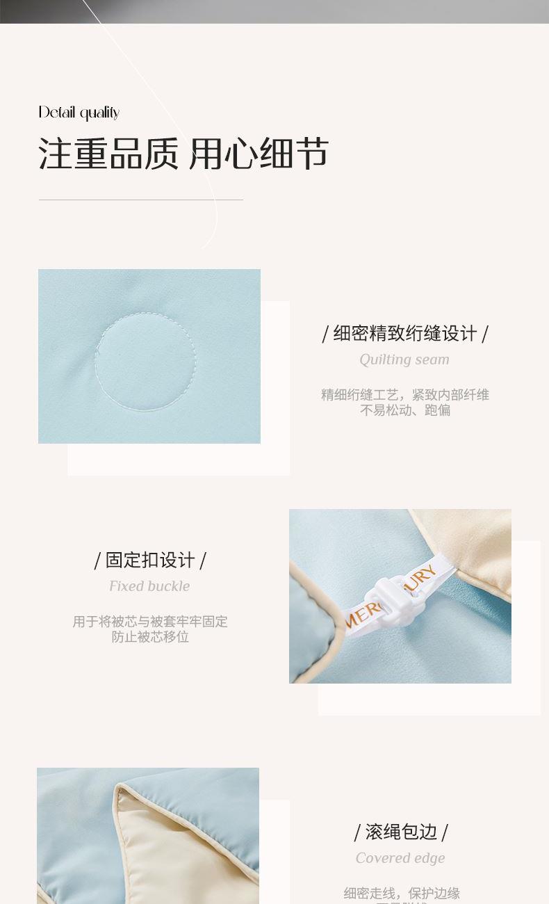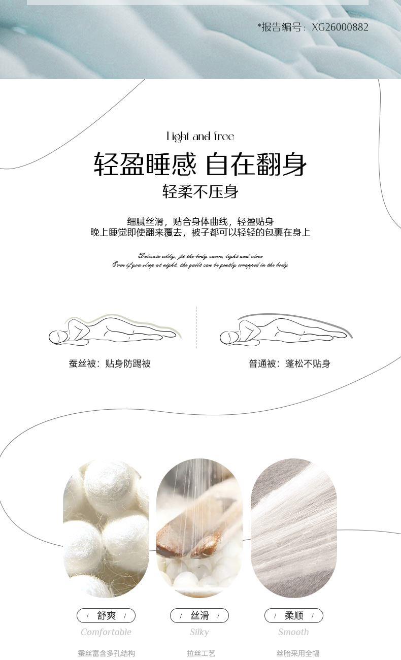 1.【A类安全标准】 A类安全标准,守护睡眠健康。 2.【柞蚕丝填充,自然有机,健康舒适】 柞蚕丝填充,轻盈透气、调温保暖。 3.【品质面料,柔软透气更亲肤】 高品质面料,触感柔软细腻,亲肤透气 4.【水星防螨科技,抑制细菌螨虫,健康舒适】 水星科技防螨,守护睡眠健康。