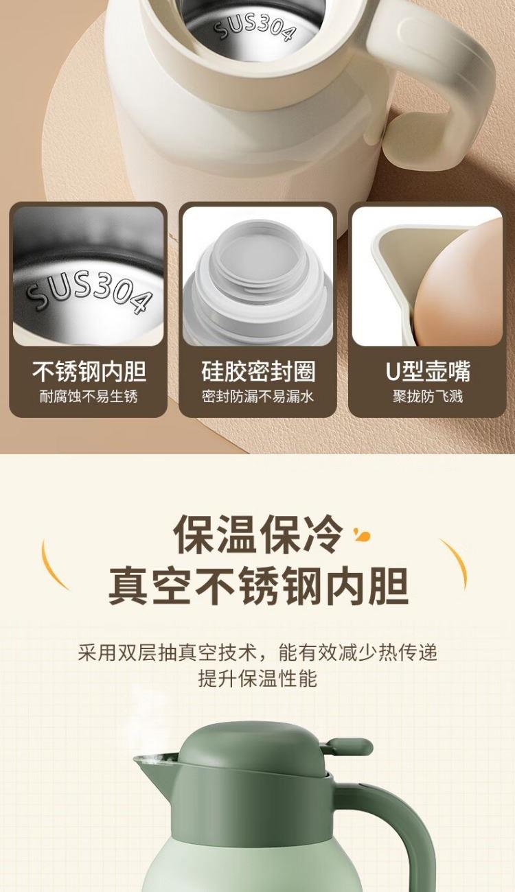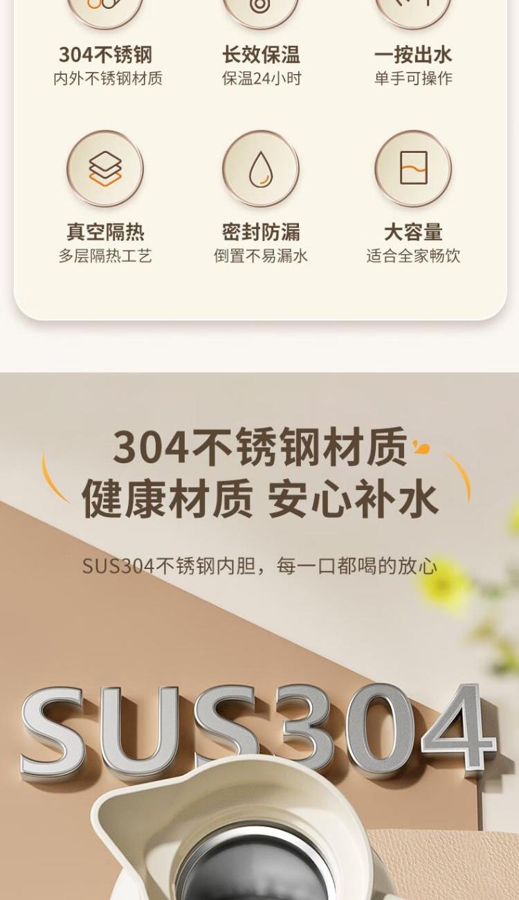包装为单只气泡柱邮购盒加固包装,介意慎拍 容量:2000ml 材质:内外304不锈钢+PP 颜色:经典本色 产品特点 1.24小时长效保温,留住温暖 2.304不锈钢,健康选材皆安心 3.一键出水,拿握不费力