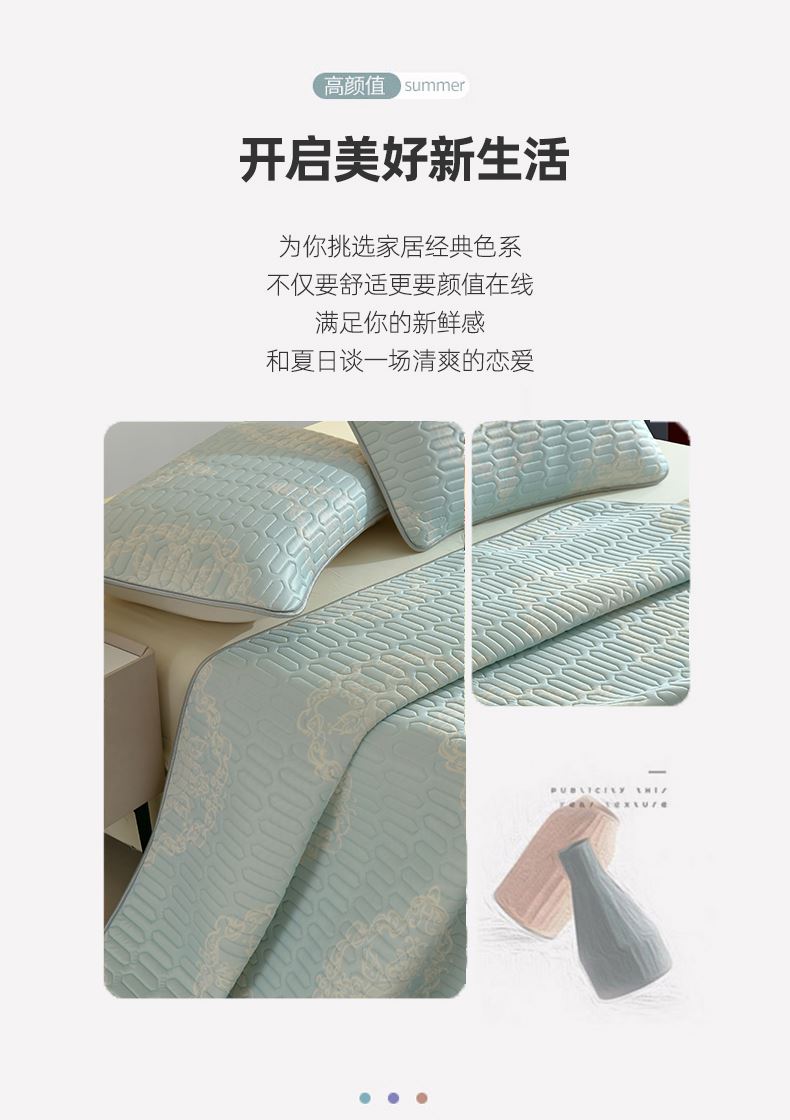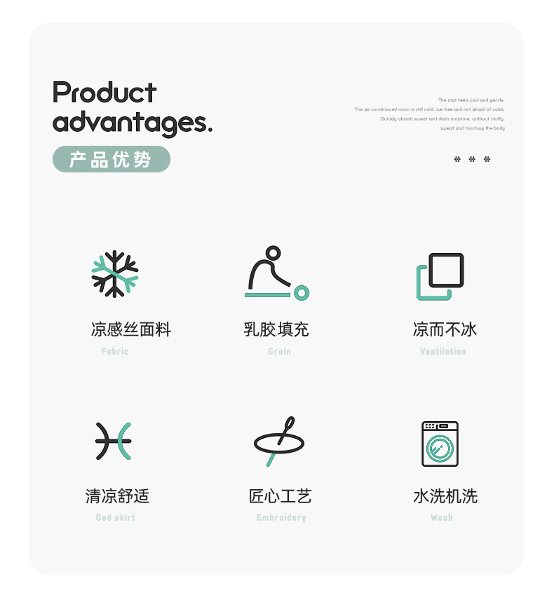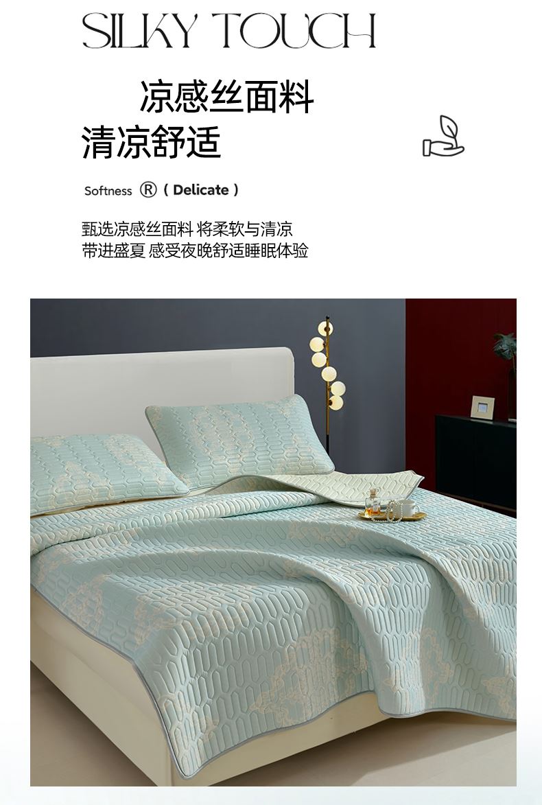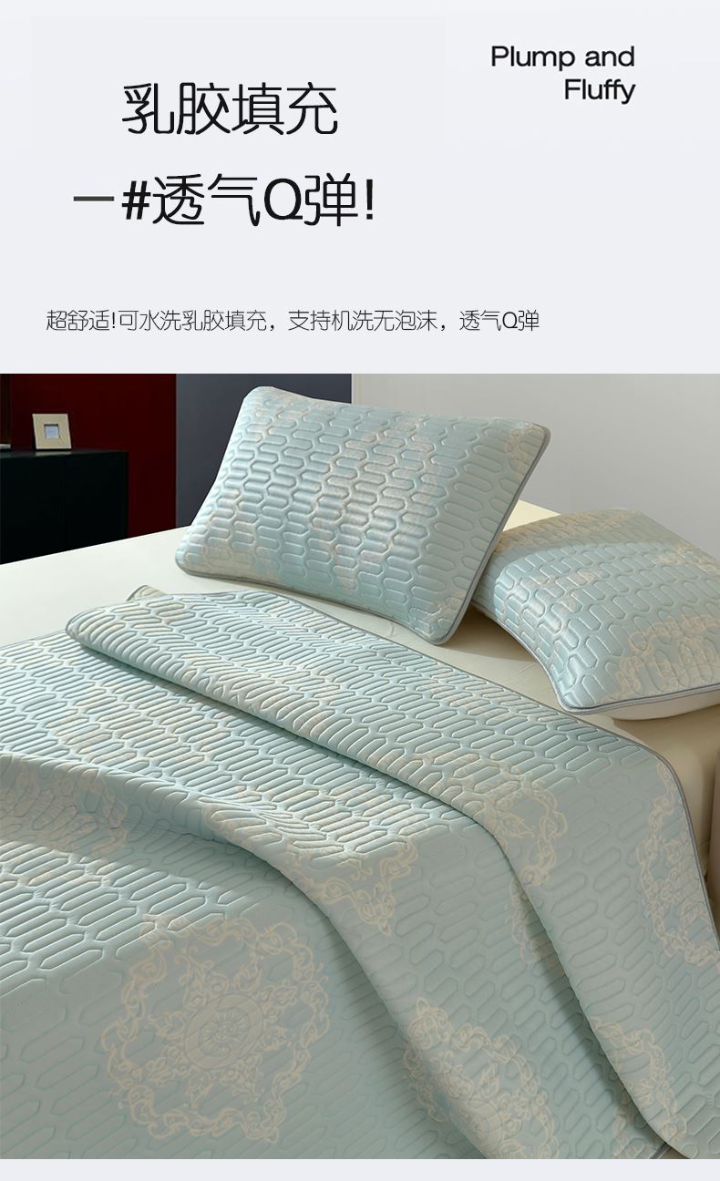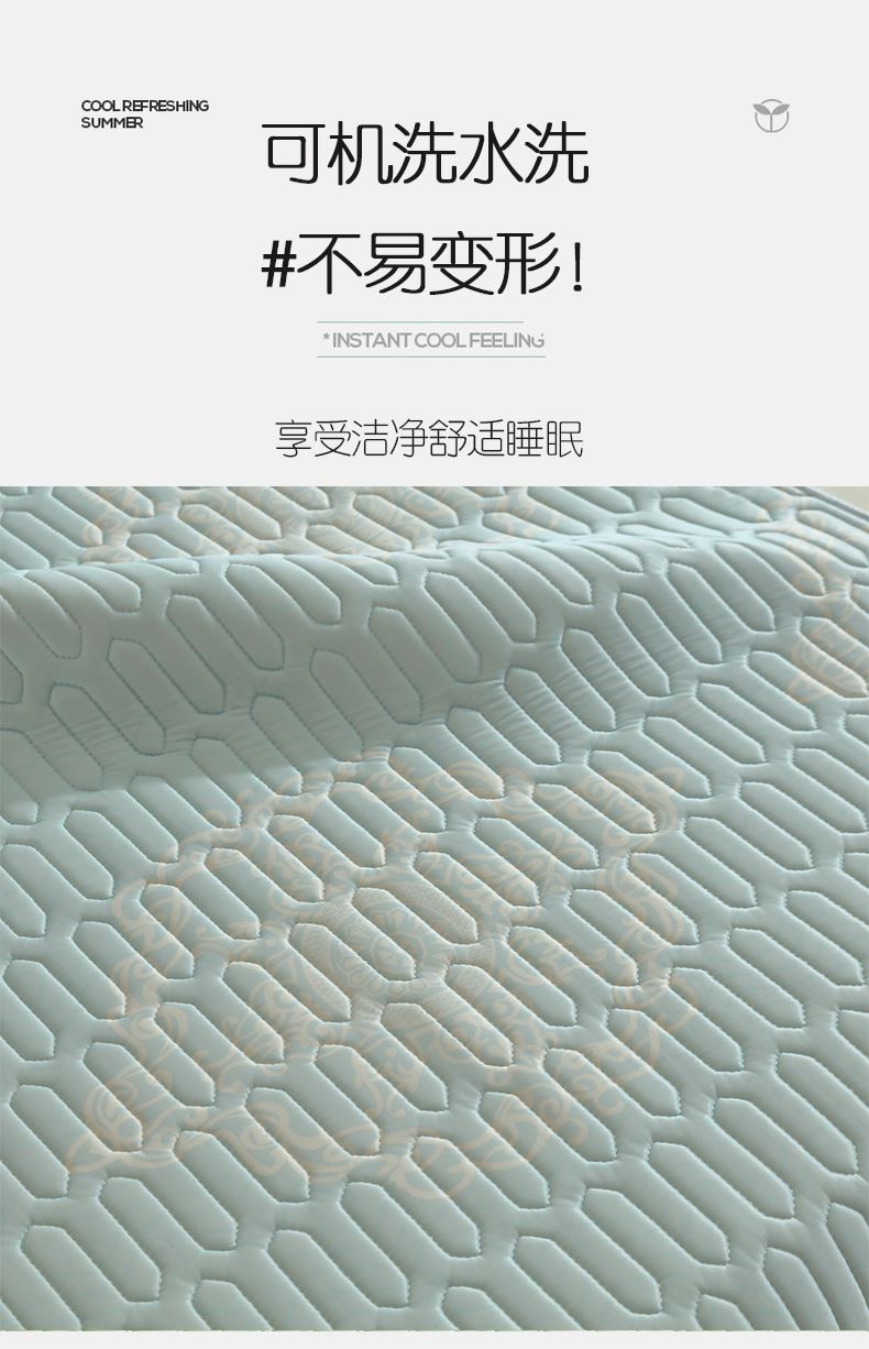 规格:180*200cm 枕套:48*74cm*2 面料:凉感丝 填充:泰国乳胶 执行标准:Q/TDY 01-2016 安全类别:GB18401-2010 B类 1.采用凉感丝面料,科技凉感纤维,内外导热,天生自带凉感,持续凉爽一整夜; 2.填充可以水洗机洗,柔软透气,80000000+透气孔,加倍散热,时刻保持清凉; 3.活性环保印染,A类安全标准,母婴和敏感肌肤即可使用。
