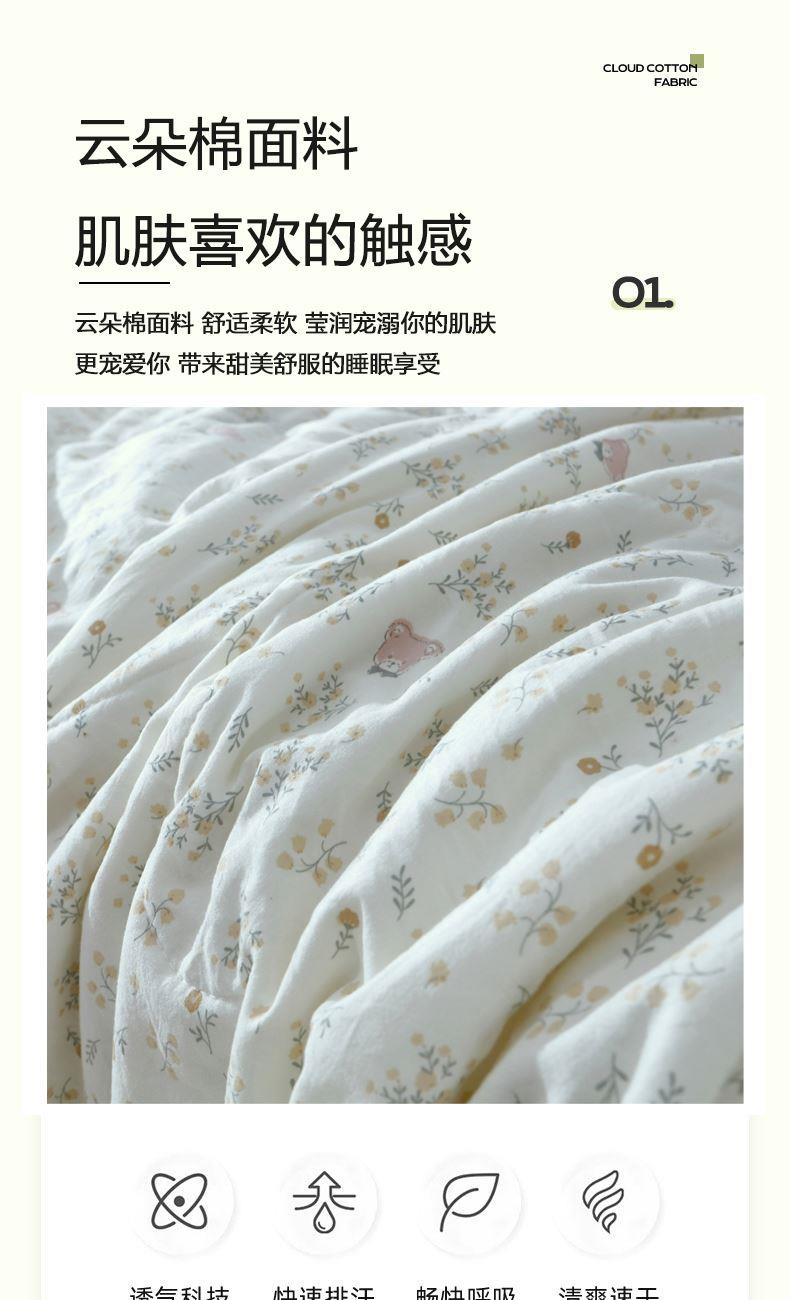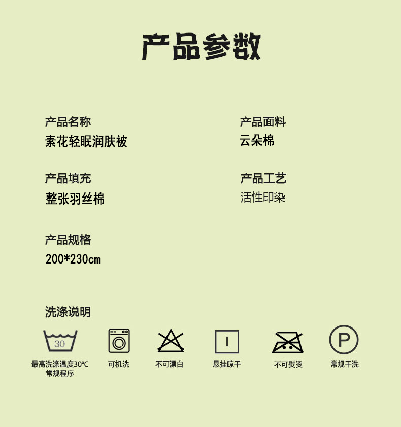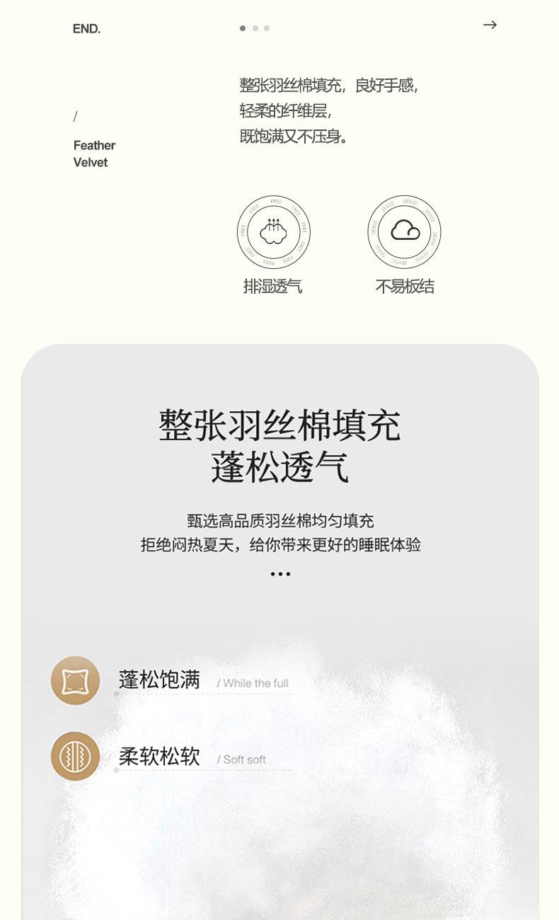 规格:200*230cm 面料:云朵棉 填充:羽丝棉 克重:1400g 产品特点: 1.洛卡棉面料经过特殊处理,具有良好的色牢度。 2.洛卡棉面料耐水性好,手感柔软,亲肤性好。 3.洛卡棉具有良好的透气性,具有防霉抗皱的特性。