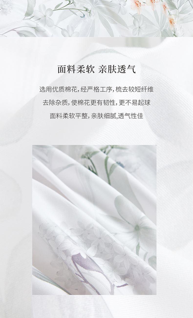 面 料:棉 尺 寸:被套:200×230cm 床单:245×230cm 短枕:50×70cm×2 整体色彩:热带植物图案,浅绿、淡灰、米白等柔和色调,描绘出各类热带叶片与花卉,仿佛将热带雨林的清新与雅致定格在床品之上。 面料:选用优质棉花,经严格工序,梳去较短纤维,去除杂质,使棉花更有韧性,更不易起球。面料柔软平整,亲肤细腻,透气性佳。 工艺:精简的四件套组合,短枕大气。