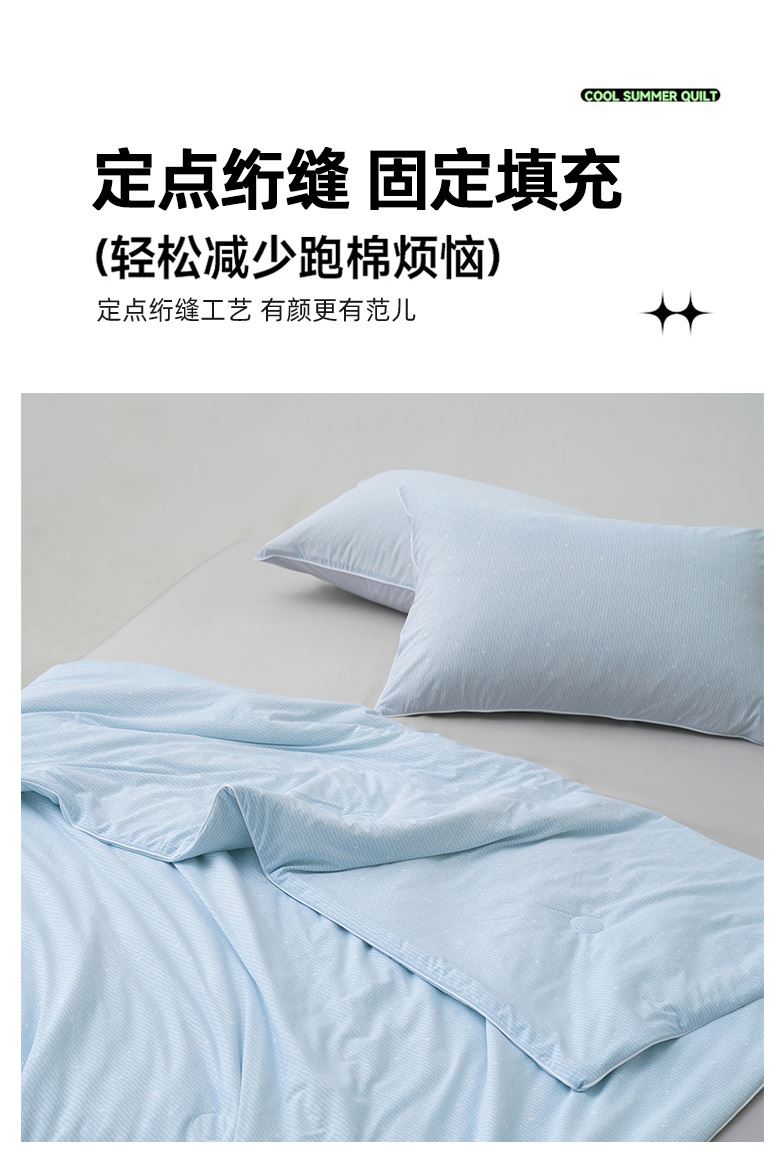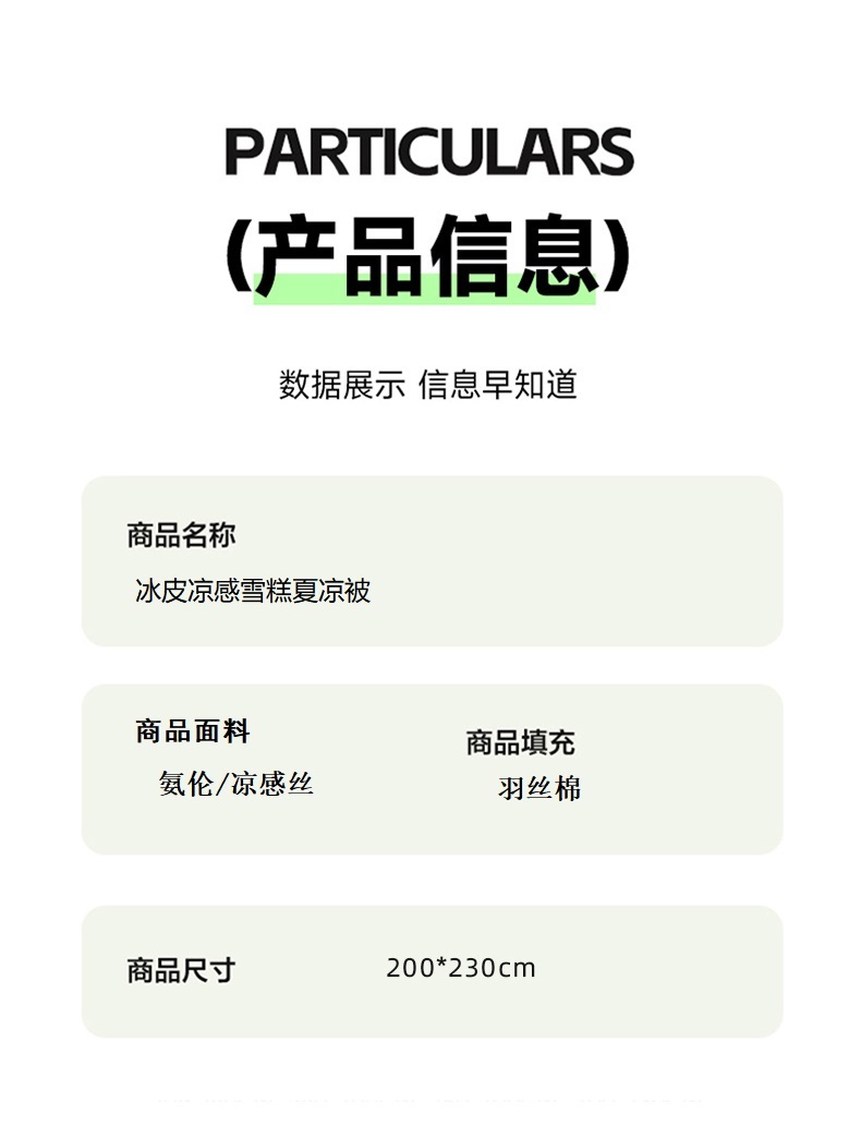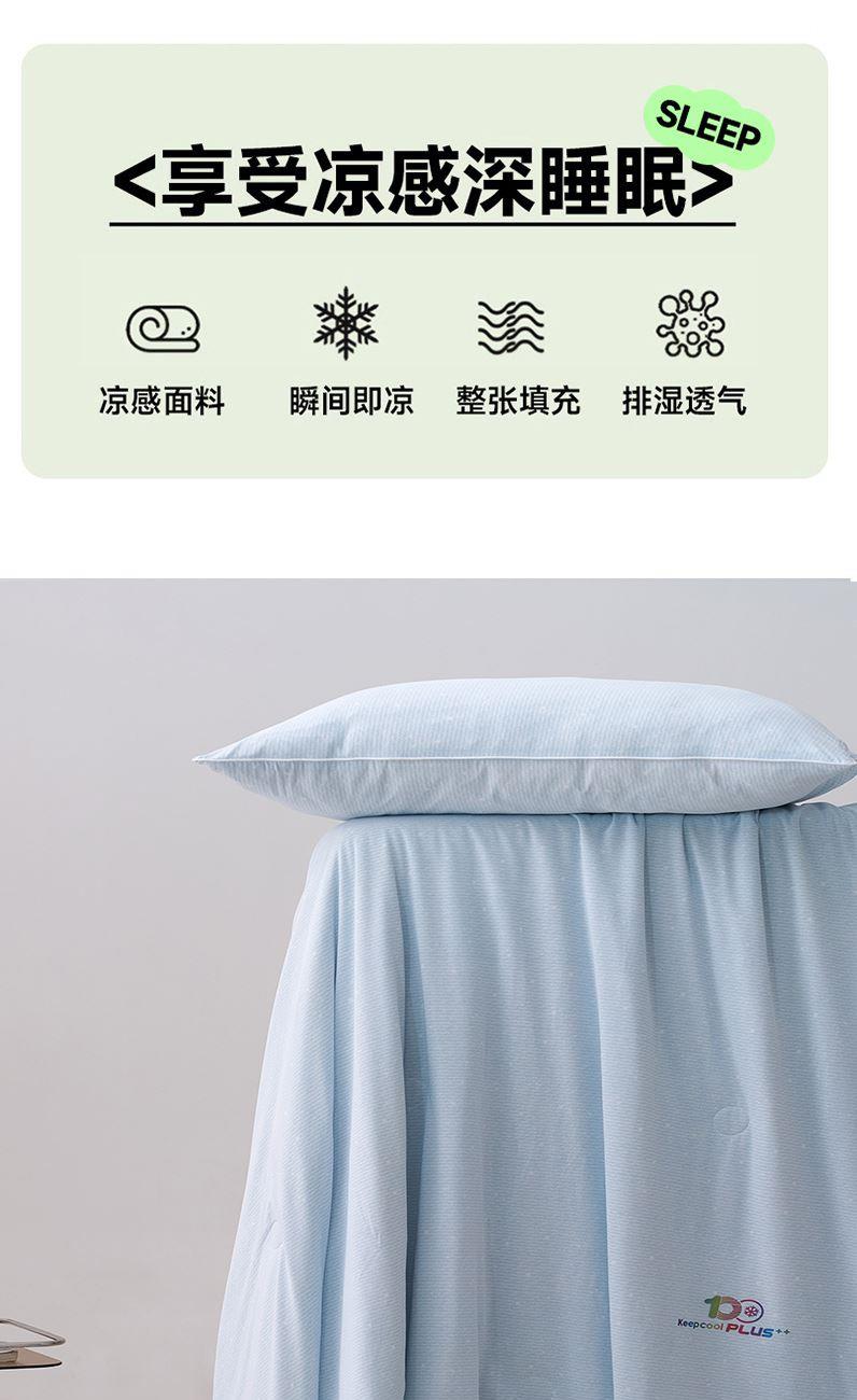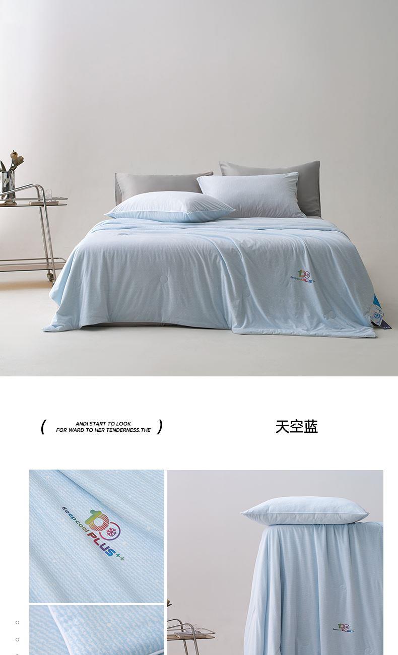 面料材质:氨伦/凉感丝 填充:羽丝棉 产品规格:200*230cm 克重:1700g 产品特点: 夏被感受凉感黑科技,触感细腻的凉感丝,内部多孔结构有效排出湿气。不闷热,凉而不冰。夏日清凉新睡眠。