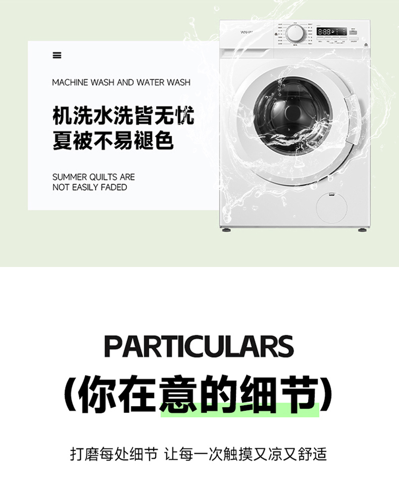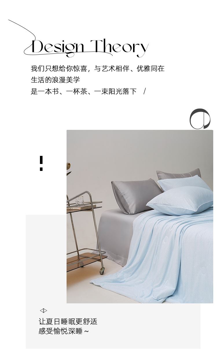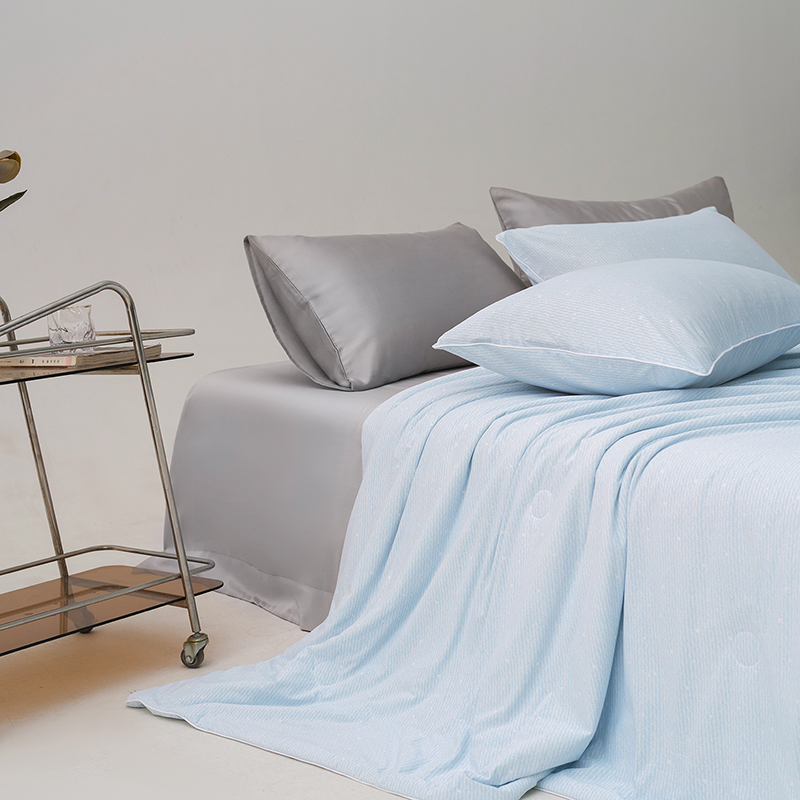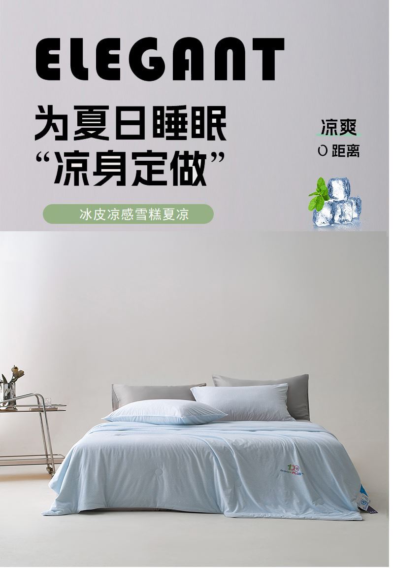 面料材质:氨伦/凉感丝 填充:羽丝棉 产品规格:200*230cm 克重:1700g 产品特点: 夏被感受凉感黑科技,触感细腻的凉感丝,内部多孔结构有效排出湿气。不闷热,凉而不冰。夏日清凉新睡眠。