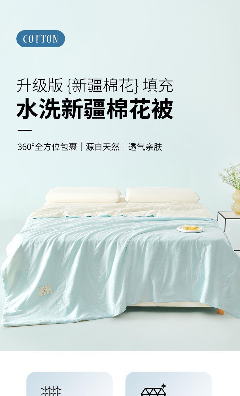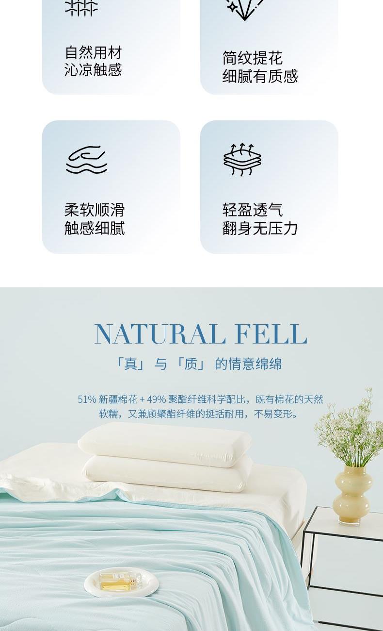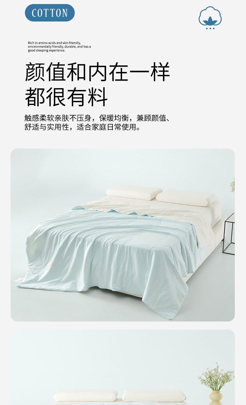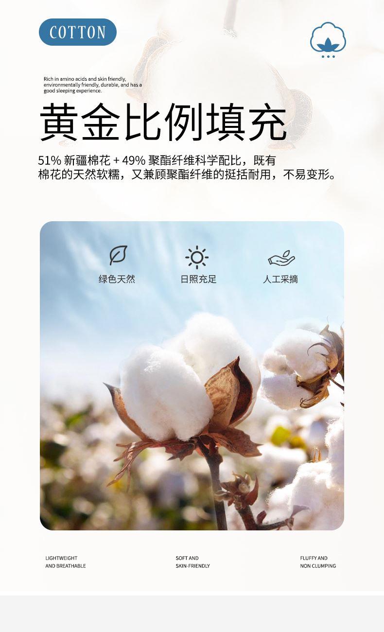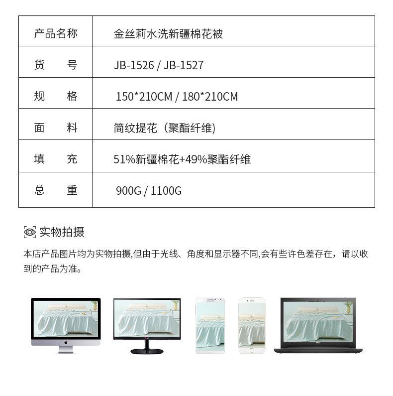 货 号: JB-1526 规 格: 150×210cm 面 料: 简纹提花 填 充: 51%新疆棉花+49%聚酯纤维 总 重: 900G 产品卖点—— 1、51% 新疆棉花+49%聚酯纤维科学配比,既有棉花的天然软糯,又有亲肤肌肤的舒适性。 2、简纹提花面料,精致耐看,面料采用简纹提花工艺,纹理细腻有质感,聚酯纤维材质耐磨抗皱,提升床品档次。 3、触感柔软亲肤不压身,保暖均衡,兼顾颜值、舒适与实用性,适合家庭日常使用。
