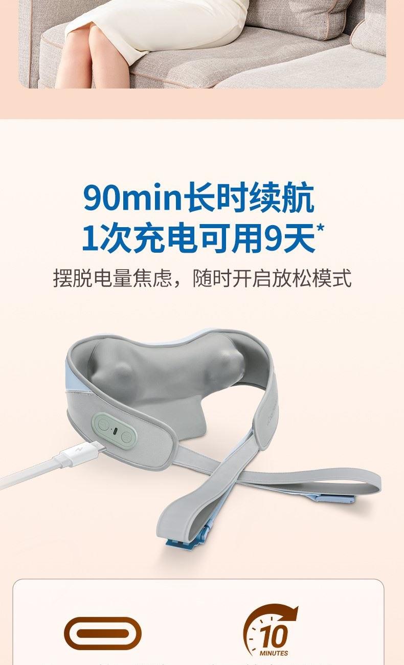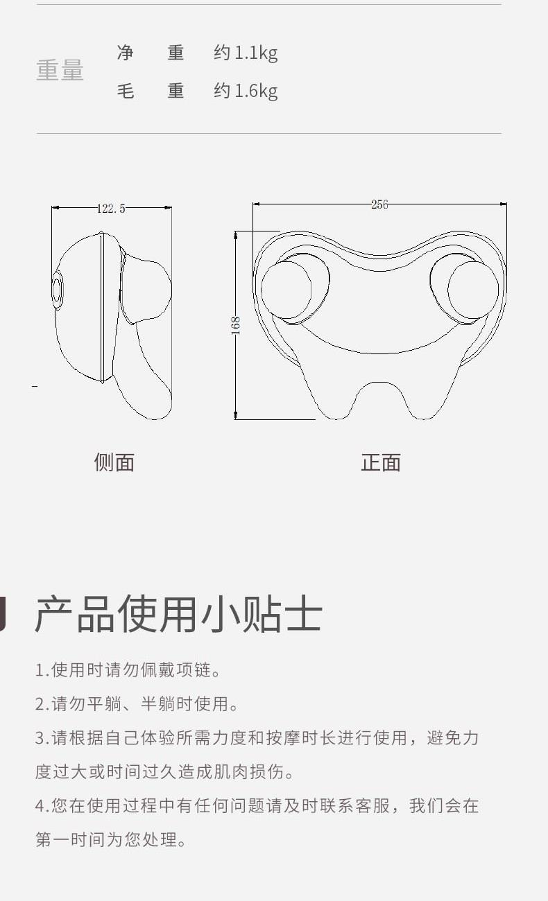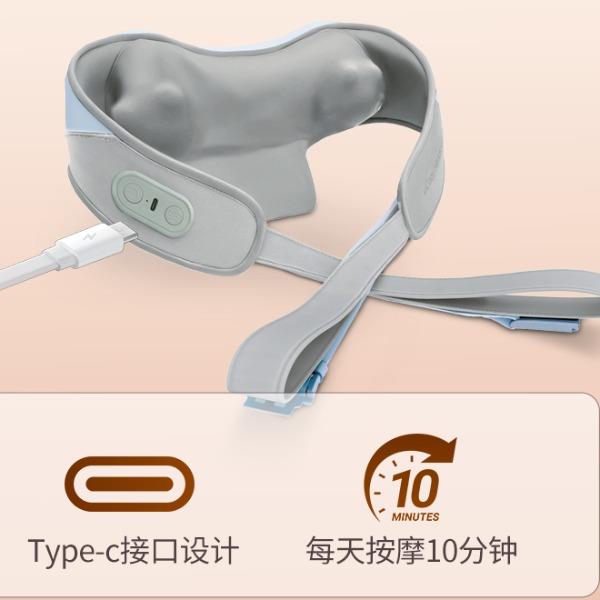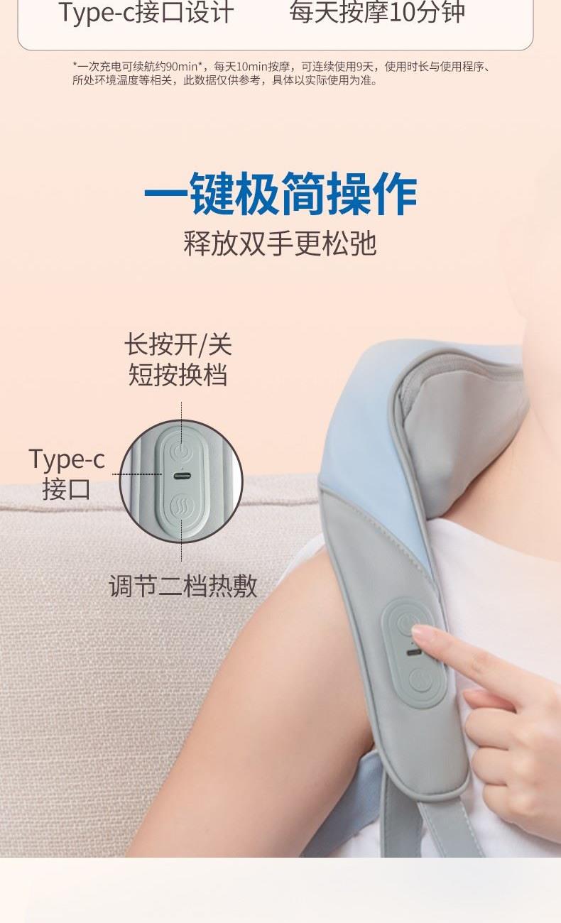 消耗功率:5V-2AUSB输入 产品尺寸:56(长)x28(宽)x17(高)cm 自动定时:10min 净重:约1.1kg 毛重:约1.6kg 1、轻享如羽,劲揉到位;轻松佩戴不压肩 2、V手抓捏解放双手温感热敷,无压佩戴体验,深层舒缓颈肩 3、无线操作,轻巧便携,一机多用,多场景适用 4、90min长时续航,轻量级1020g,可拆洗,Type-c接口设计