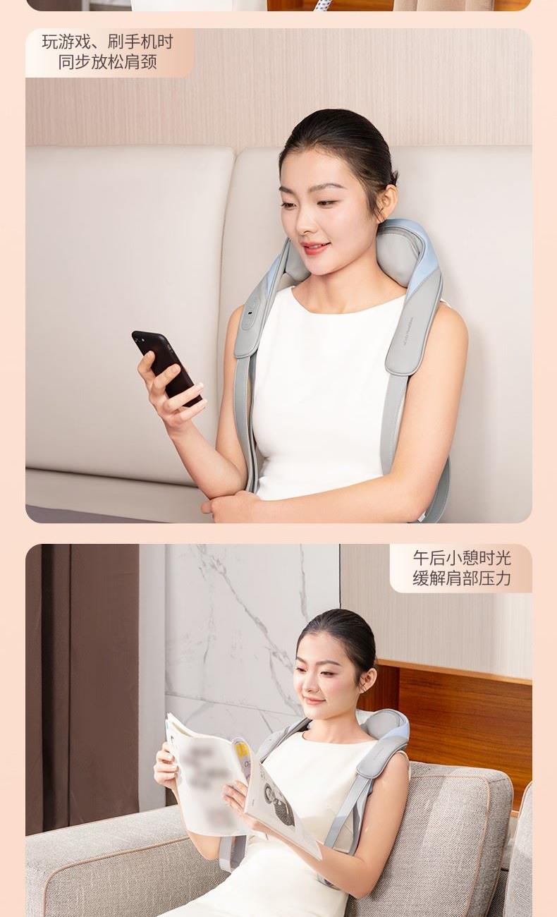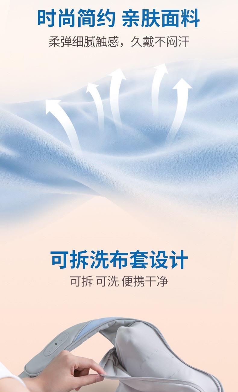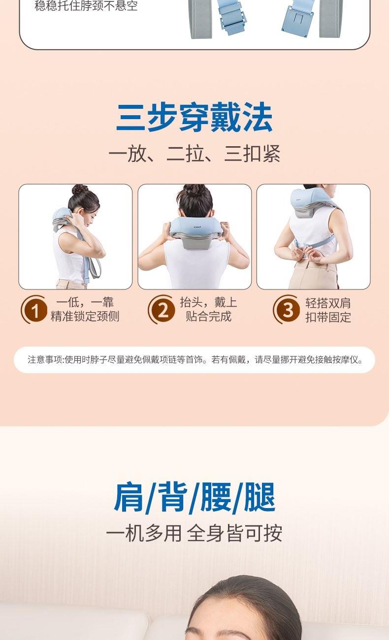 消耗功率:5V-2AUSB输入 产品尺寸:56(长)x28(宽)x17(高)cm 自动定时:10min 净重:约1.1kg 毛重:约1.6kg 1、轻享如羽,劲揉到位;轻松佩戴不压肩 2、V手抓捏解放双手温感热敷,无压佩戴体验,深层舒缓颈肩 3、无线操作,轻巧便携,一机多用,多场景适用 4、90min长时续航,轻量级1020g,可拆洗,Type-c接口设计