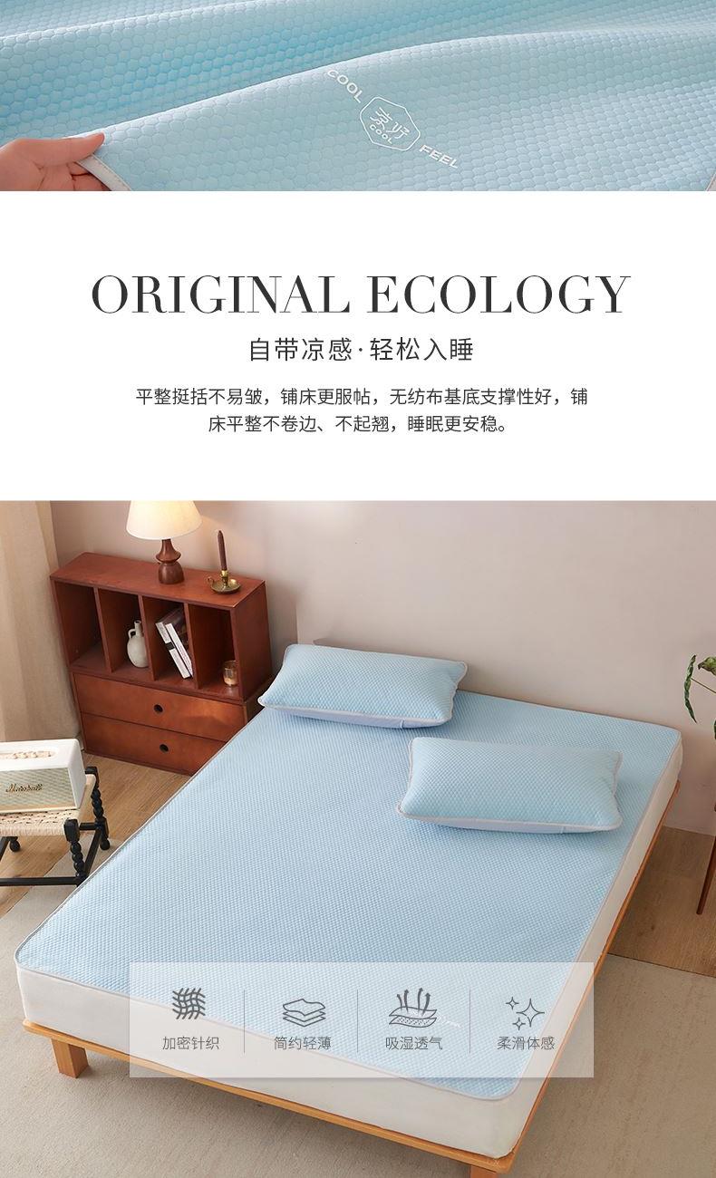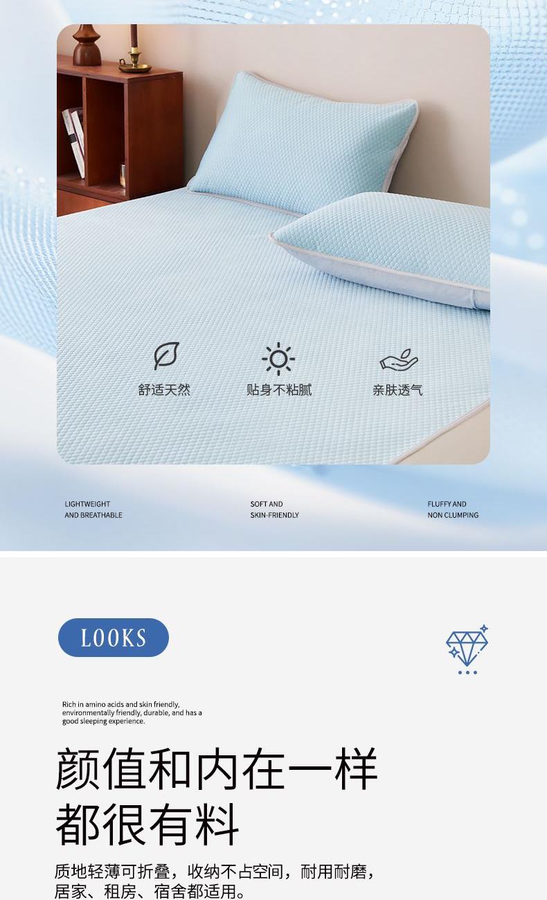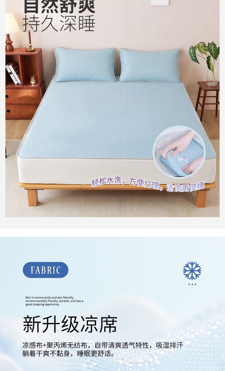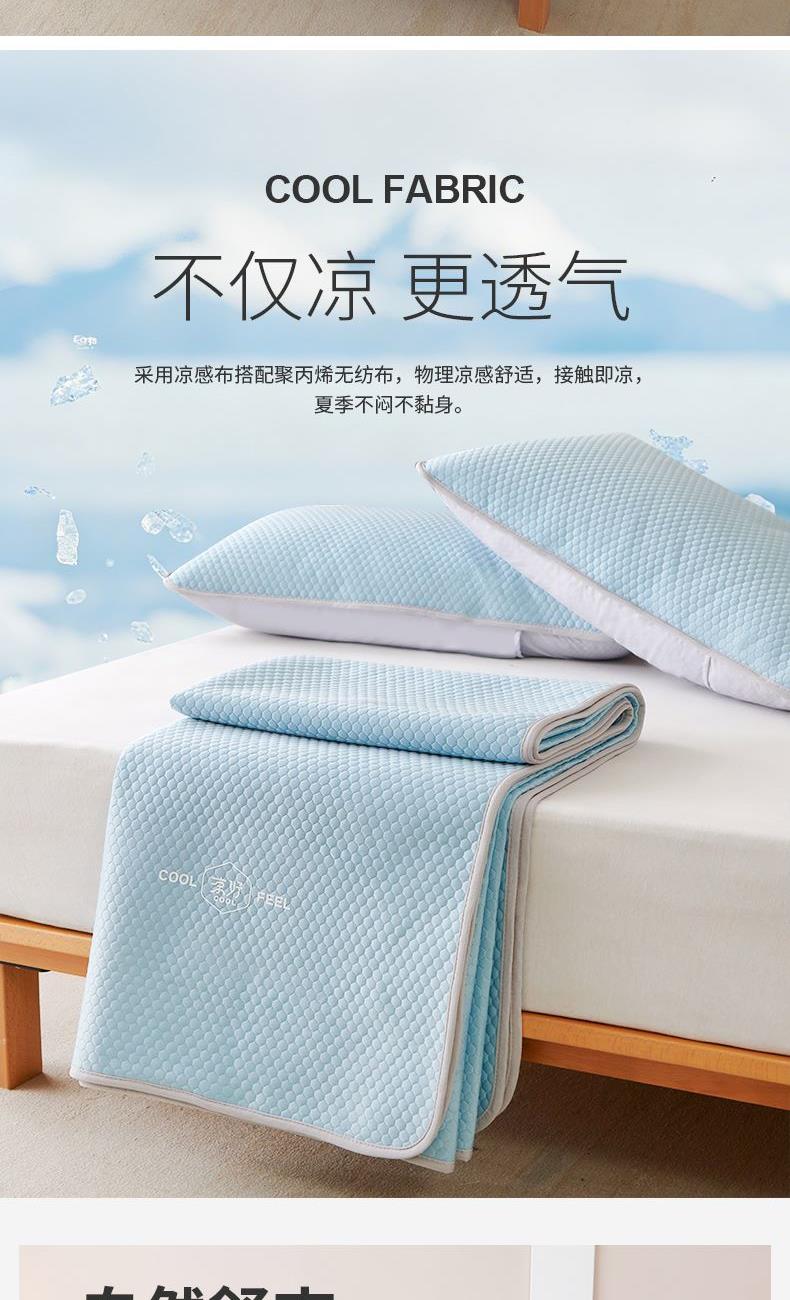 规 格: 席 180×200±2cm 枕套 48×74cm×2 面 料: 凉感布+聚丙烯无纺布 产品卖点—— 1.采用凉感布搭配聚丙烯无纺布,物理凉感舒适,接触即凉,夏季不闷不黏身。 2.平整挺括不易皱,铺床更服帖,无纺布基底支撑性好,铺床平整不卷边、不起翘,睡眠更安稳。 3.质地轻薄可折叠,收纳不占空间,耐用耐磨,居家、租房、宿舍都适用。