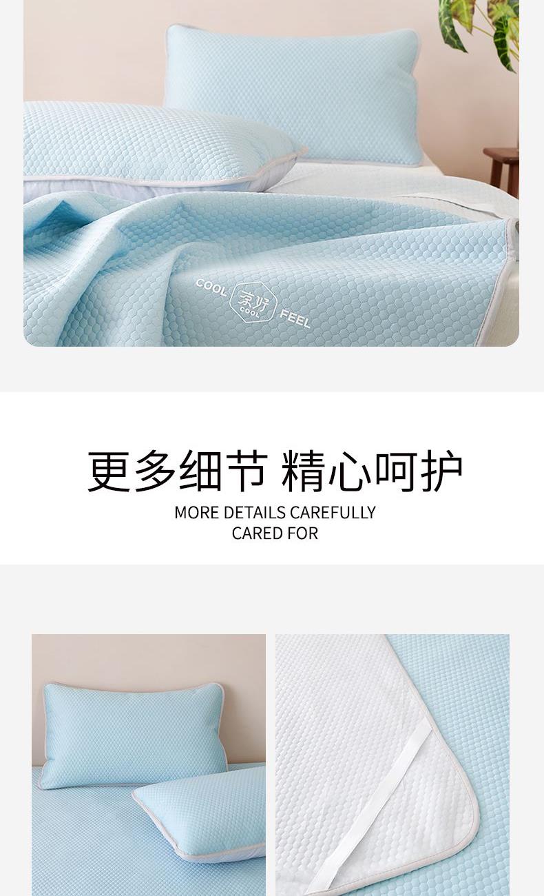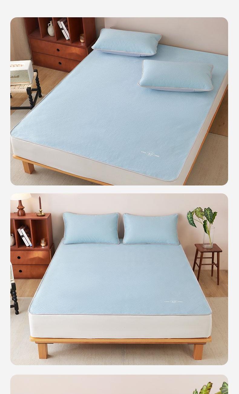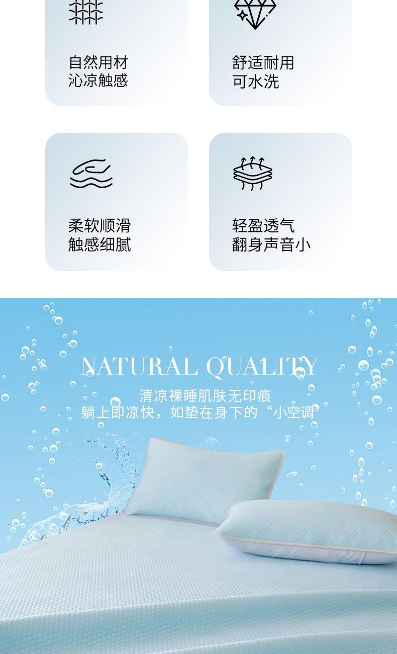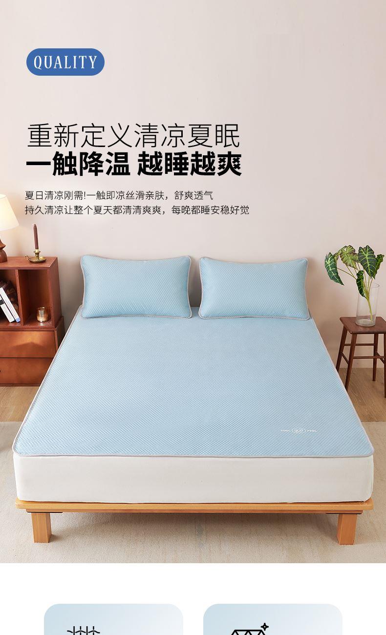 规 格: 席 180×200±2cm 枕套 48×74cm×2 面 料: 凉感布+聚丙烯无纺布 产品卖点—— 1.采用凉感布搭配聚丙烯无纺布,物理凉感舒适,接触即凉,夏季不闷不黏身。 2.平整挺括不易皱,铺床更服帖,无纺布基底支撑性好,铺床平整不卷边、不起翘,睡眠更安稳。 3.质地轻薄可折叠,收纳不占空间,耐用耐磨,居家、租房、宿舍都适用。