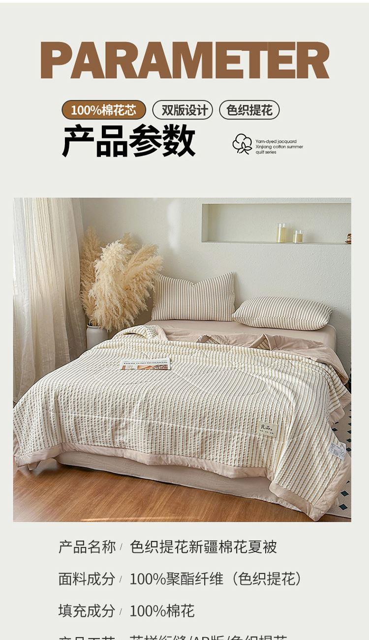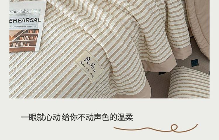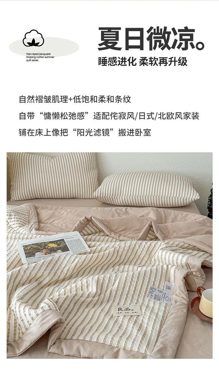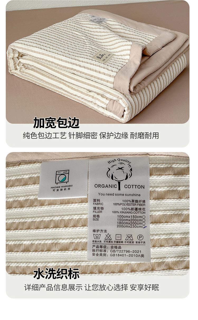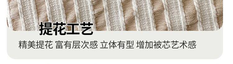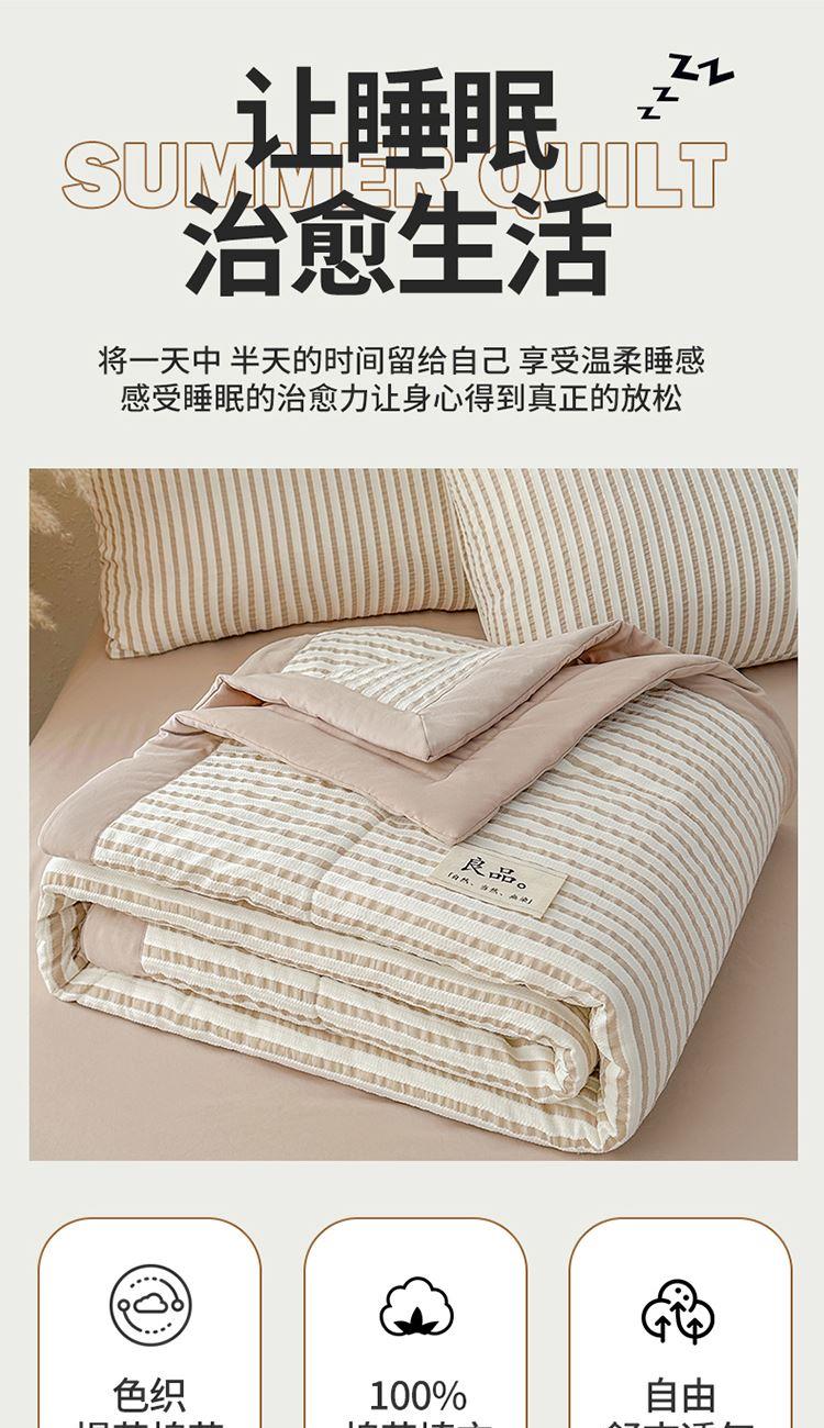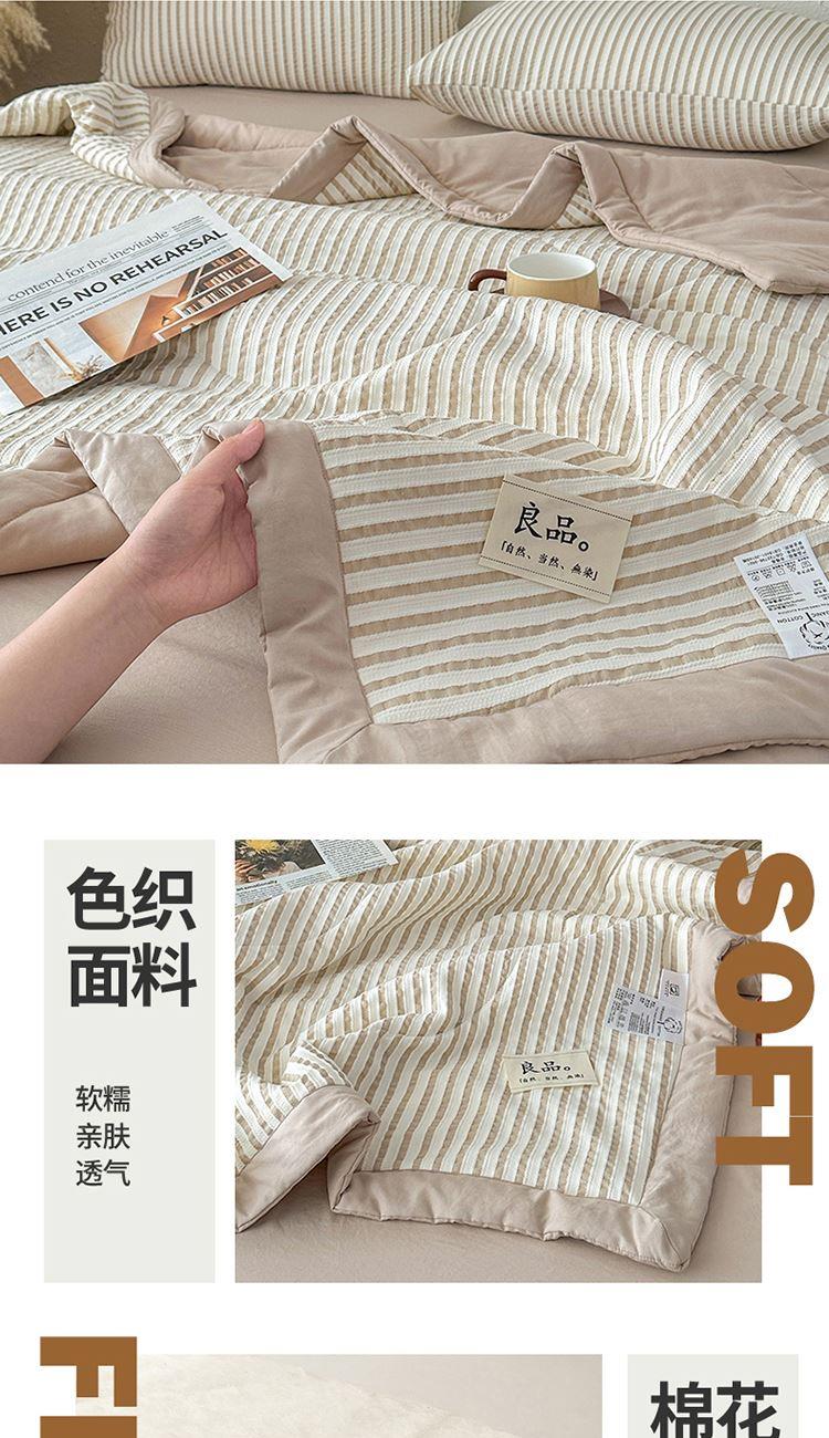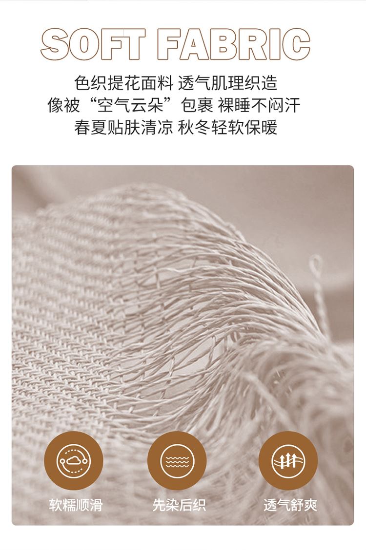 自然褶皱肌理+低饱和柔和条纹,自带“慵懒松弛感”适配侘寂风。 透气肌理织造,像被“空气云朵”包裹,裸睡不闷汗。适合偏爱清爽感的用户,满足不同季节/偏好需求。 活性印染的低饱和色系,久洗不串色、不发硬,褶皱肌理越洗越自然,不用费心熨烫也有“随性好看”的松弛。 面料:聚酯纤维 填充:新疆棉花 尺寸:150*200cm
