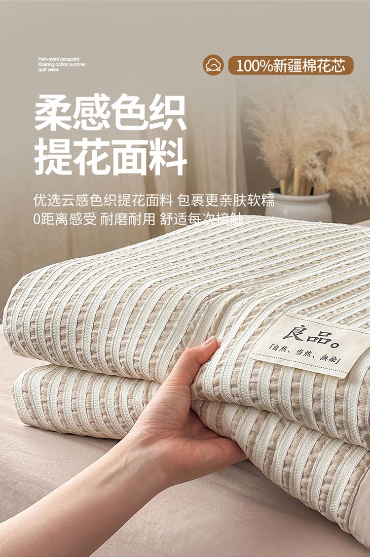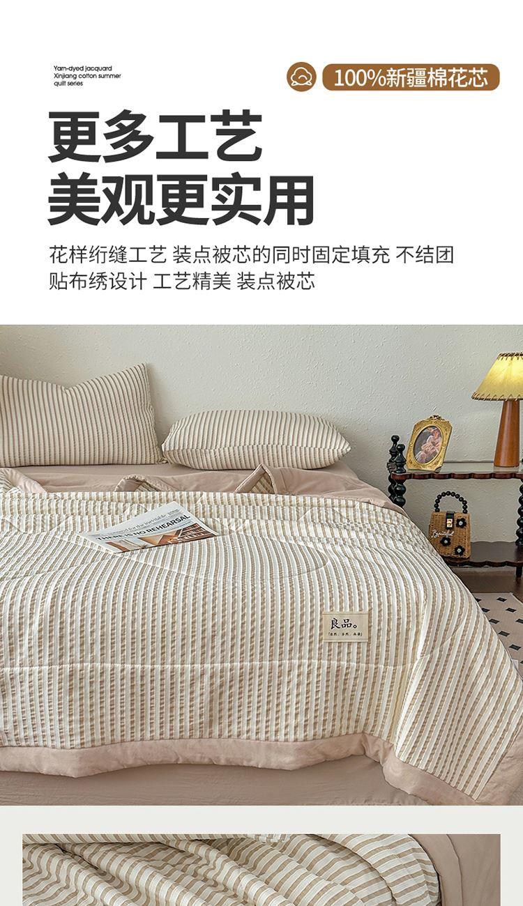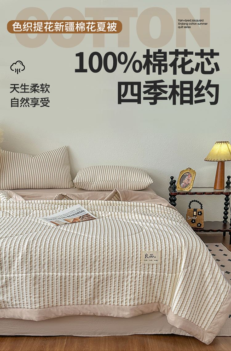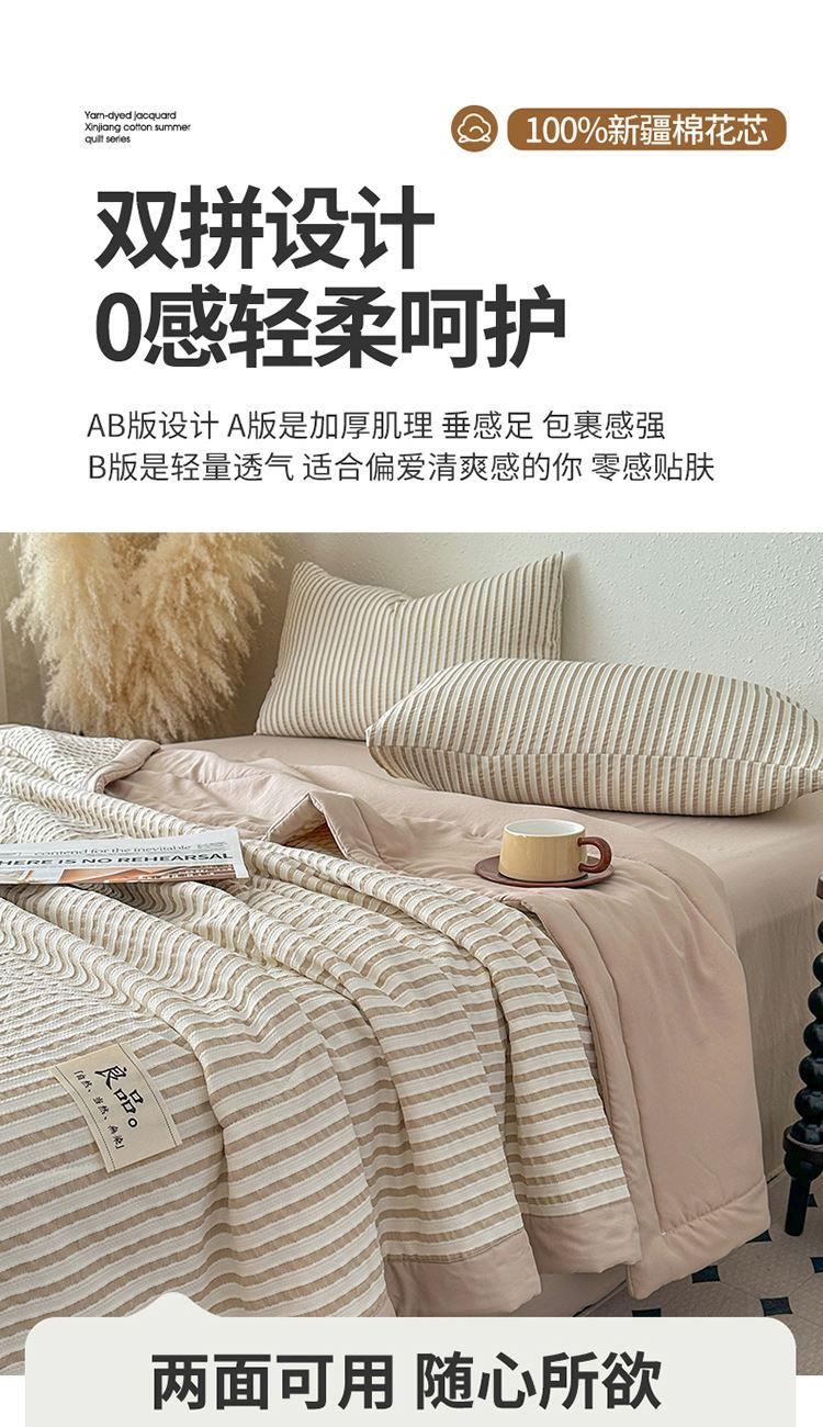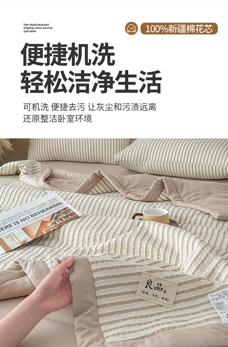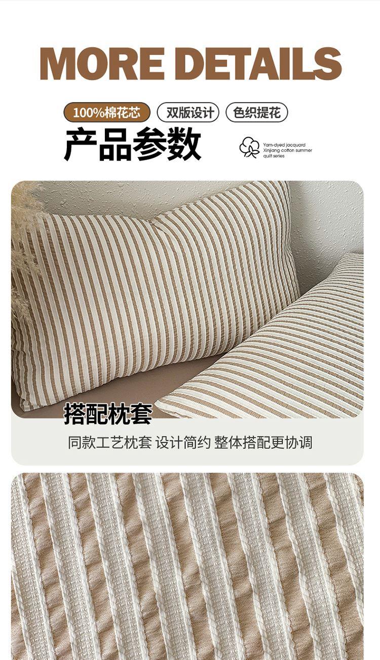 自然褶皱肌理+低饱和柔和条纹,自带“慵懒松弛感”适配侘寂风。 透气肌理织造,像被“空气云朵”包裹,裸睡不闷汗。适合偏爱清爽感的用户,满足不同季节/偏好需求。 活性印染的低饱和色系,久洗不串色、不发硬,褶皱肌理越洗越自然,不用费心熨烫也有“随性好看”的松弛。 面料:聚酯纤维 填充:新疆棉花 尺寸:150*200cm