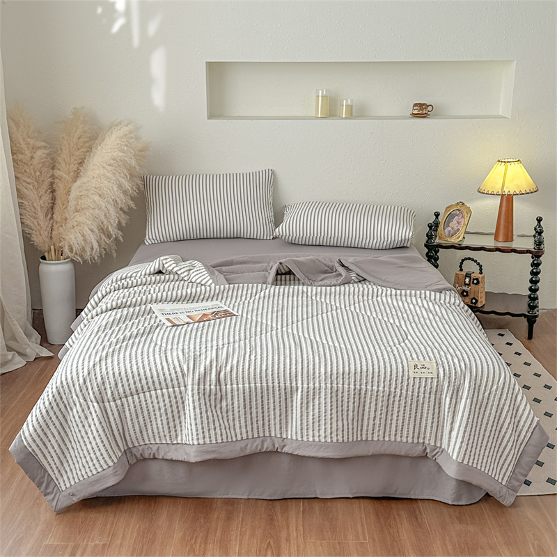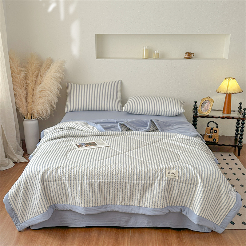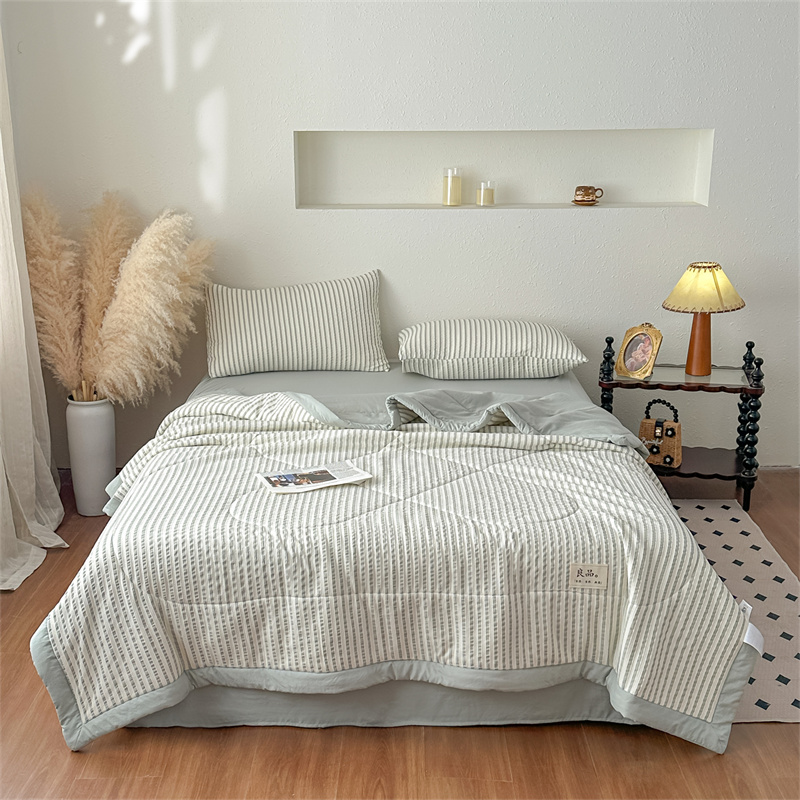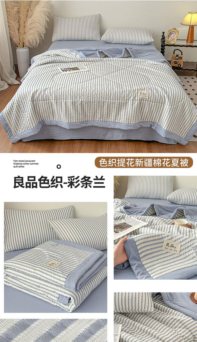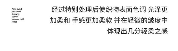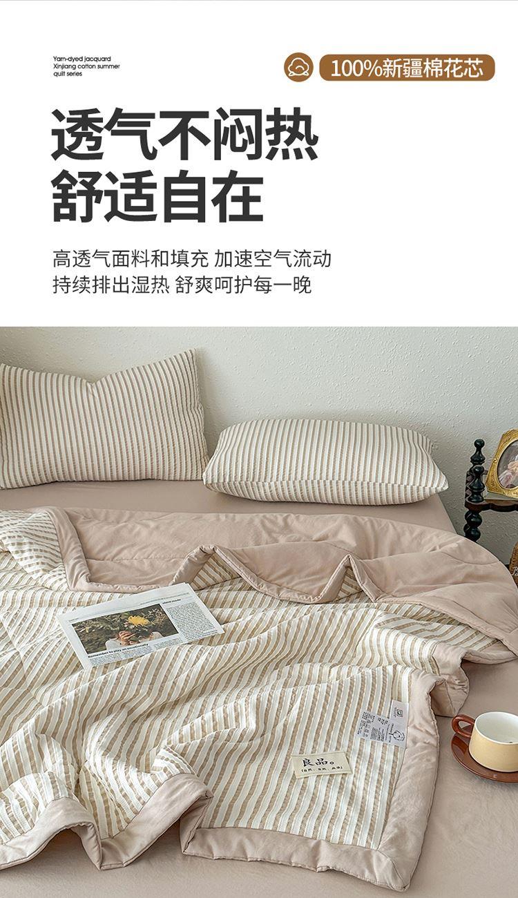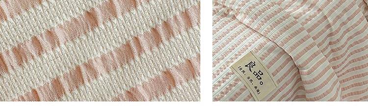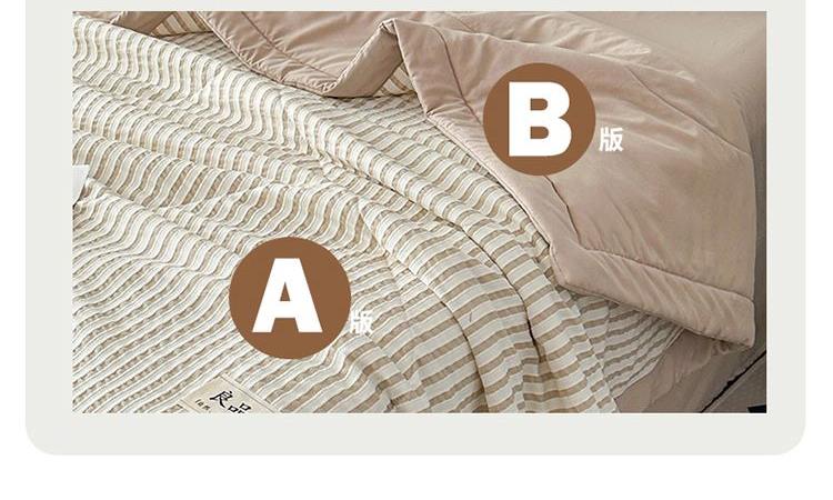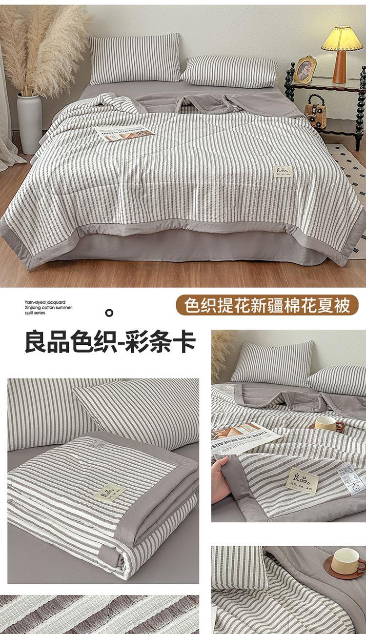 自然褶皱肌理+低饱和柔和条纹,自带“慵懒松弛感”适配侘寂风。 透气肌理织造,像被“空气云朵”包裹,裸睡不闷汗。适合偏爱清爽感的用户,满足不同季节/偏好需求。 活性印染的低饱和色系,久洗不串色、不发硬,褶皱肌理越洗越自然,不用费心熨烫也有“随性好看”的松弛。 面料:聚酯纤维 填充:新疆棉花 尺寸:150*200cm