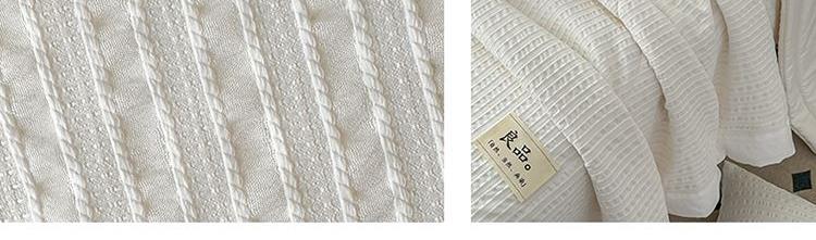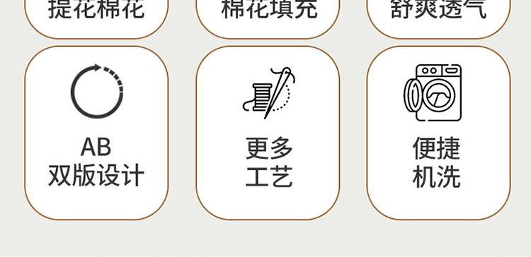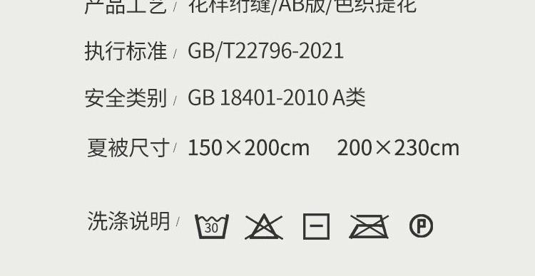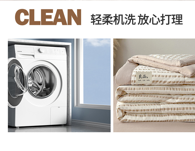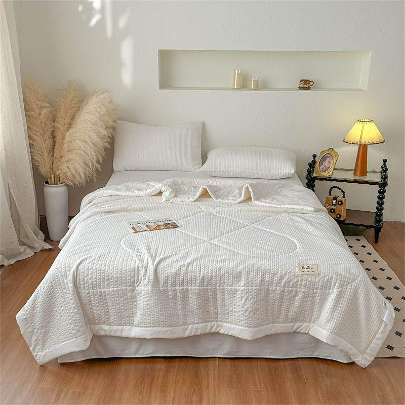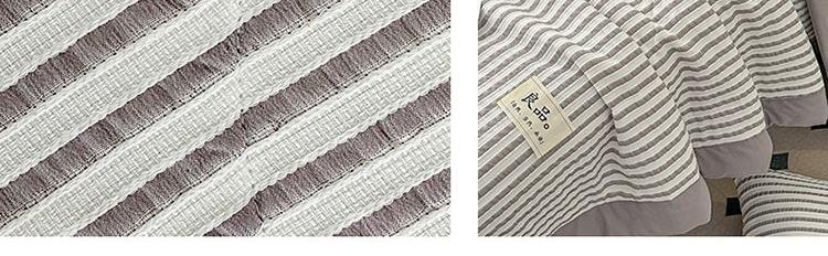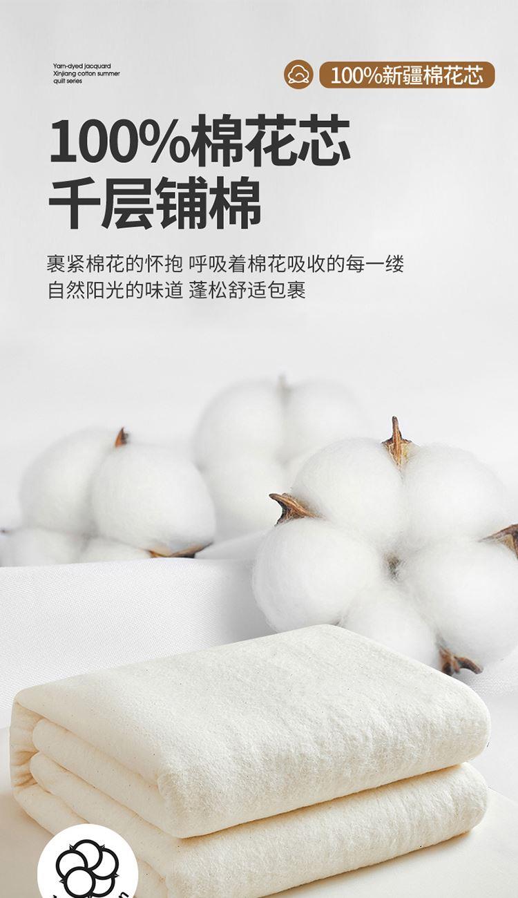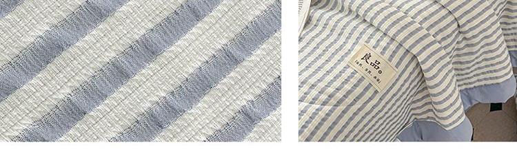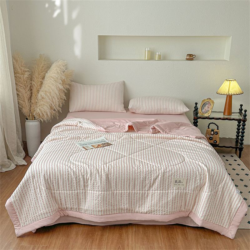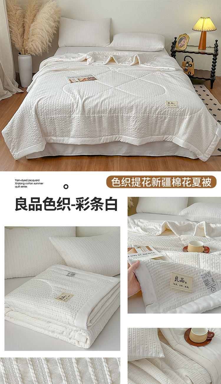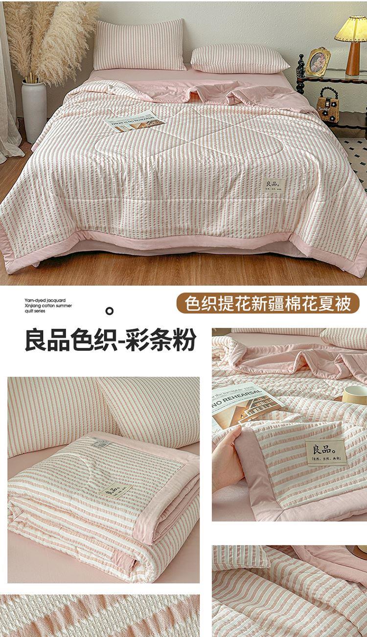 自然褶皱肌理+低饱和柔和条纹,自带“慵懒松弛感”适配侘寂风。 透气肌理织造,像被“空气云朵”包裹,裸睡不闷汗。适合偏爱清爽感的用户,满足不同季节/偏好需求。 活性印染的低饱和色系,久洗不串色、不发硬,褶皱肌理越洗越自然,不用费心熨烫也有“随性好看”的松弛。 面料:聚酯纤维 填充:新疆棉花 尺寸:150*200cm