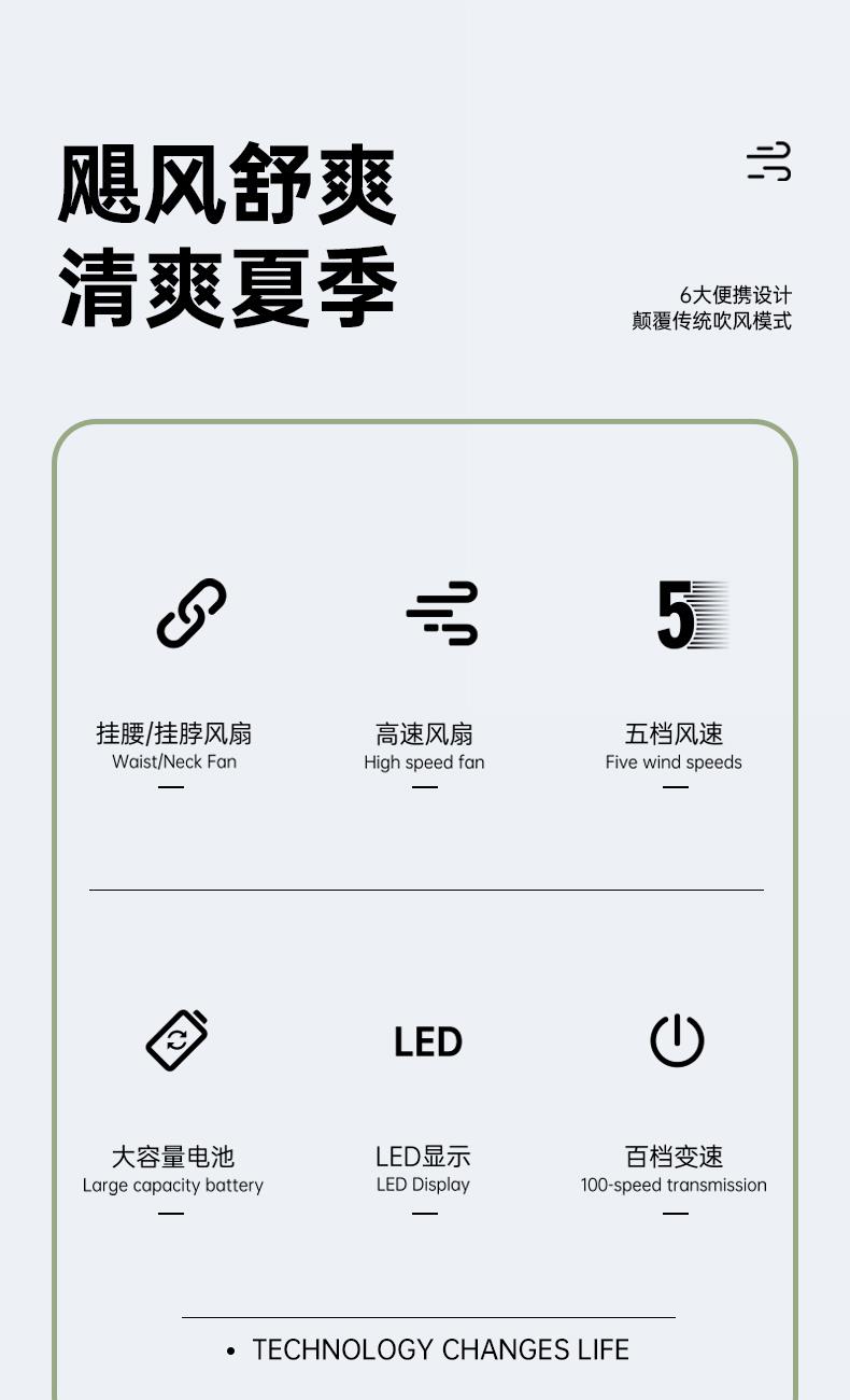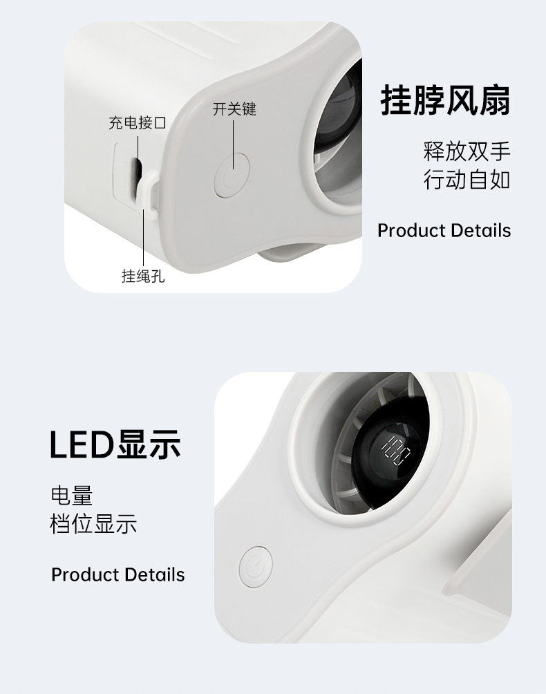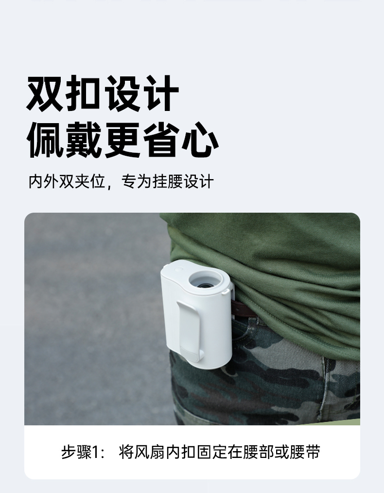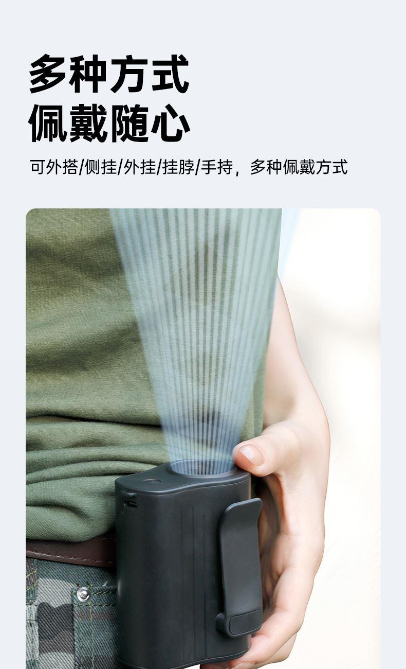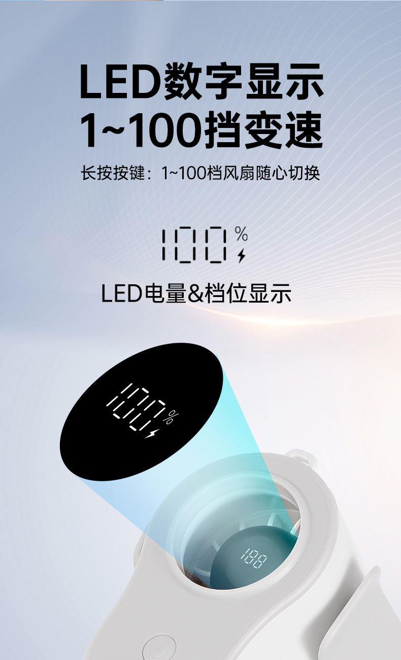 *100档风力调节,配挂绳可挂脖 *12500转速,LDE屏幕数显 *内外双夹专为挂腰设计,4000毫安电池容量