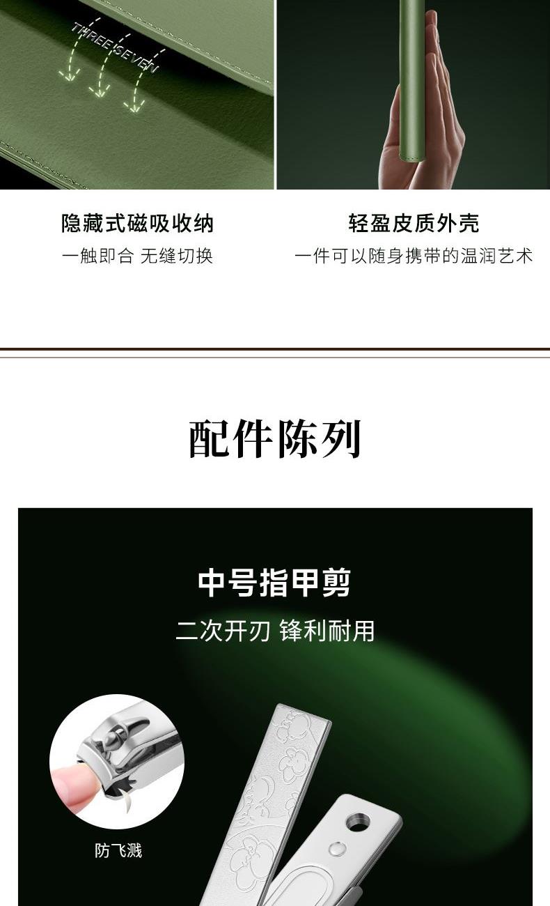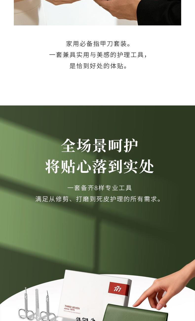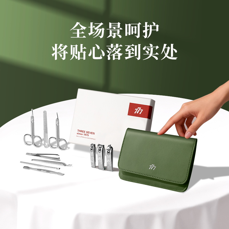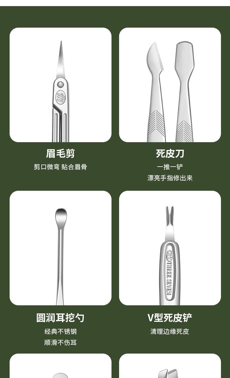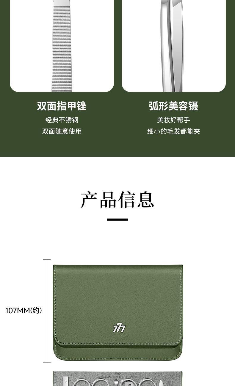 品 牌:THREE SEVEN/777 材 质:优质碳钢+PU皮套 规 格:106*142mm 产品颜色:绿色 套装内容:10件套(眉夹、中号平口指甲刀、中号斜口指甲刀、眉剪、耳挖、锉片、鼻毛剪、幼儿指甲钳、死皮推、死皮铲)