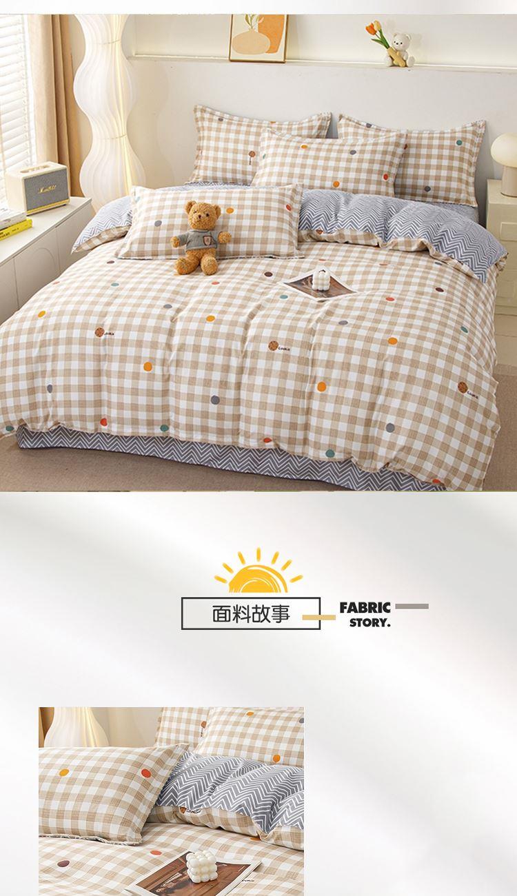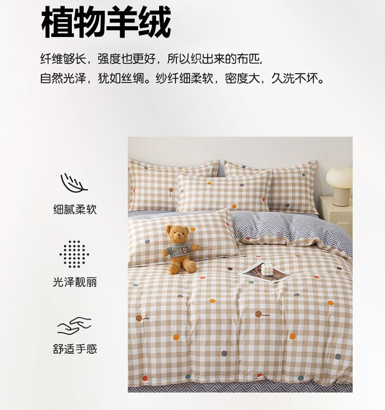 被套:200*230cm 床单:230*235cm 枕套:48*74cm*2 面料:植物羊绒 执行标准:GB/T22796-2021 安全类别:GB18401-2010 B类 1.优质面料,纤维韧性强,拉力强度高,透气舒适贴身。种植物纤维织物,手感柔软,舒适质感丰厚,而且有厚重感,不褪色,不缩水,容易打理。 2.做工精制细腻,美观大方,朴实耐用,是您享受健康科技睡眠的必选佳品
