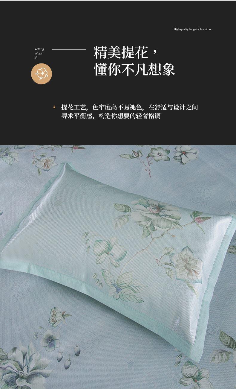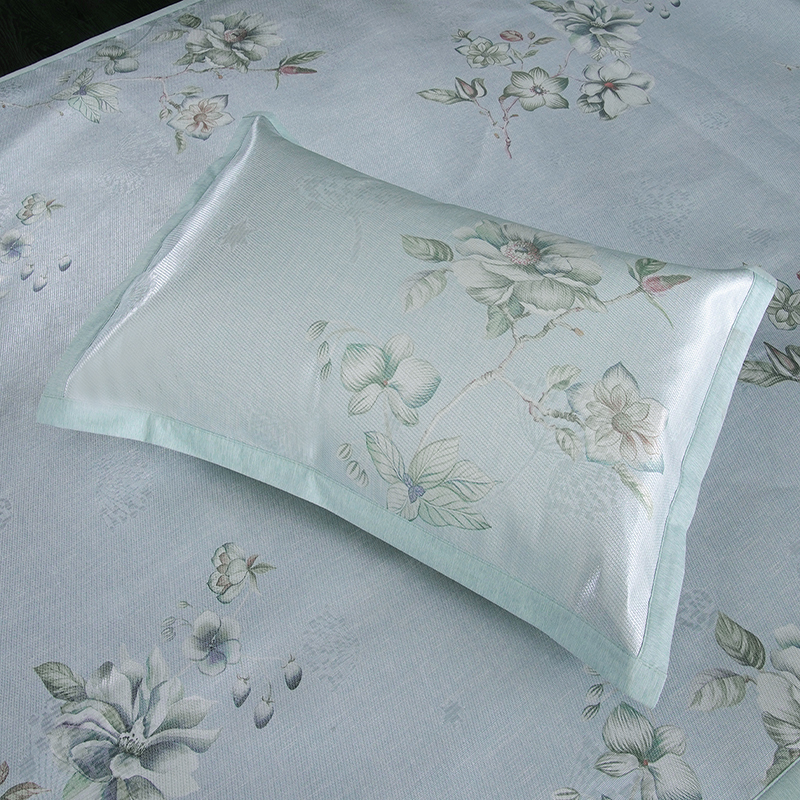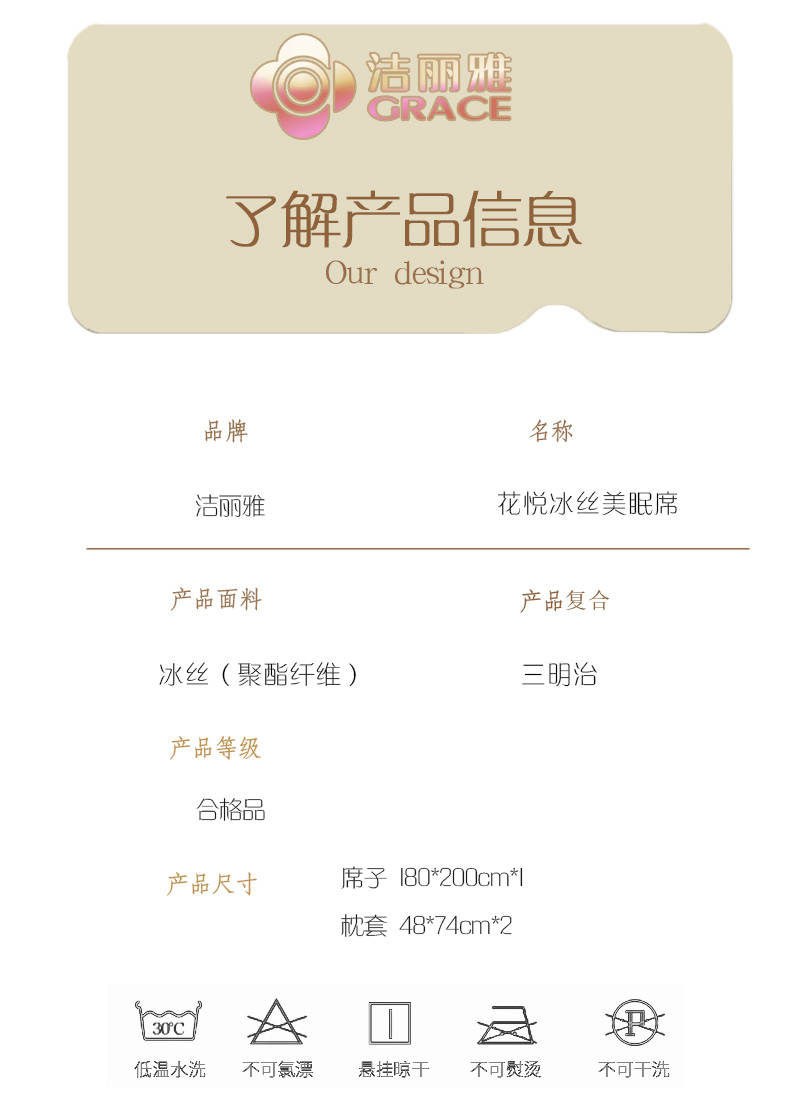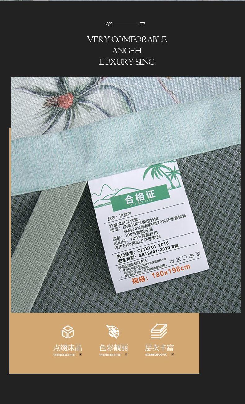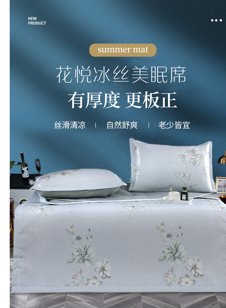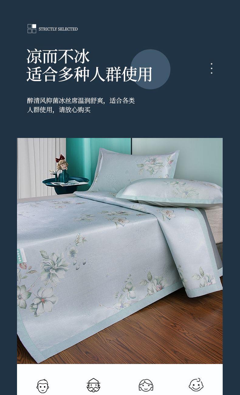 规格:180*200cm 枕套:48*74cm*2 面料:冰丝 复合料:三明治 执行标准:Q/TDY 01-2016 安全类别:GB18401-2010 B类 1.冰丝纤维自带降温功能,躺上体感温度直降3-5°C,再燥热的夏天,也抵不过它的丝滑舒爽,取材自然纤维,触感超柔软,细滑贴合肌肤,睡眠无拘束,触肤凉而不冰并且有良好的散热性能。