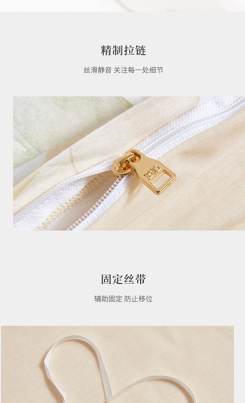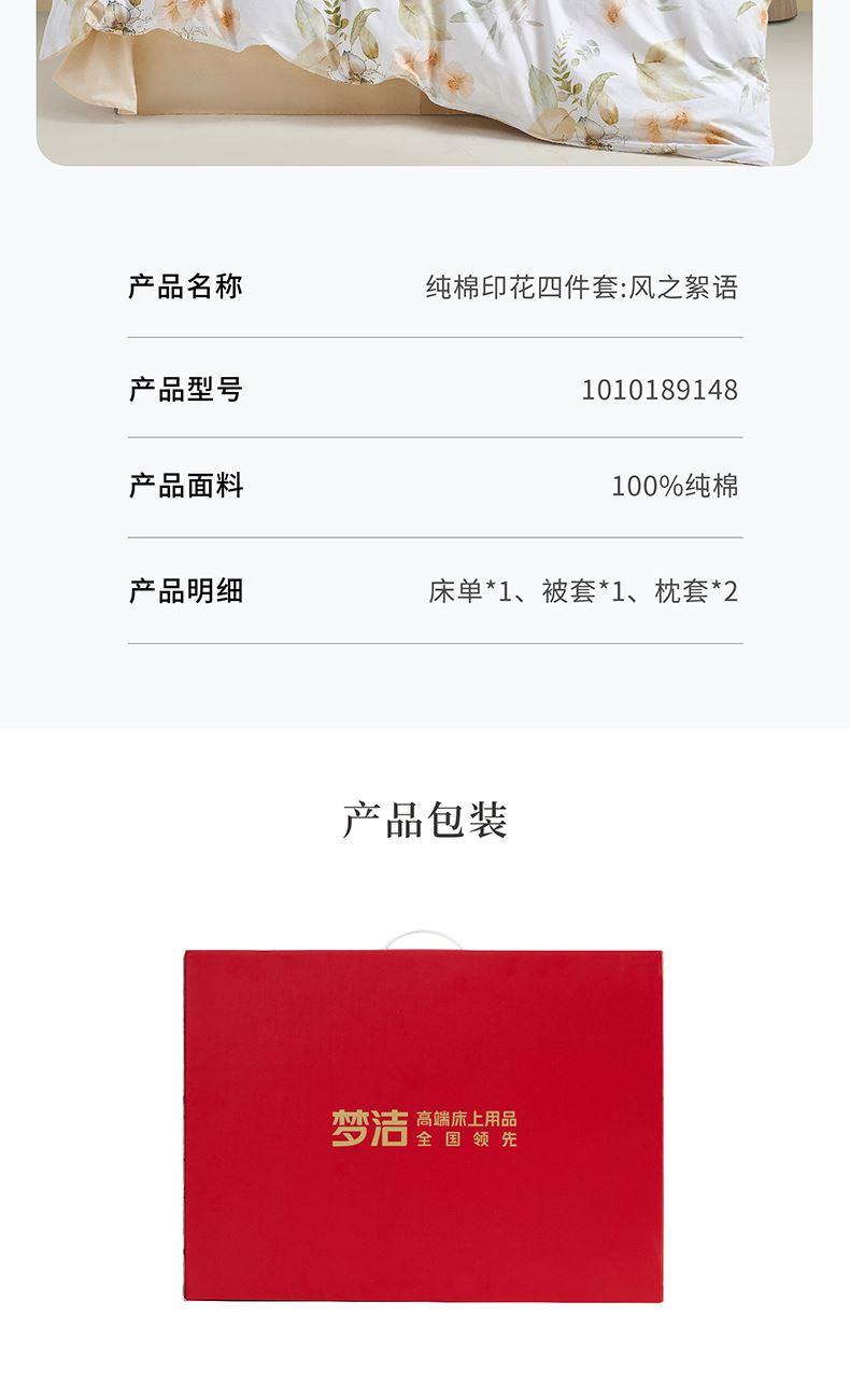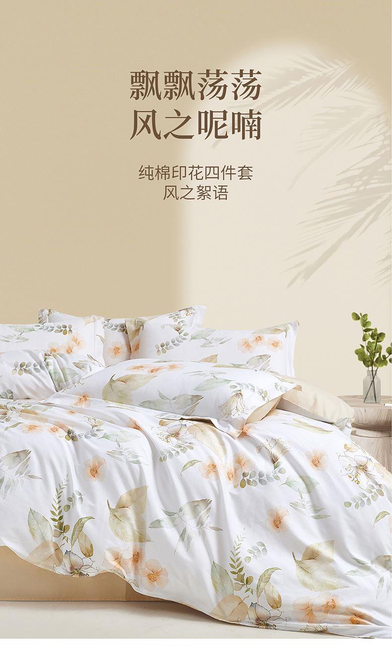 面 料:棉 尺 寸:被套:200×230cm 床单:245×230cm 短枕:50×70cm×2 整体色彩:白色为底布,融合了浅米色的花朵、不同层次的浅绿色叶片(,还有细碎的绿色枝叶点缀其中。色彩柔和朦胧,风格淡雅,充满自然气息,能为空间营造出宁静、舒适的氛围。 面料:选用优质棉花,经严格工序,梳去较短纤维,去除杂质,使棉花更有韧性,更不易起球。面料柔软平整,亲肤细腻,透气性佳。 工艺:精简的四件套组合,短枕大气。