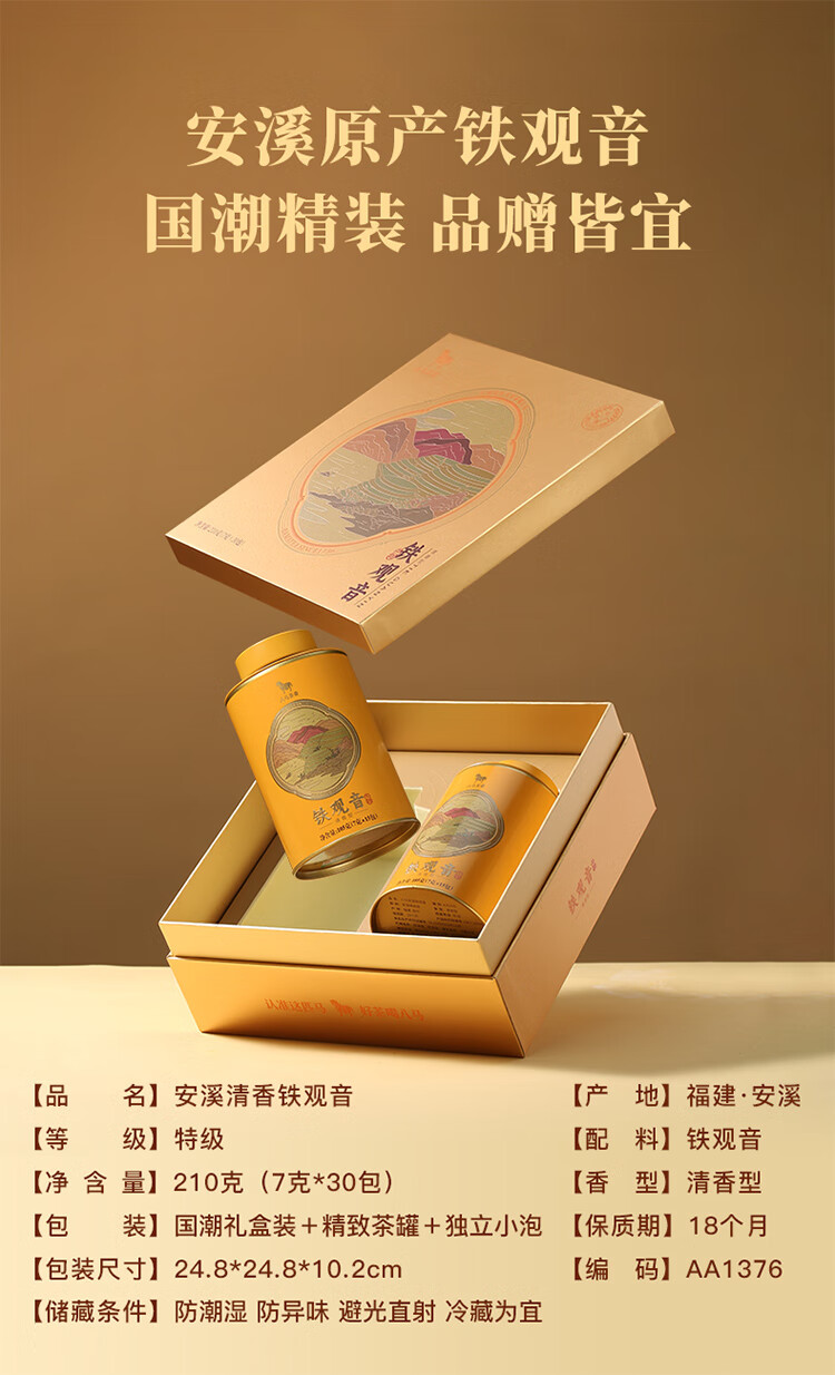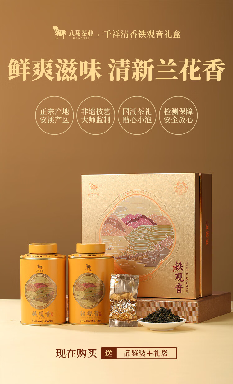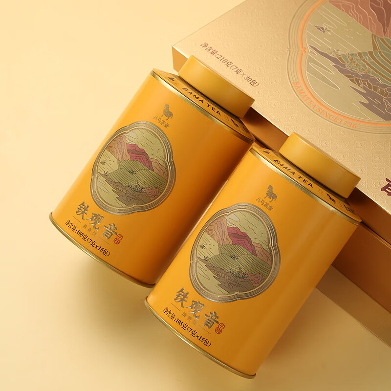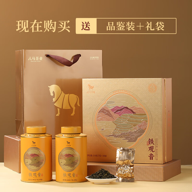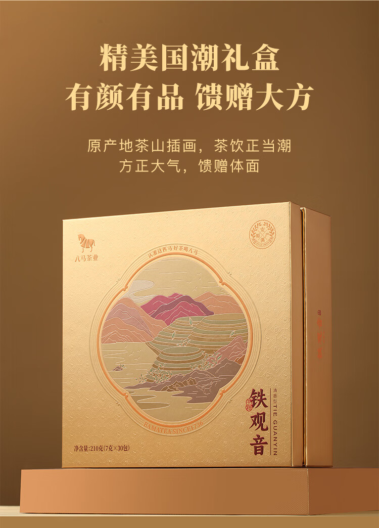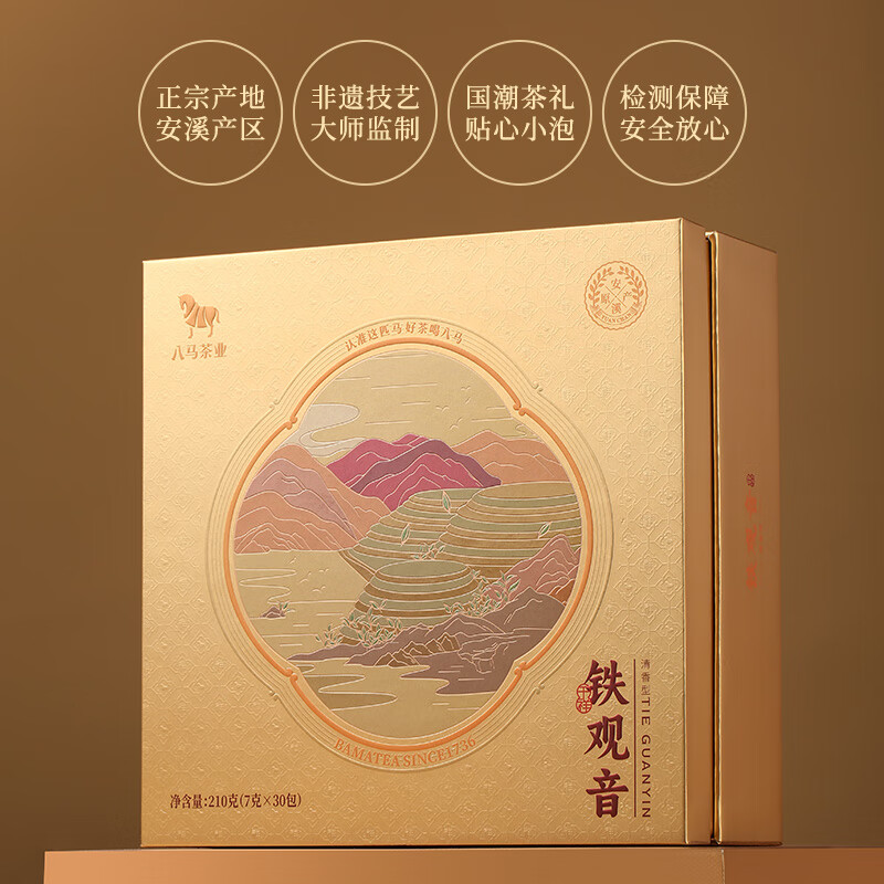 【编码】AA1376 【包装尺寸】24.8*24.8*10.2cm 【净 含 量】7克*30包 【保 质 期】18个月 【包装】精装礼盒装 【储藏条件】防潮湿,防异味,避光直射 推荐理由: 安溪核心产区:正宗高山原料,自带天然兰香,砂绿紧结、白毫显。 非遗轻发酵:八马非遗工艺,低焙火锁鲜,兰香清雅、鲜爽回甘、无涩感。 独立小泡 + 礼盒:30 包 ×7g,一次一泡;红色烫金礼盒,自饮 / 送礼体面。 保障:八马百年制茶,全链路品控,安全检测,喝得放心。