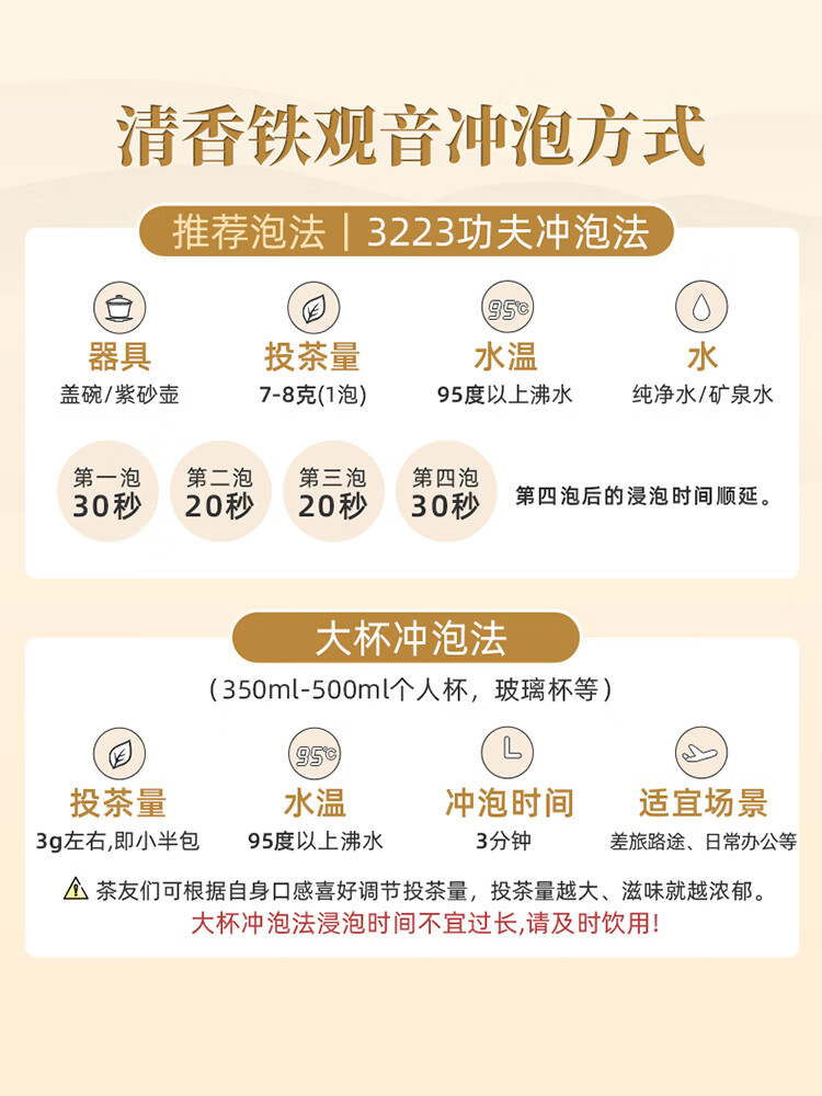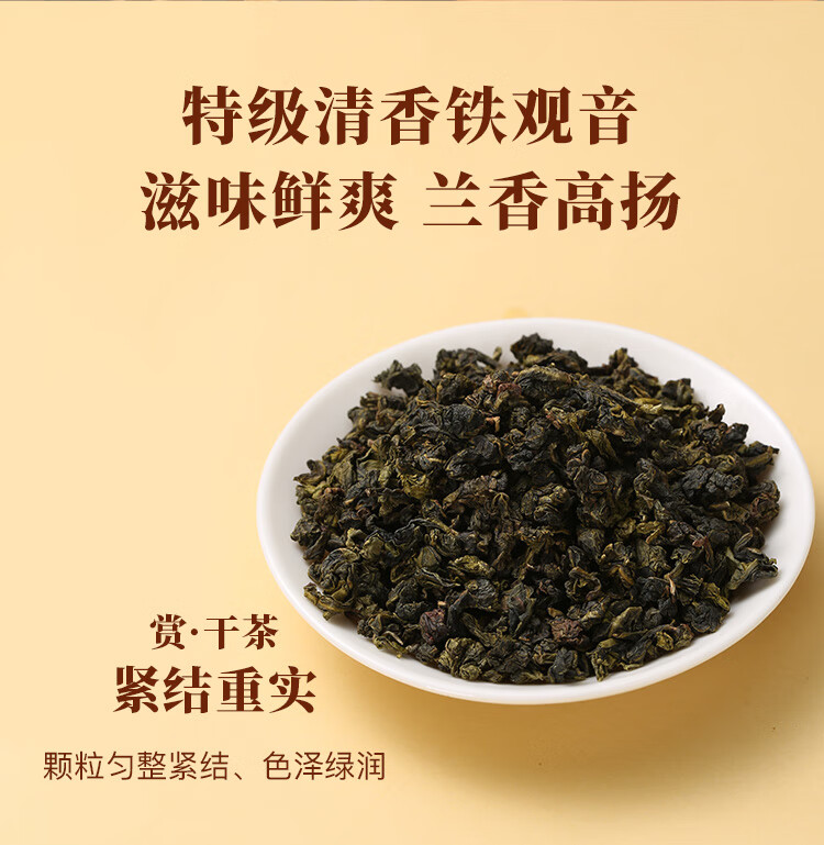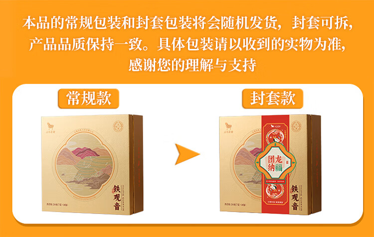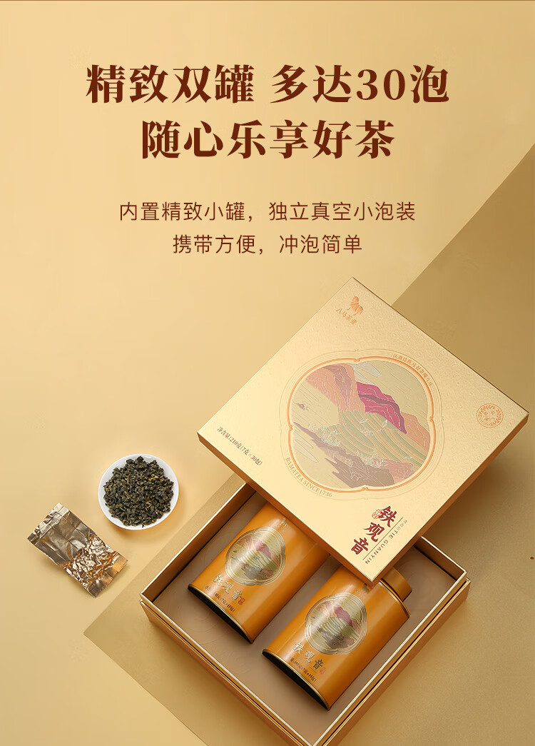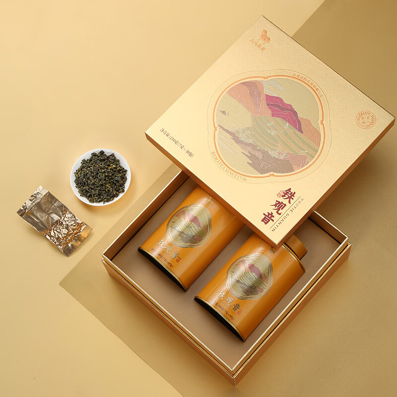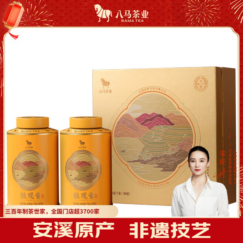 【编码】AA1376 【包装尺寸】24.8*24.8*10.2cm 【净 含 量】7克*30包 【保 质 期】18个月 【包装】精装礼盒装 【储藏条件】防潮湿,防异味,避光直射 推荐理由: 安溪核心产区:正宗高山原料,自带天然兰香,砂绿紧结、白毫显。 非遗轻发酵:八马非遗工艺,低焙火锁鲜,兰香清雅、鲜爽回甘、无涩感。 独立小泡 + 礼盒:30 包 ×7g,一次一泡;红色烫金礼盒,自饮 / 送礼体面。 保障:八马百年制茶,全链路品控,安全检测,喝得放心。