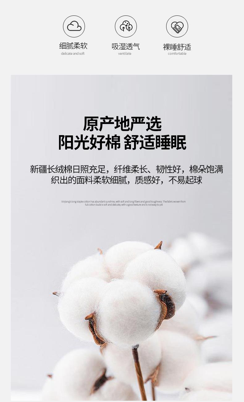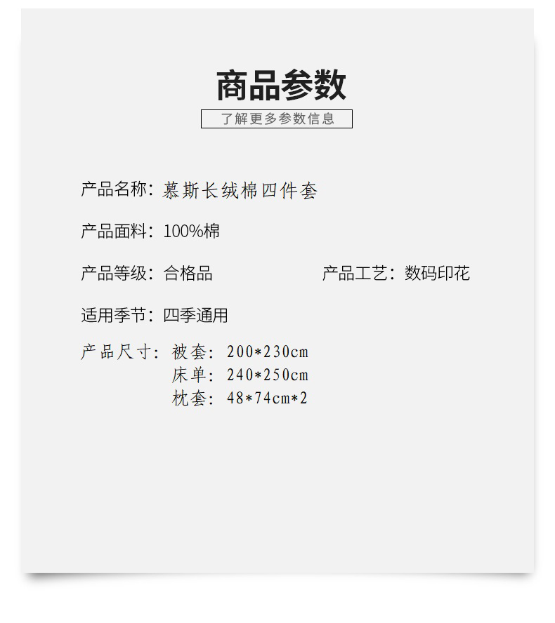 被套:200*230cm 床单:240*250cm 枕套:48*74cm*2 面料:100支长绒棉 产品包装:精美礼盒 产品特点: 采用长绒棉棉高密活性印染,洗后不易脱色、不变形、不起球,依然如新。绿色无污染,手感细腻柔软,经纬额度均匀,面料厚实不起球,不缩水。