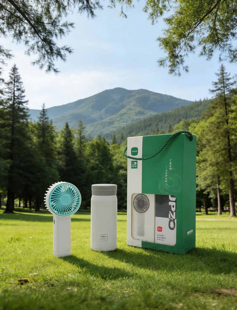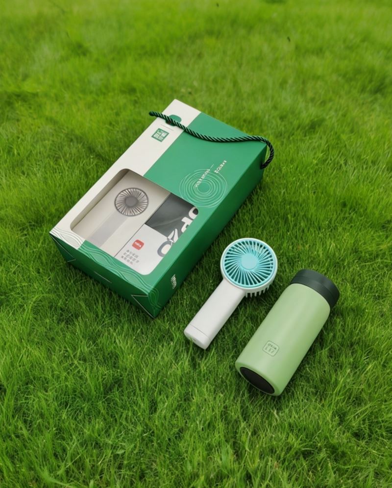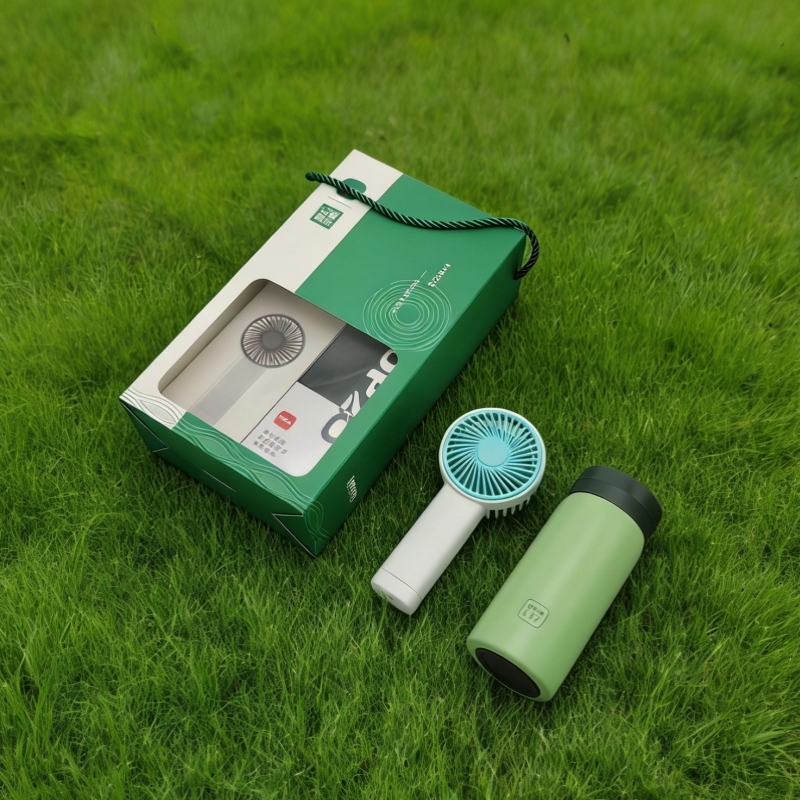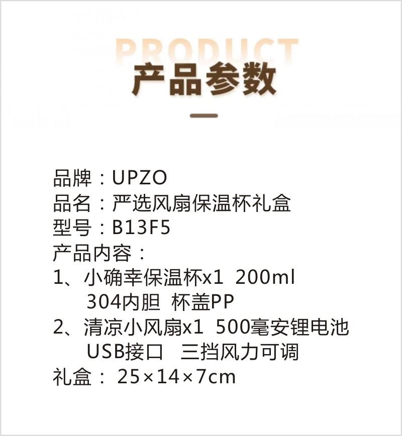 型号:B13F5 产品内容: 1、小确幸保温杯×1 304内胆 PP杯盖 200毫升容量 2、清凉小风扇*1 500毫安锂电池 USB接口 (续航时间90分钟左右 三挡风力可调) 礼盒规格:25*14*7CM 清凉小风扇 500毫安 续航90分钟左右 风力三挡 小确幸保温杯 200毫升口袋杯 撞色设计 304内胆