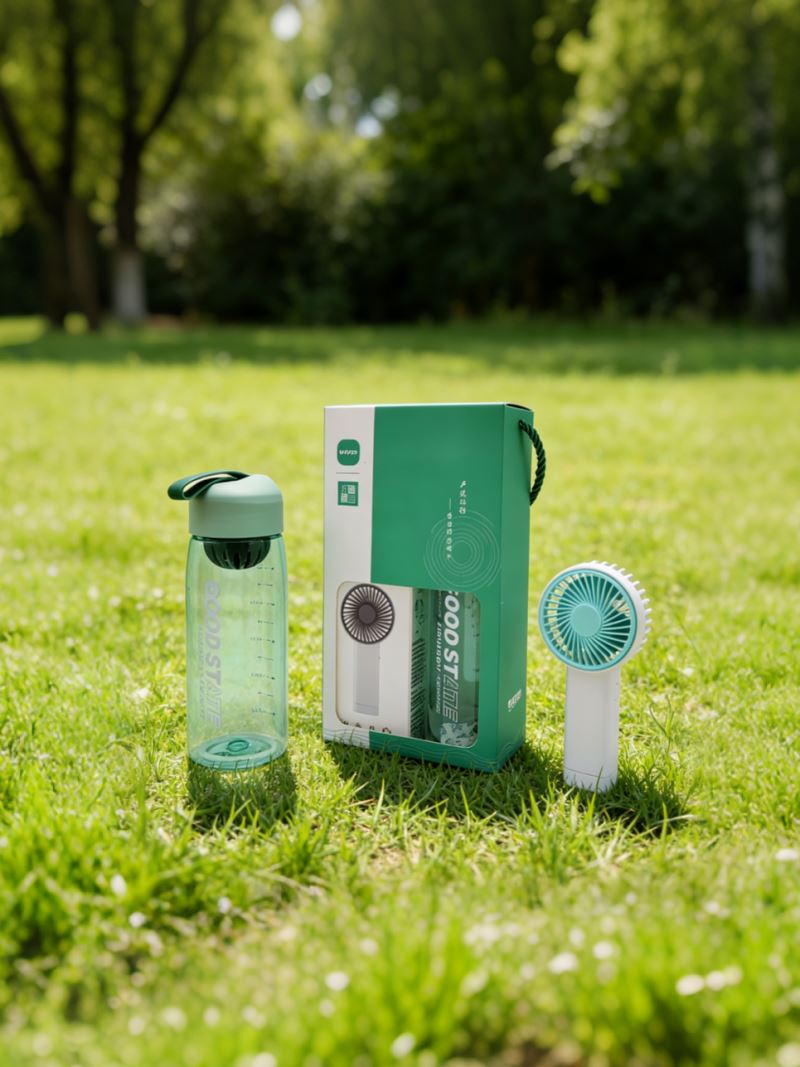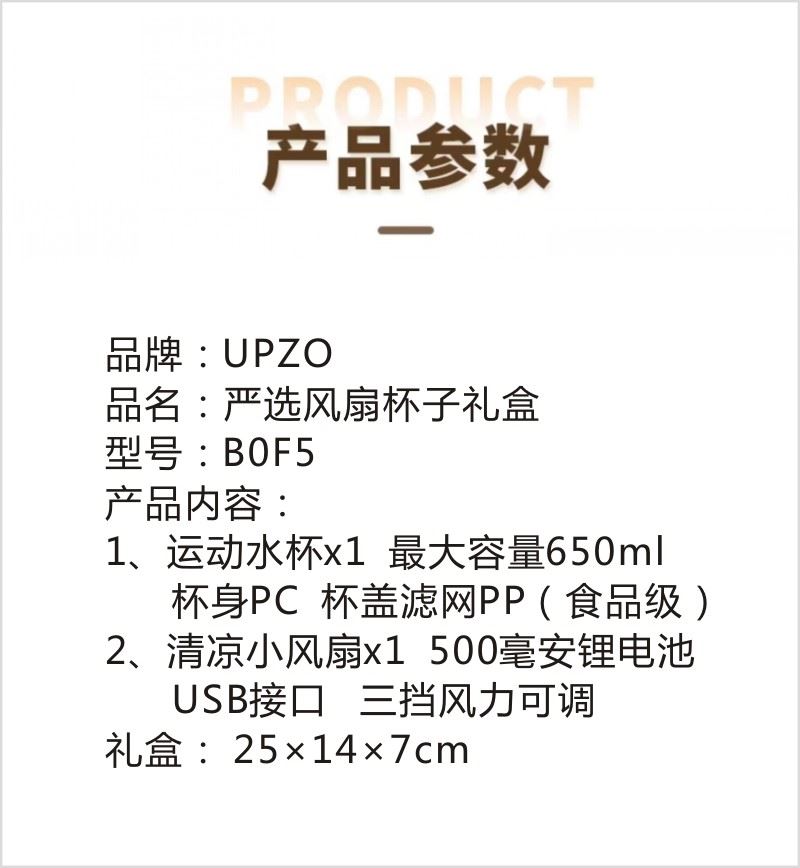 型号:B0F5 产品内容: 1、运动水杯*1 500毫升 (满杯容量650毫升) 杯身PC 杯盖滤网 PP (食品级材料) 2、清凉小风扇*1 500毫安锂电池 USB接口 (续航时间90分钟左右 三挡风力可调) 礼盒规格:25*14*7CM 清凉小风扇 500毫安 续航90分钟左右 风力三挡 运动水杯采用PC杯体 PP杯盖 可手提适中容量